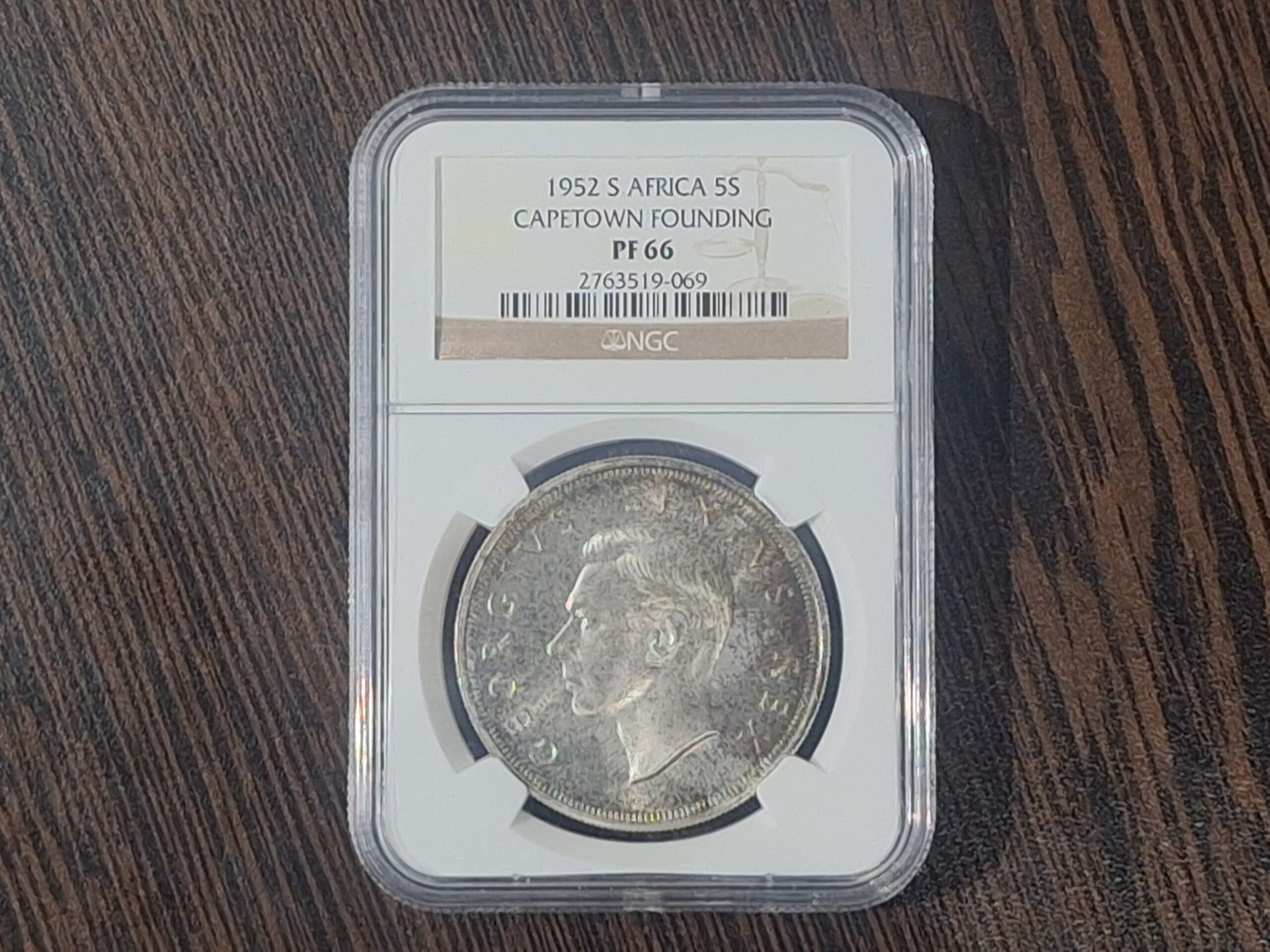 Commemorative 1952 South Africa 5 shillings “Cape Town Founding” crown, graded Proof 66 by NGC. Lovely George VI silver issue with sharp devices and attractive light toning over mirrored proof fields – a high-grade and desirable Union-era commemorative for the advanced South African collection.