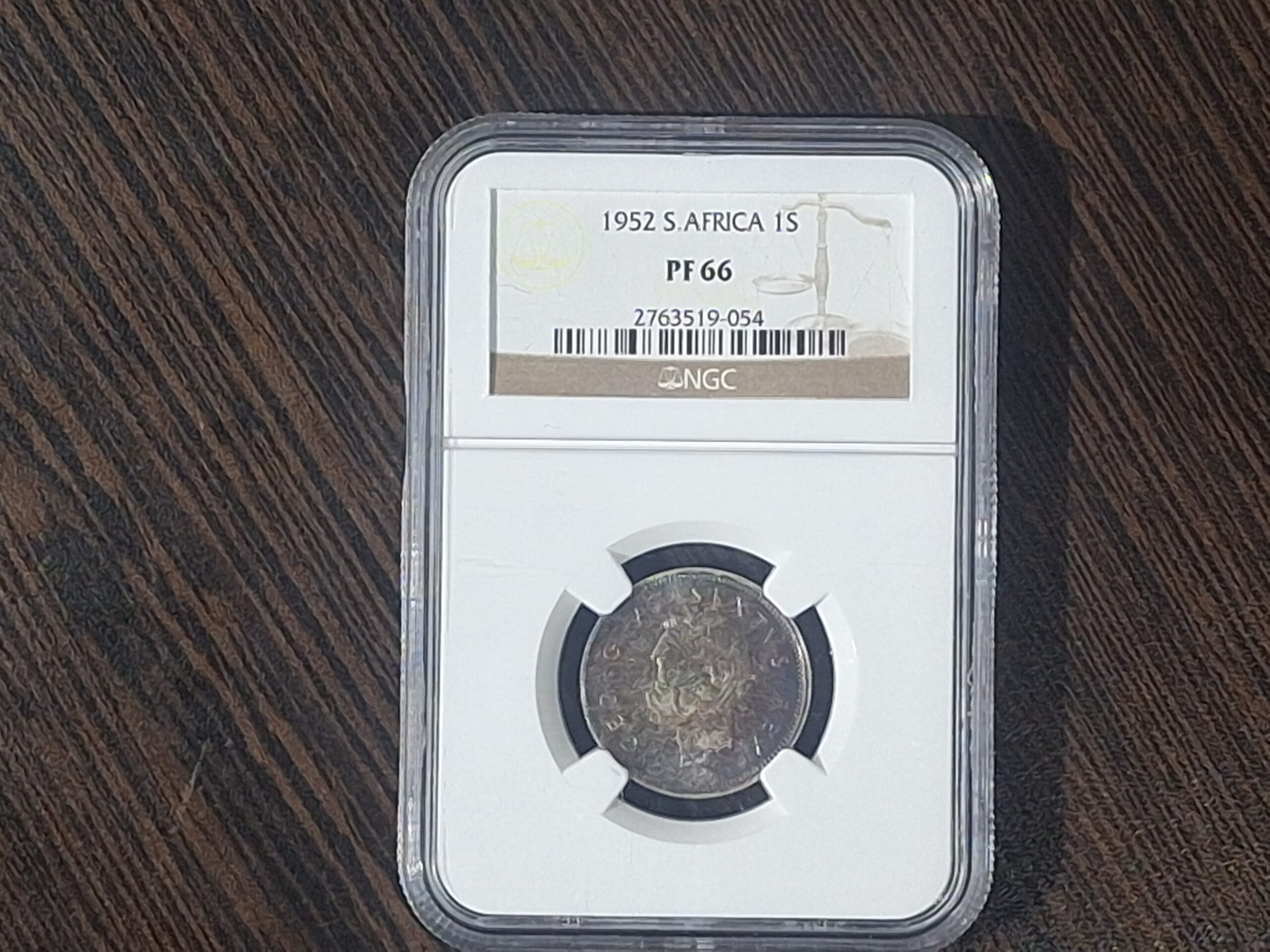 Gem 1952 South Africa 1-shilling, graded Proof 66 by NGC. Sharp George VI detail with attractive proof surfaces and light toning – a high-grade Union-era silver piece for the discerning South African collection.