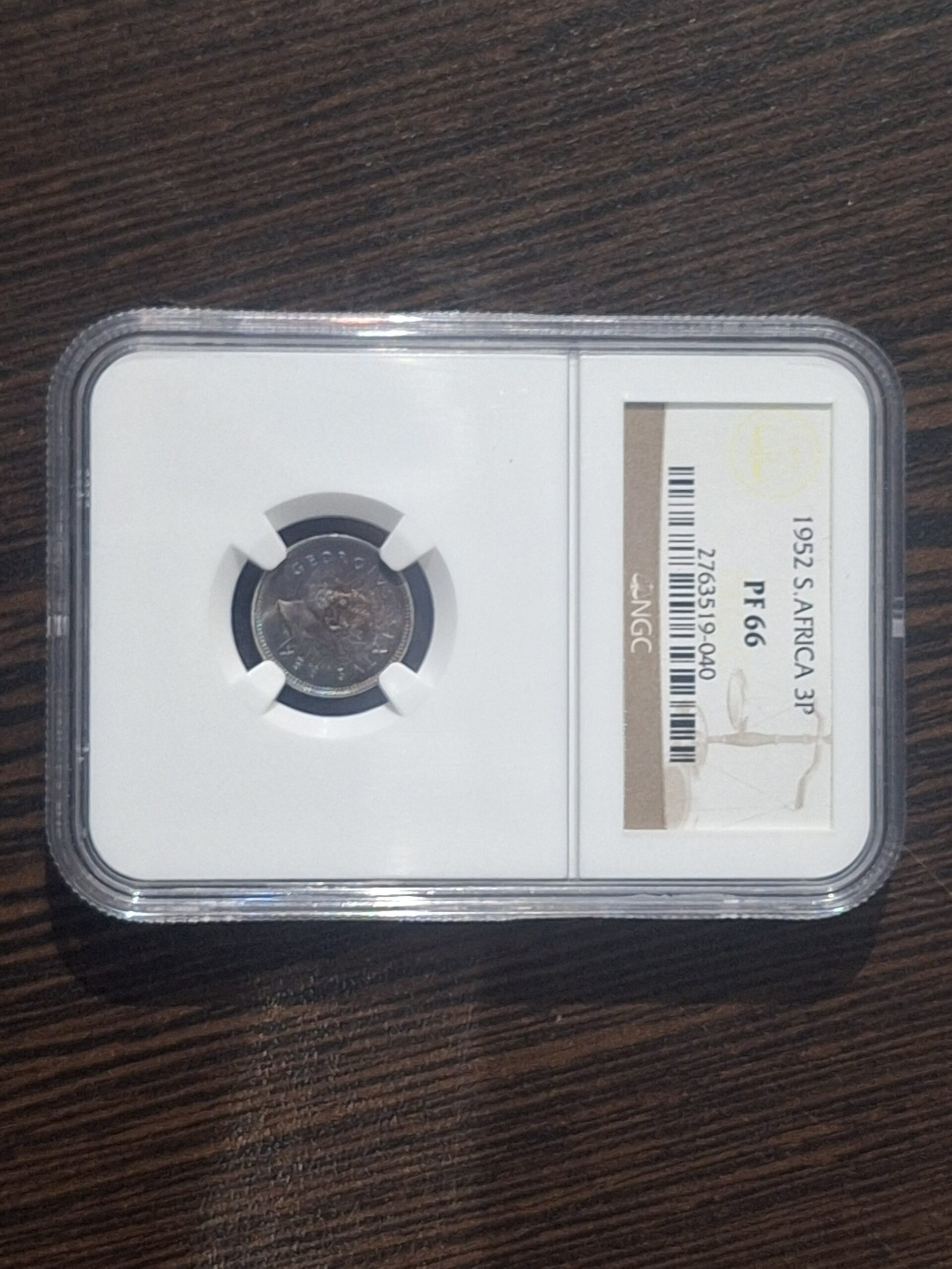 Choice 1952 South Africa 3 pence, graded Proof 66 by NGC. Crisp George VI detail with bright proof fields and light toning – a high-grade Union-era silver minor for the serious South African collection.