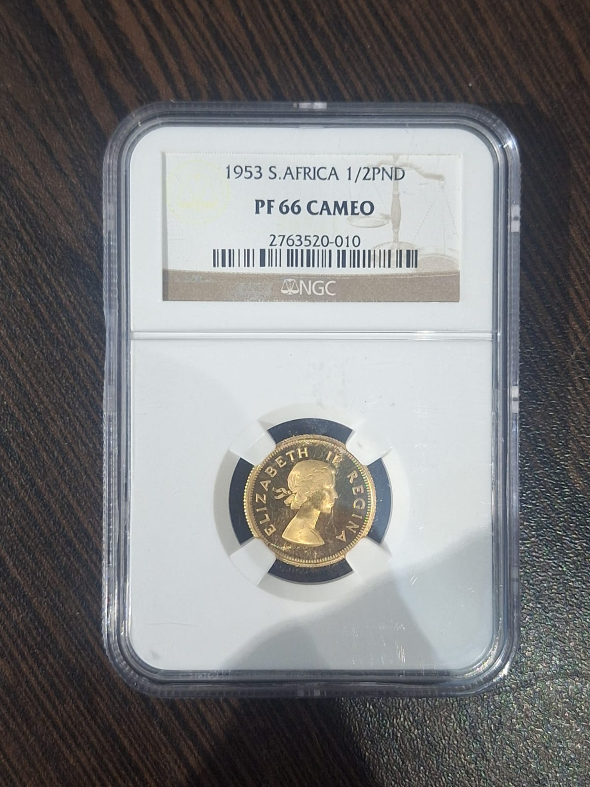 Early Elizabeth II gold proof half-pound, certified NGC PF 66 Cameo. Brilliant 22ct strike with frosted devices and mirrored fields, a premium-quality addition to a South African gold proof collection.
