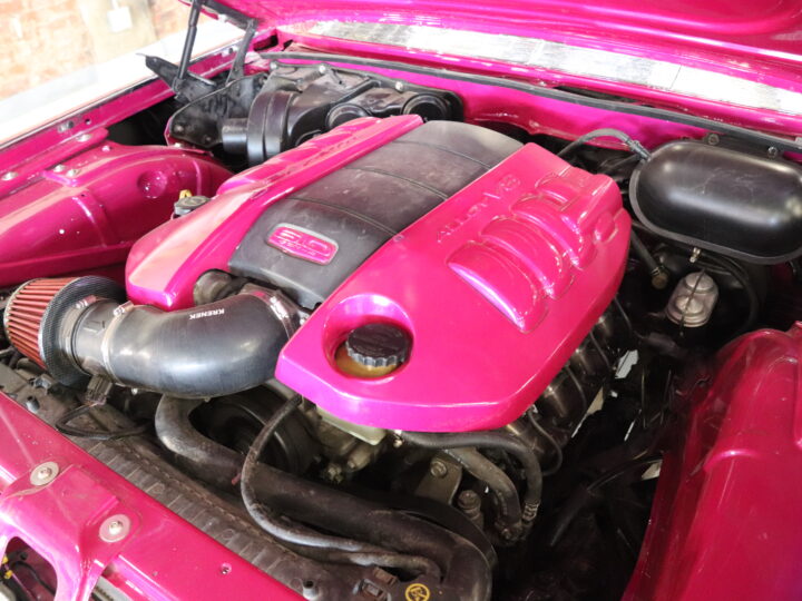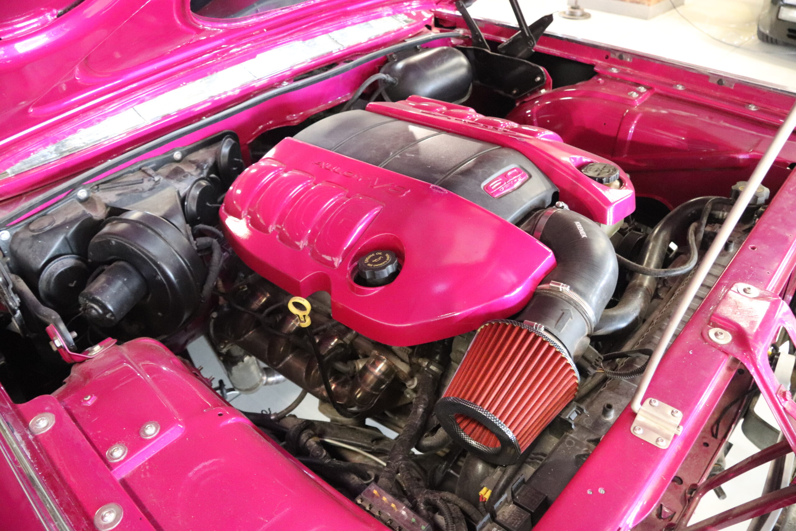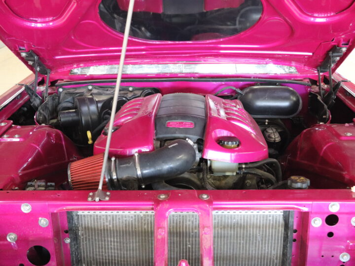 Visually, it’s a showpiece. The pink metallic paint with a blue pearl effect stands out in any crowd, and the adjustable stance/ride system lets you dial in the perfect look.