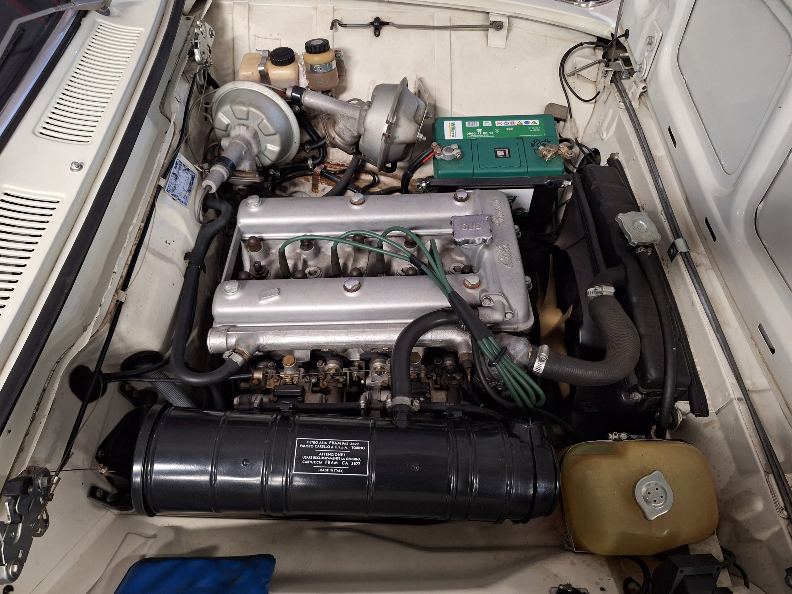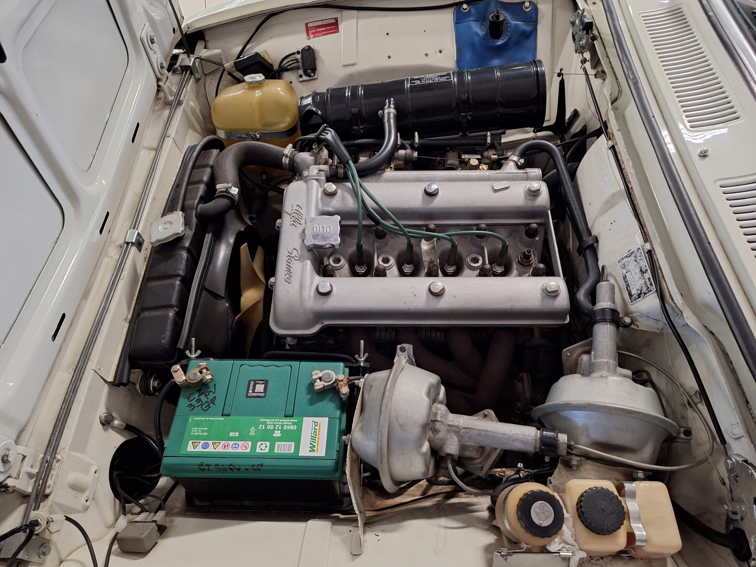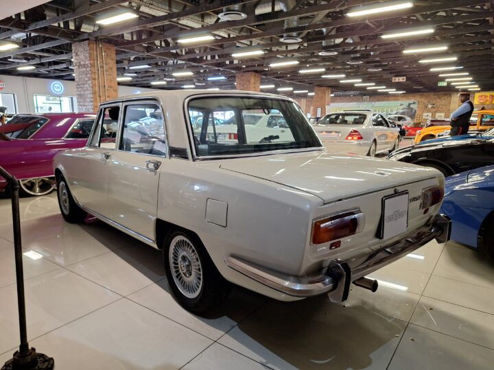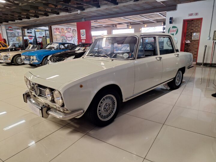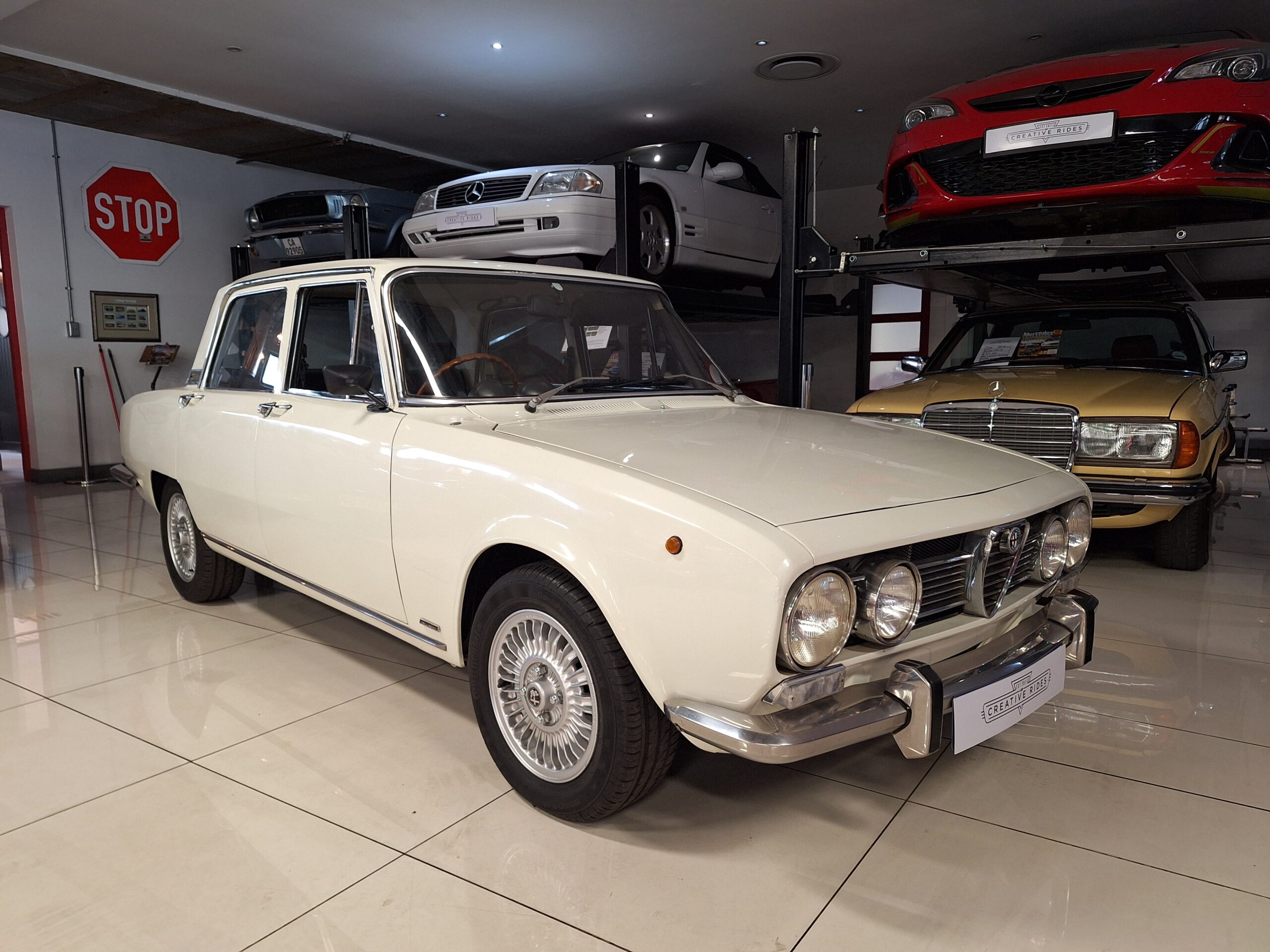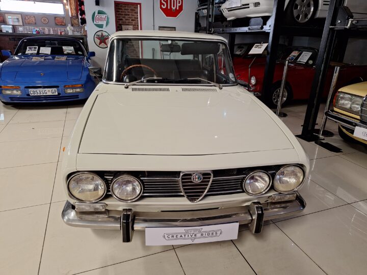 This 1972 Alfa Romeo Berlina is a good representation of the model, offering a blend of vintage charm and iconic Italian engineering. The car features an older white paint job that still holds its own, adding a touch of character and authenticity to its overall presence.
