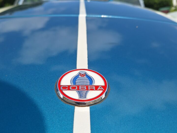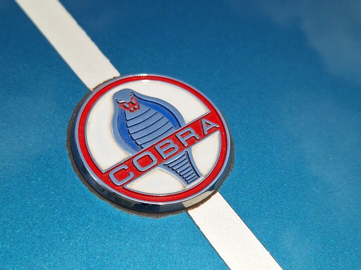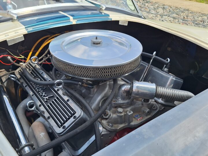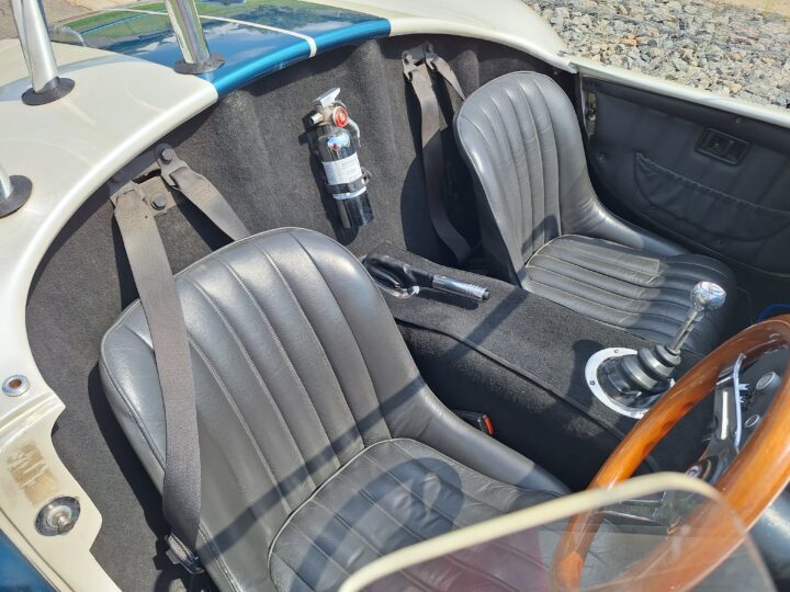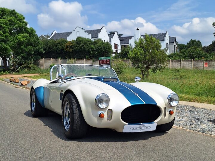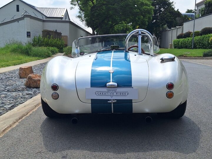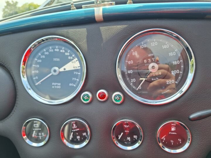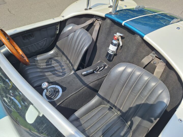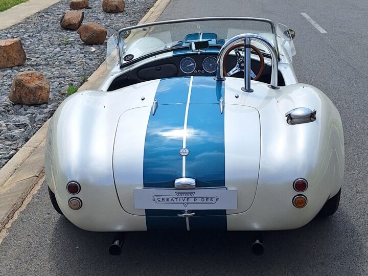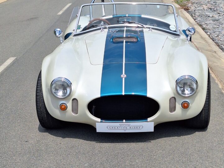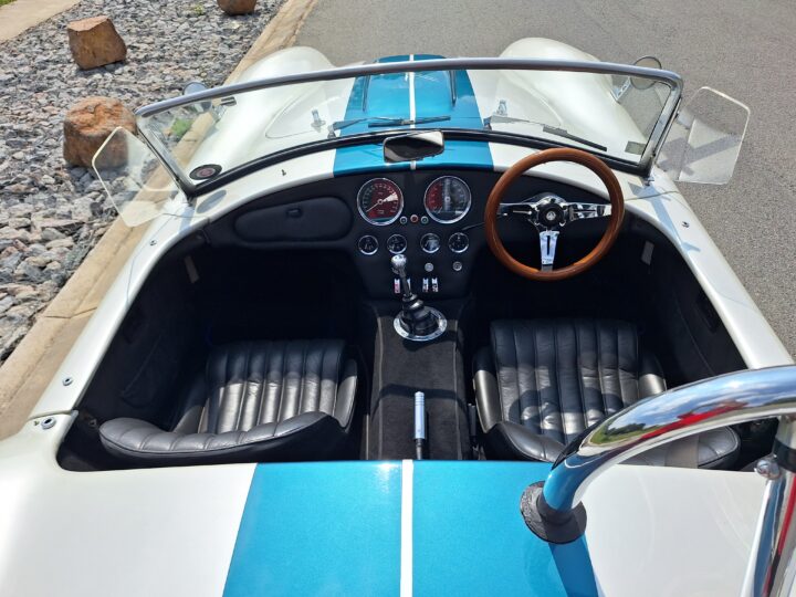 The cabin keeps the authentic Cobra vibe, featuring Jaguar instruments, additional auxiliary gauges, and a wood-rim steering wheel. Finished in pearl white with blue striping, it sits on 15-inch chrome steel wheels with Halibrand-style inserts and knock-off spinners — Kit Car Centre’s clever period-correct nod to the original Cobras’ iconic wheel style.
