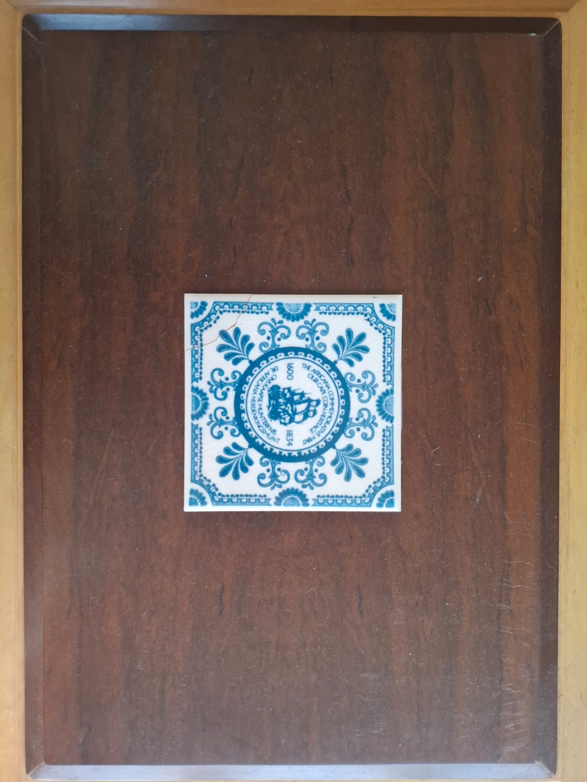 At the centre is a blue-and-white ceramic tile with a detailed sailing ship surrounded by ornate scrollwork. The wording around the border reads: