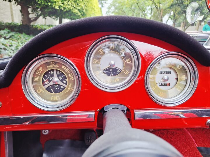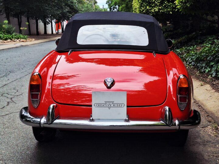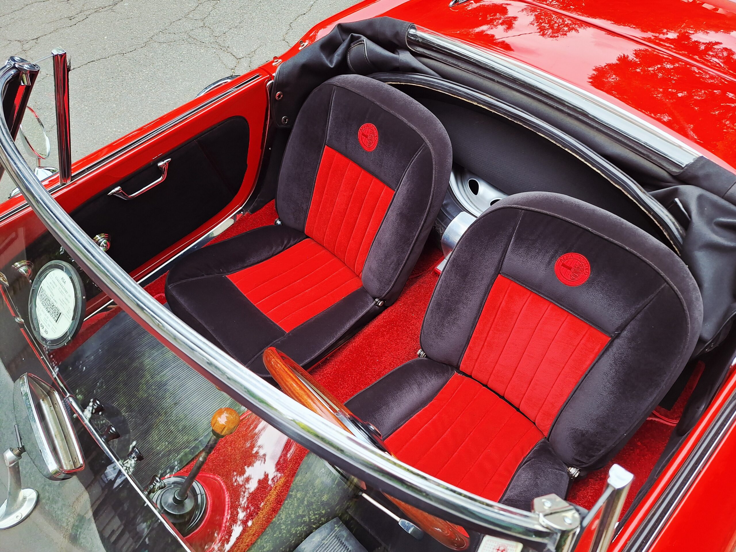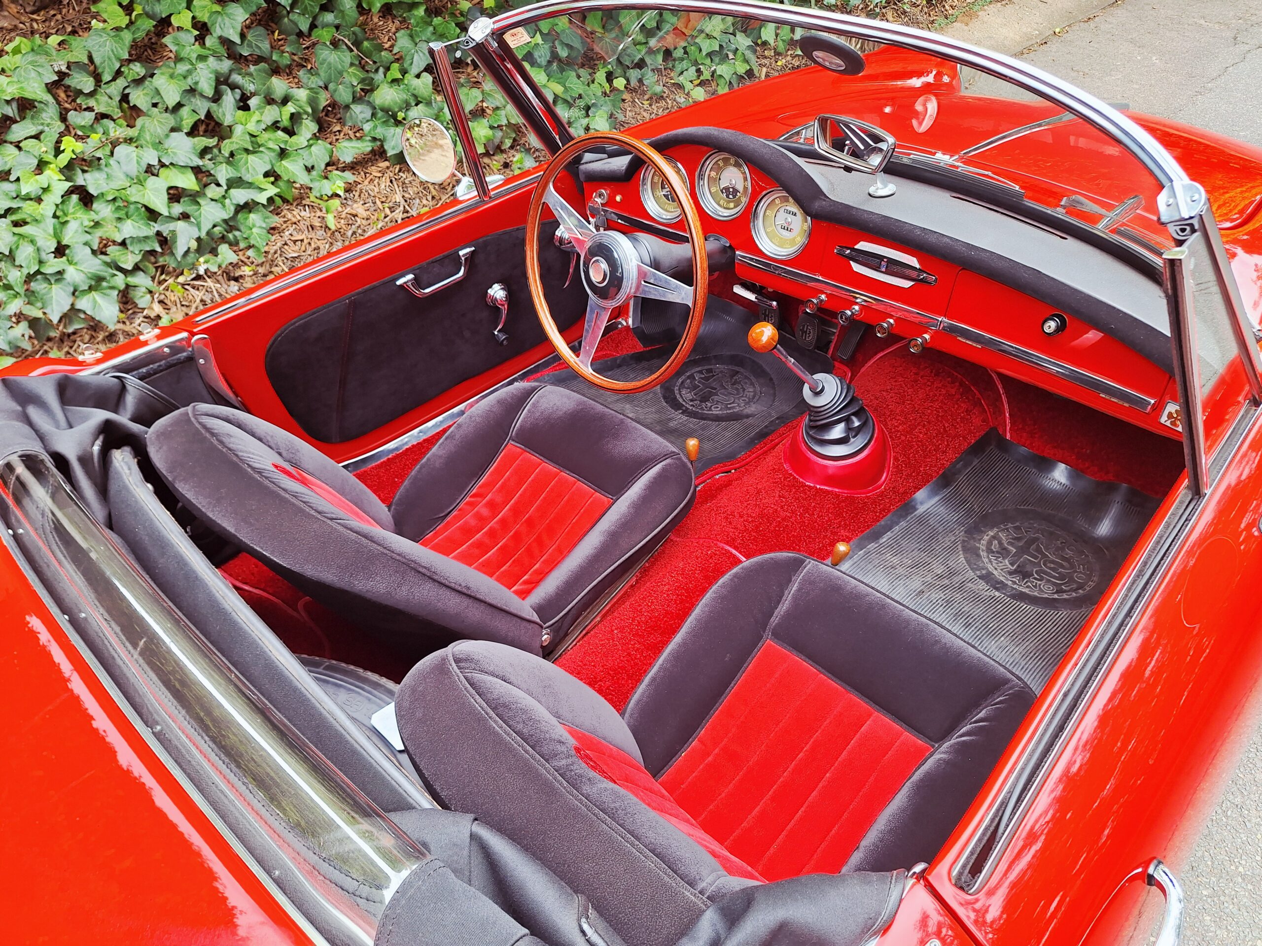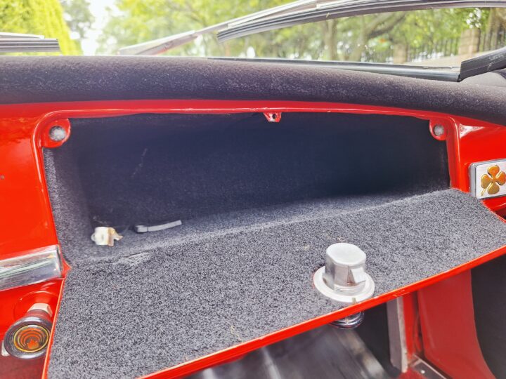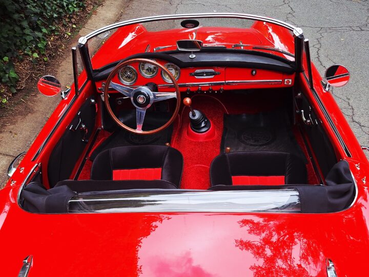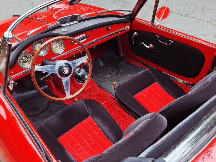 Inside, the cabin has been tastefully finished in a custom two-tone black and red Alcantara interior, complemented by a wood-rimmed steering wheel and a new soft top. It is a cabin that feels both classic and inviting, the kind of place that reminds you why Italian sports cars of this era remain so desirable.