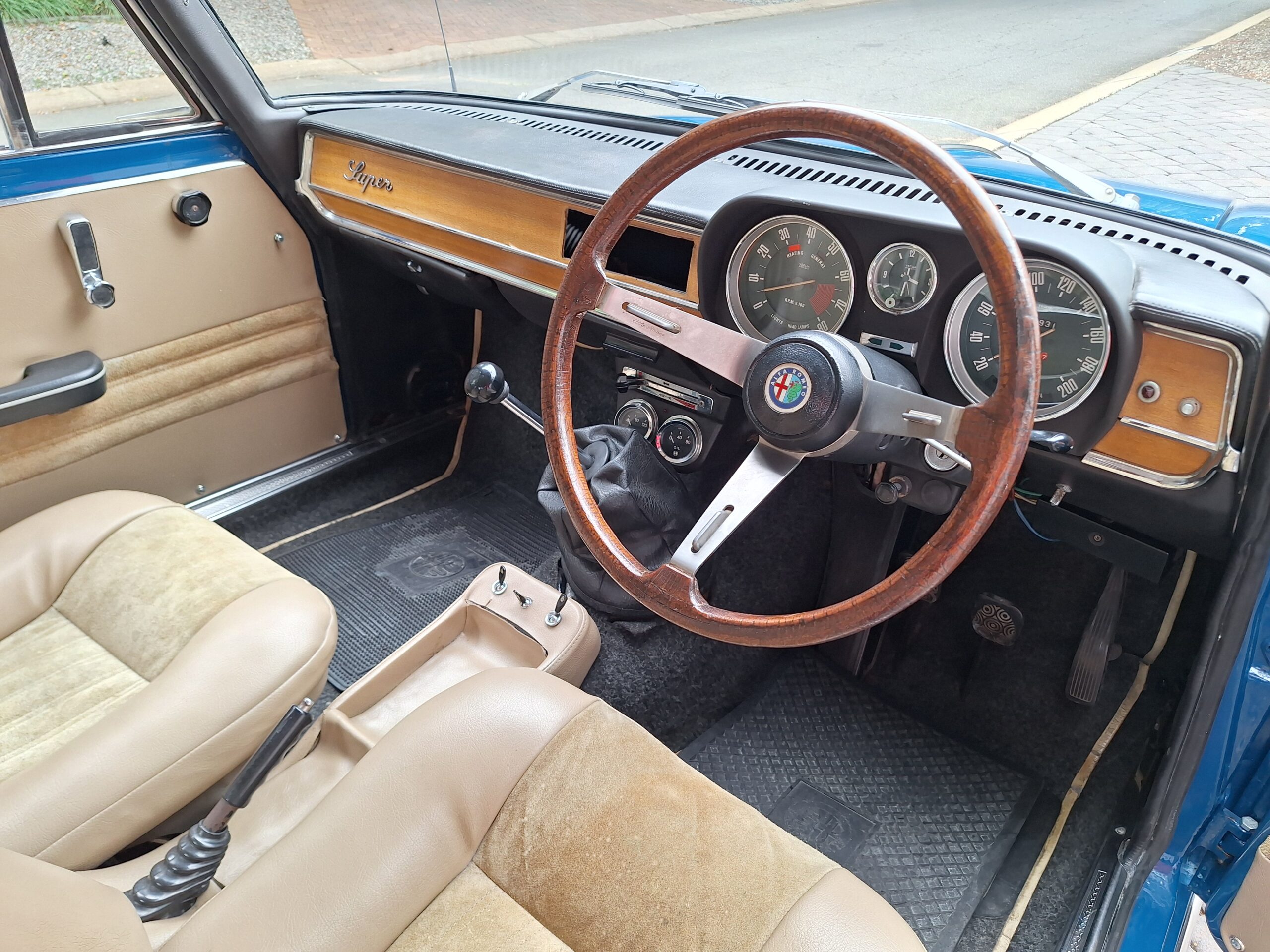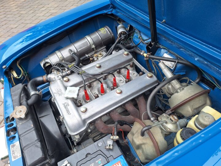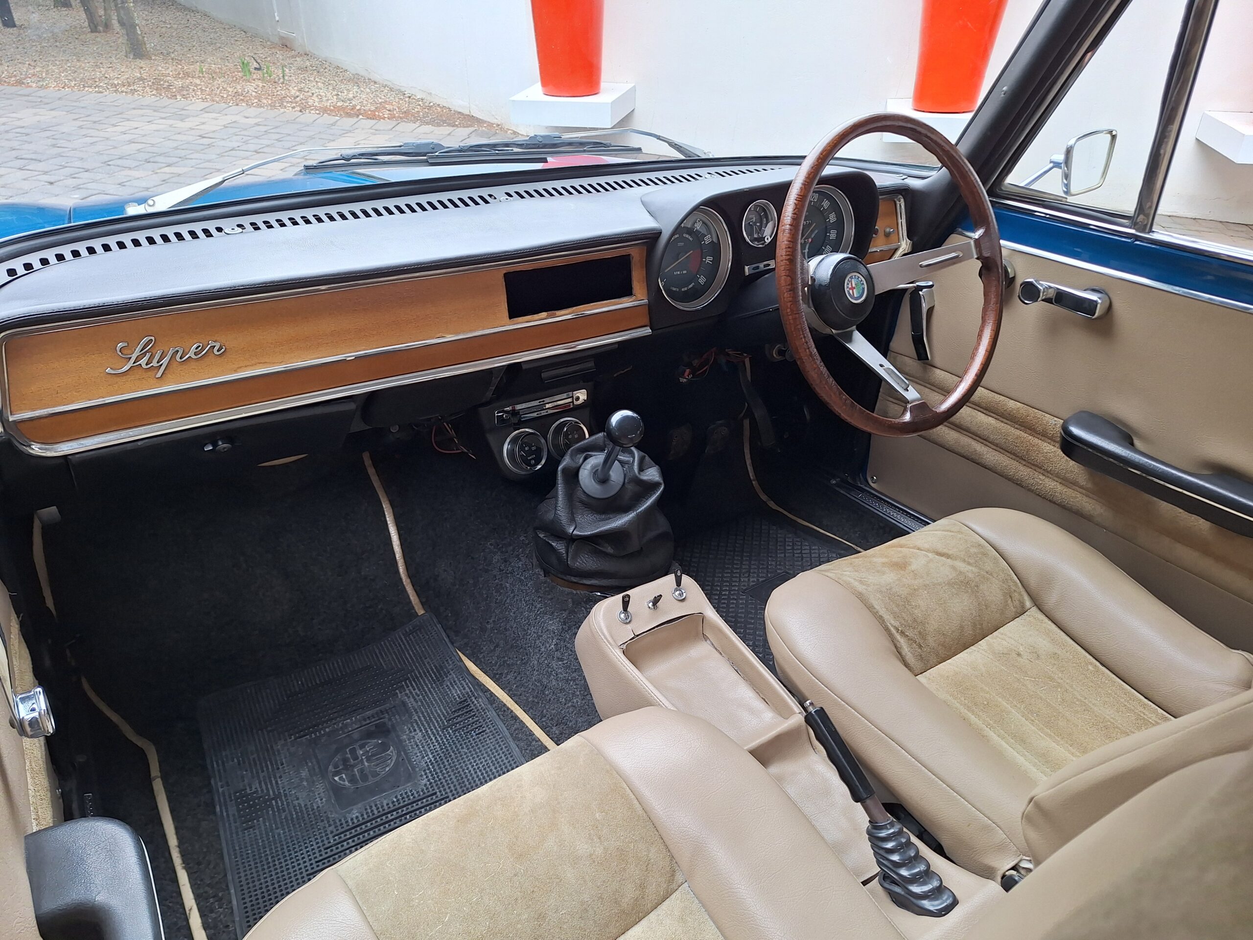 The exterior was resprayed approximately three months ago in a vibrant blue that really suits the sharp Giulia lines, while the brightwork and classic alloys complete the period look. Inside, the cabin is largely unrestored and honest, with tan seats featuring Alcantara centres that show age but still carry plenty of patina and charm. The radio is currently missing, leaving a blank canvas for the next owner to fit their preferred unit.