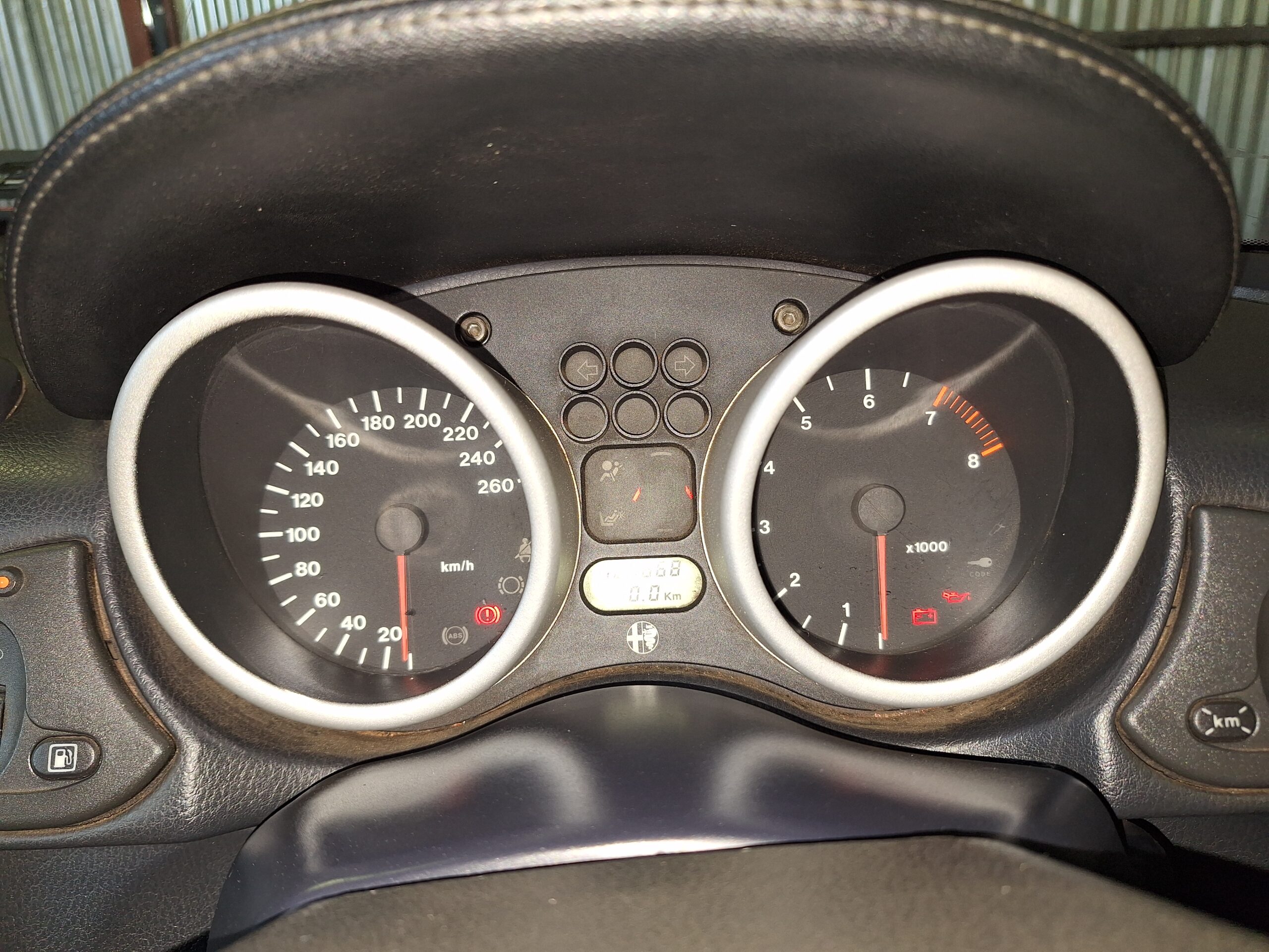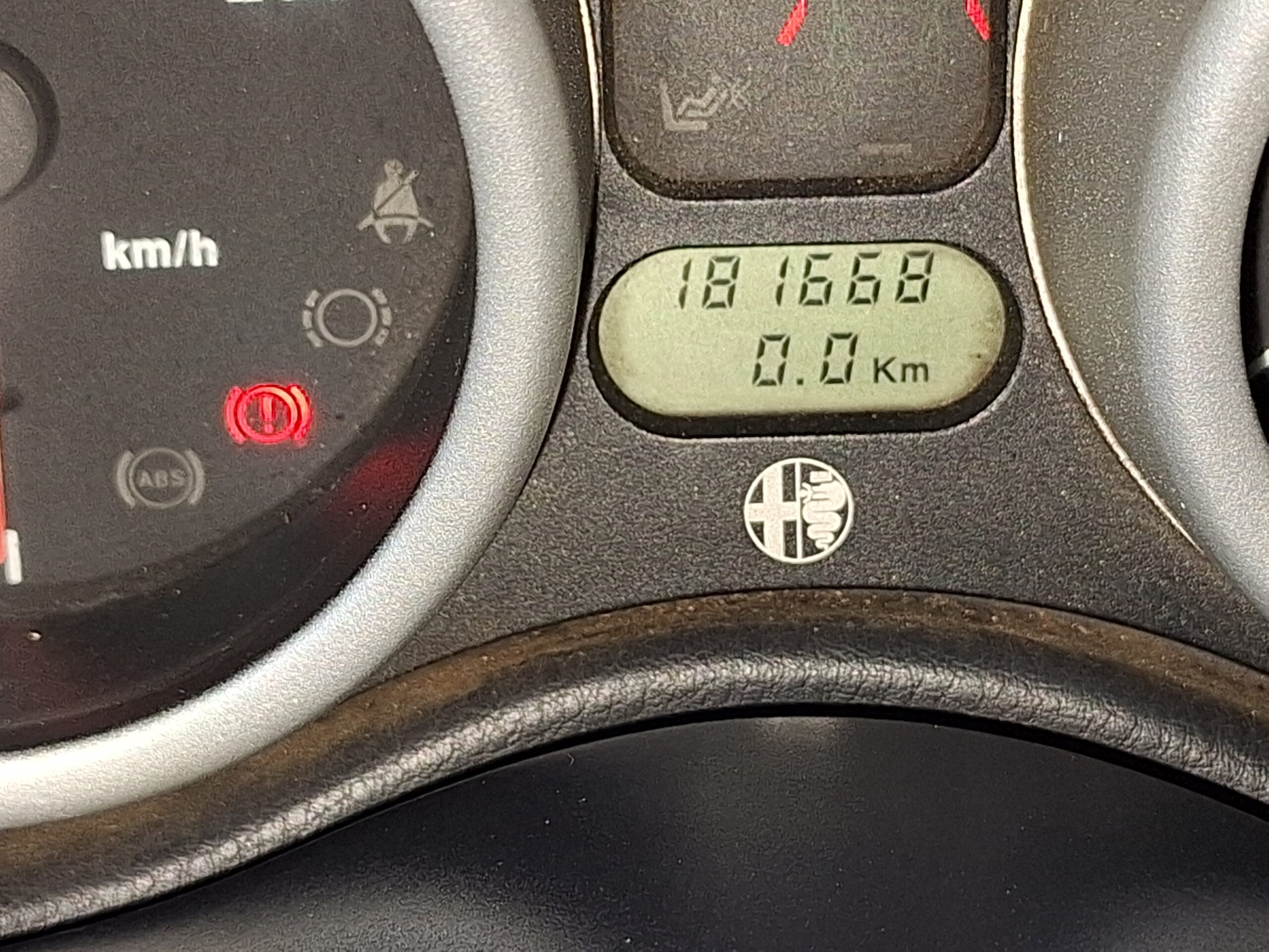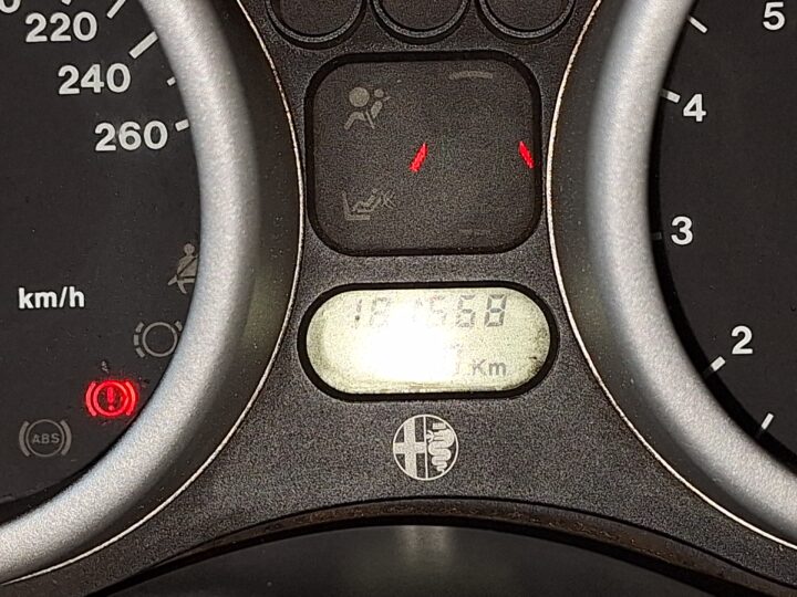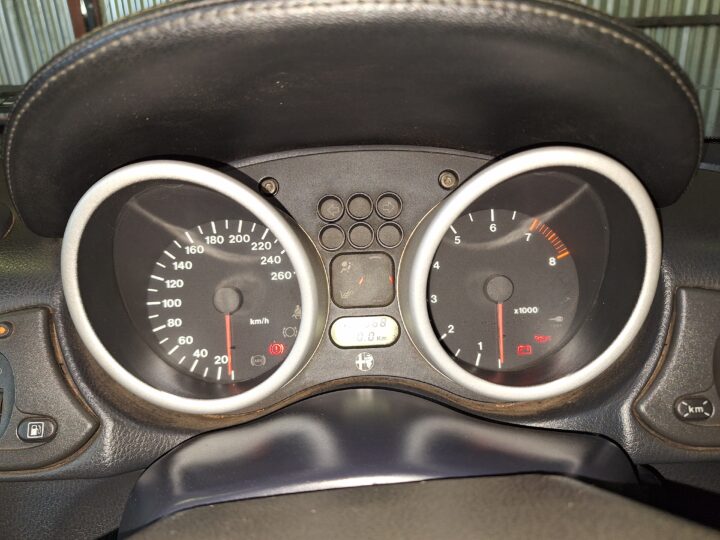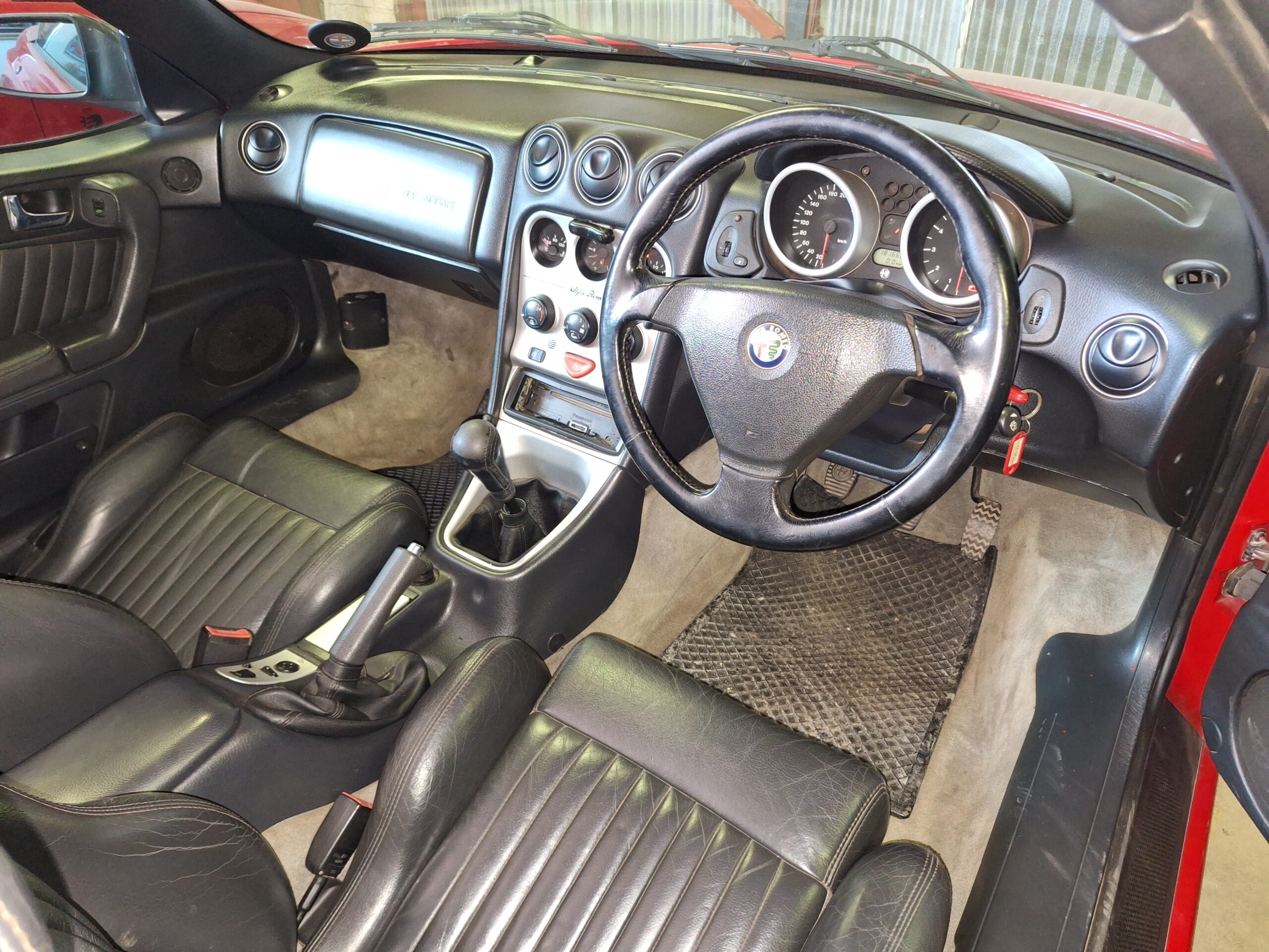 This Alfa Romeo Spider Twin Spark is a front-wheel-drive Pininfarina-styled roadster finished in classic Alfa red with a black interior and black soft top. It is powered by a 2.0-litre transverse four-cylinder Twin Spark engine paired with a 5-speed manual gearbox, a combination that gives these cars their lively, rev-happy character. The odometer shows 181 668 km indicated at the time of cataloguing.