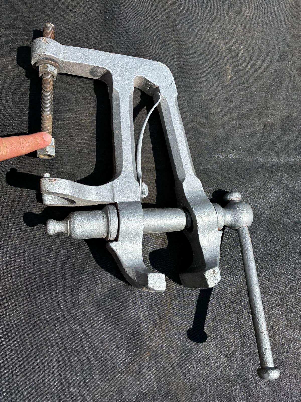 A scarce and unusually designed antique table-mount vice, still retaining its original spring and operating smoothly. This piece showcases early engineering craftsmanship, with a distinctive mounting style not often seen in modern vices.