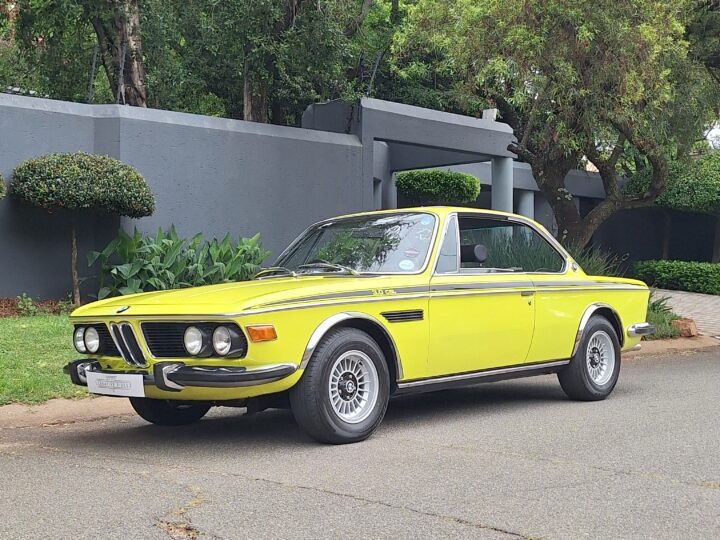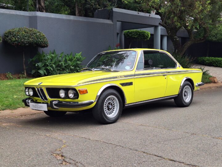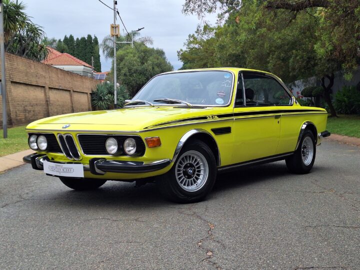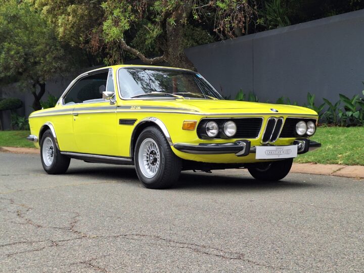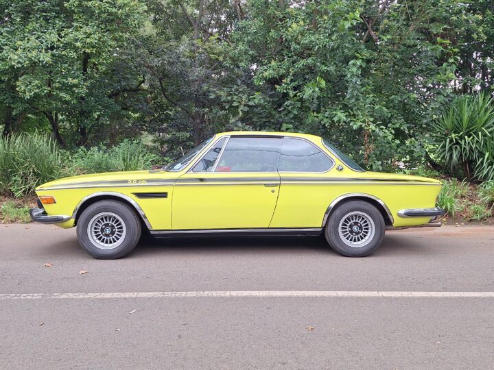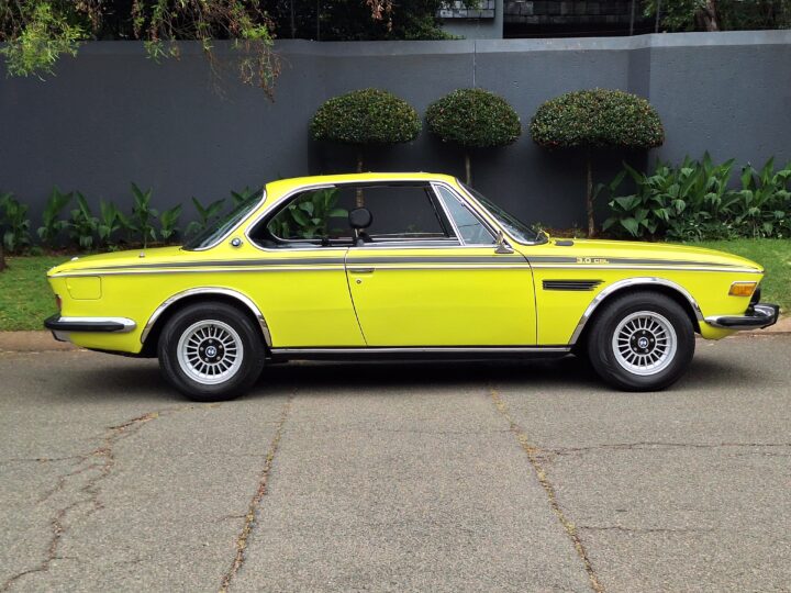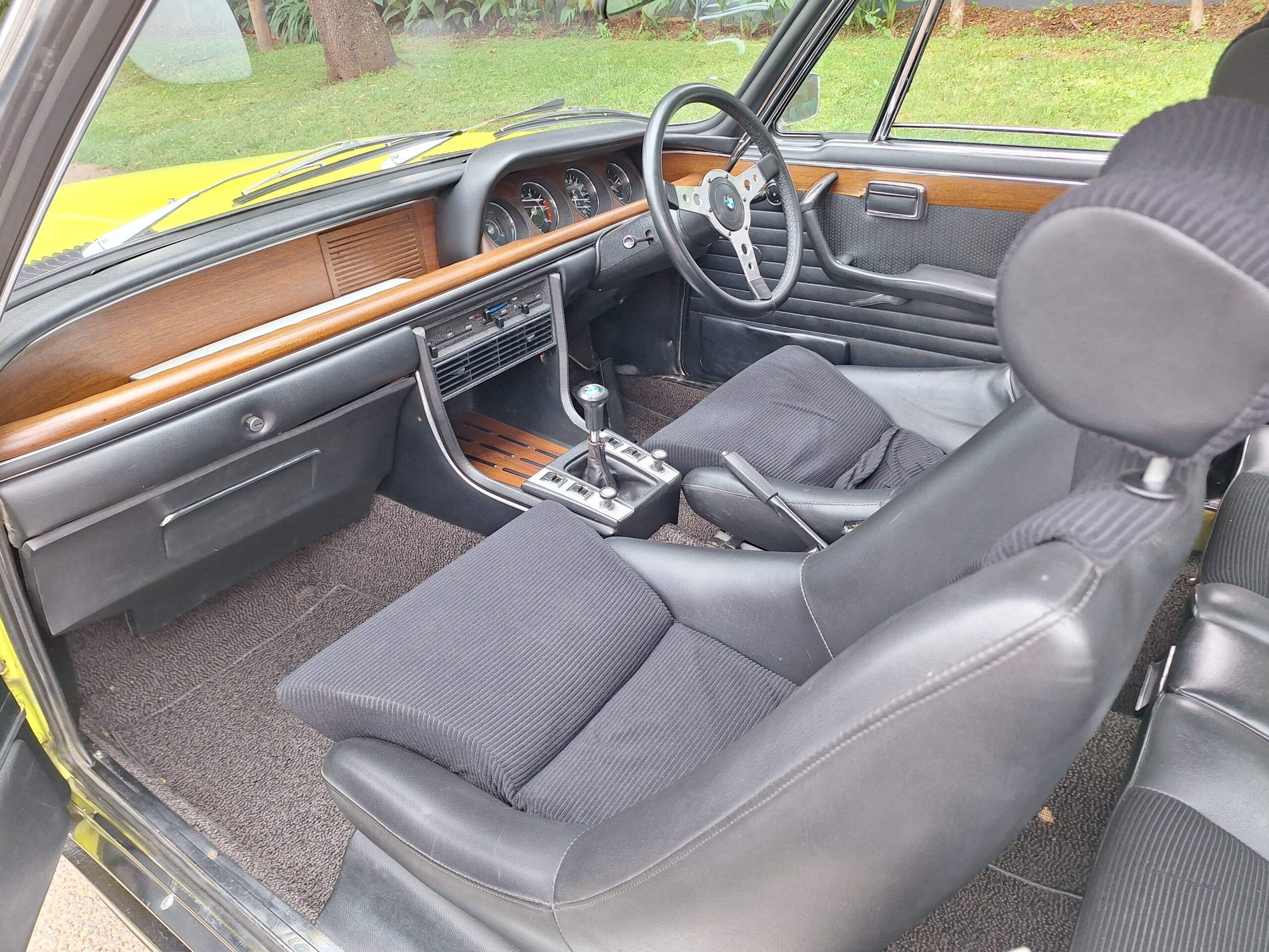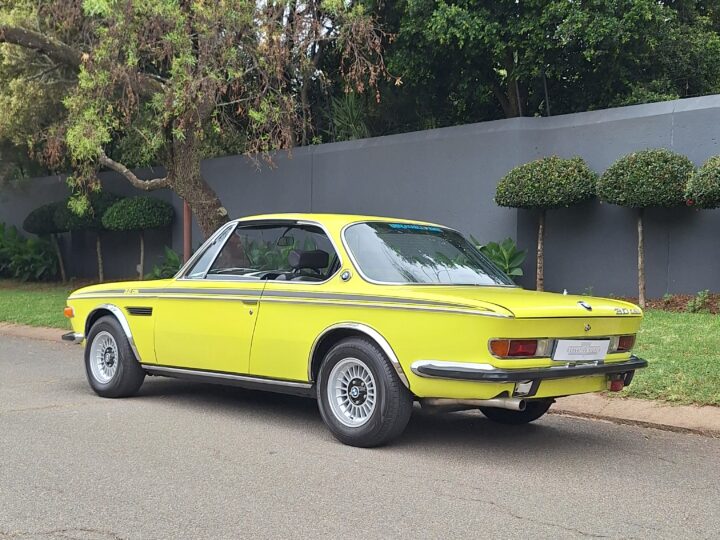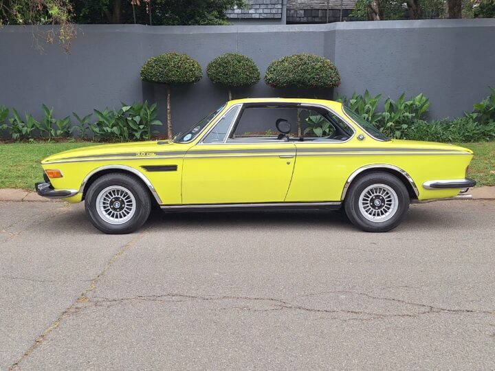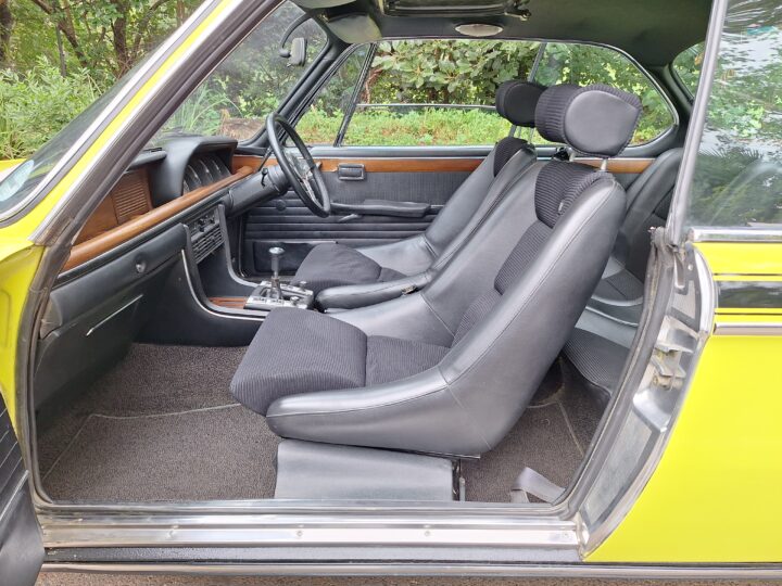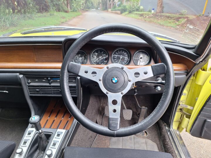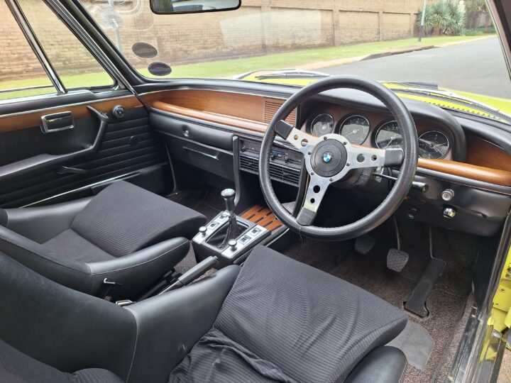 This example is finished in its factory Golf Yellow with the signature CSL black side stripes, riding on Alpina 14-inch alloy wheels. Inside you’ll find genuine Scheel bucket seats, a Mountney 3-spoke steering wheel, and classic woodgrain trim that keeps the grand touring vibe intact.