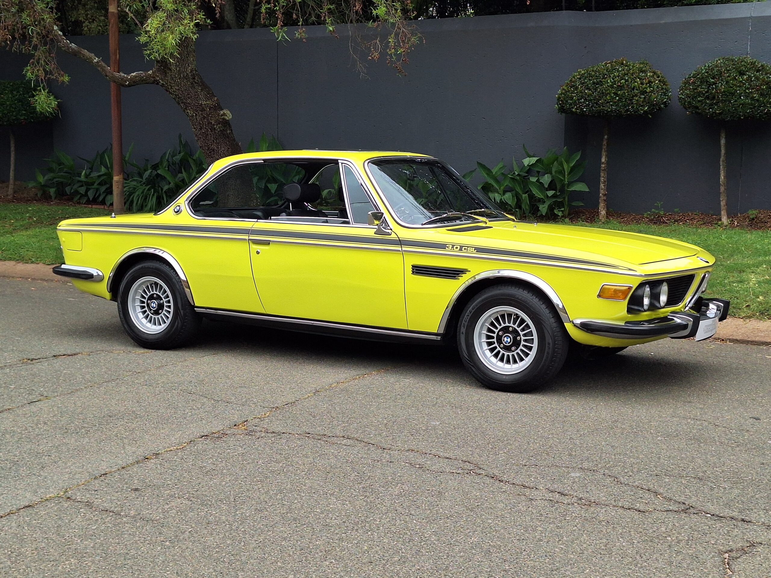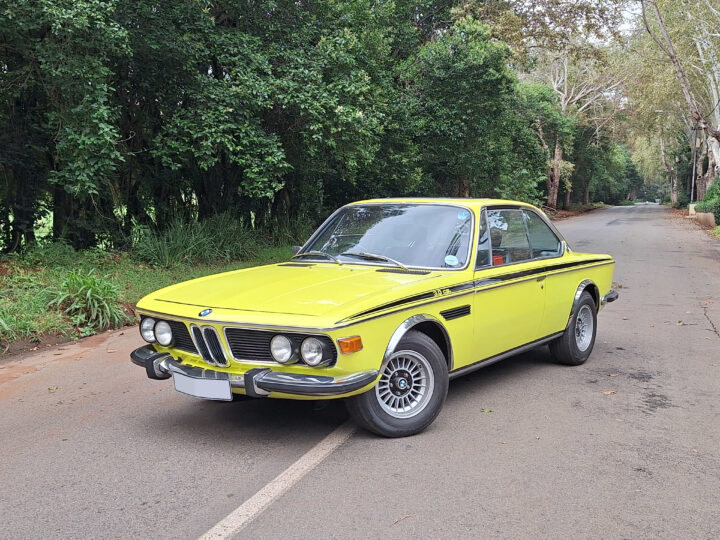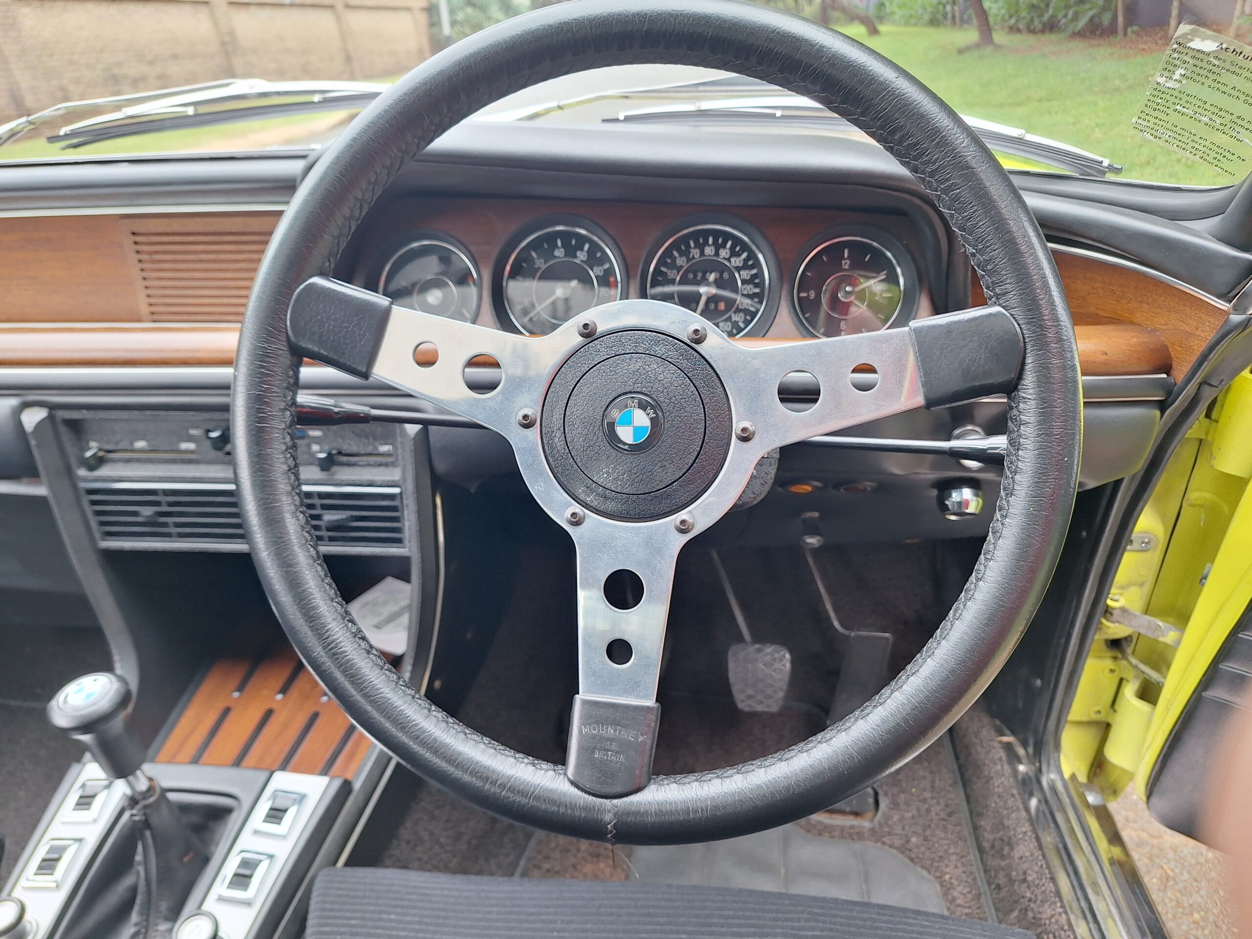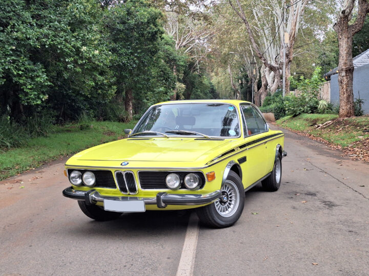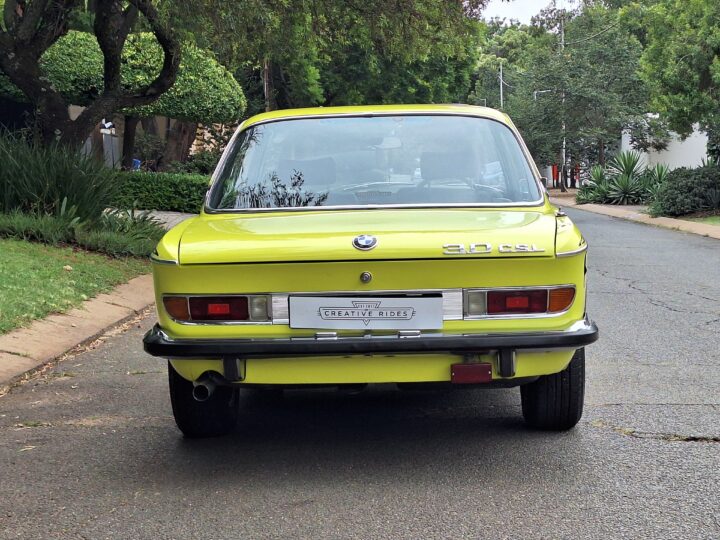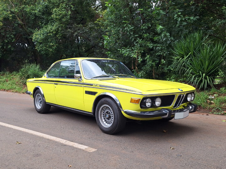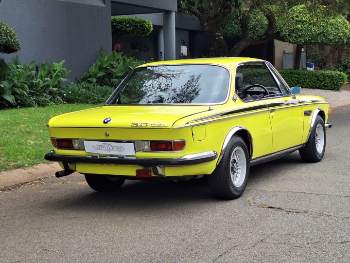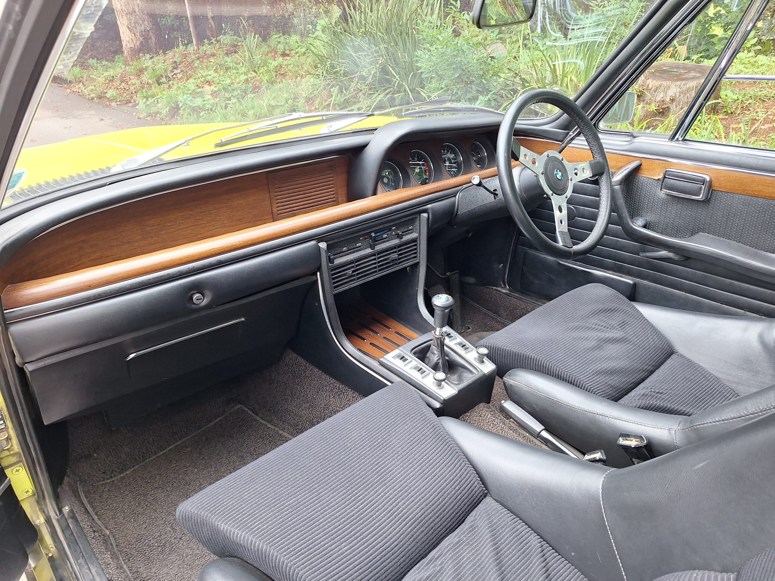 This example is finished in its factory Golf Yellow with the signature CSL black side stripes, riding on Alpina 14-inch alloy wheels. Inside you’ll find genuine Scheel bucket seats, a Mountney 3-spoke steering wheel, and classic woodgrain trim that keeps the grand touring vibe intact.