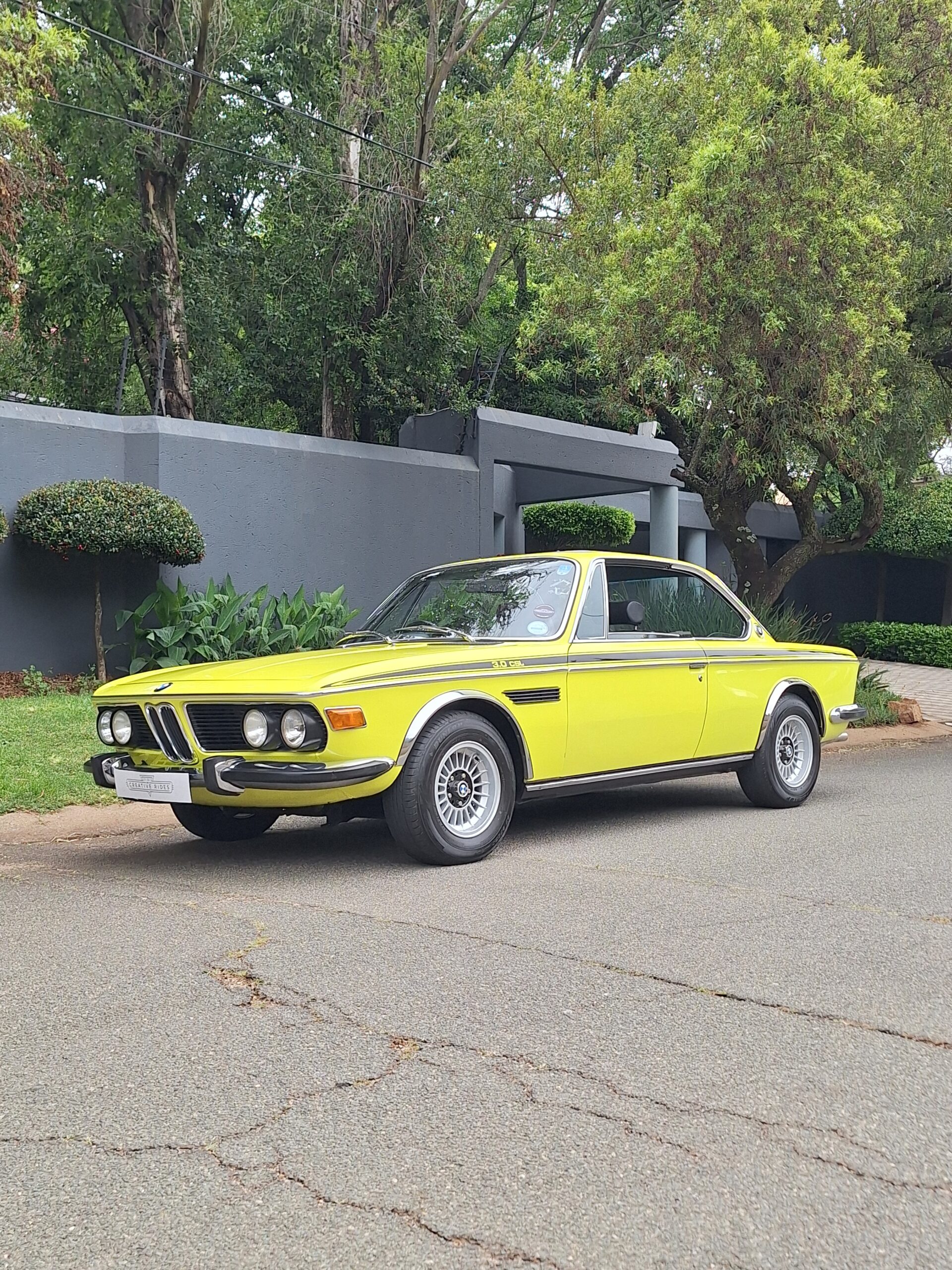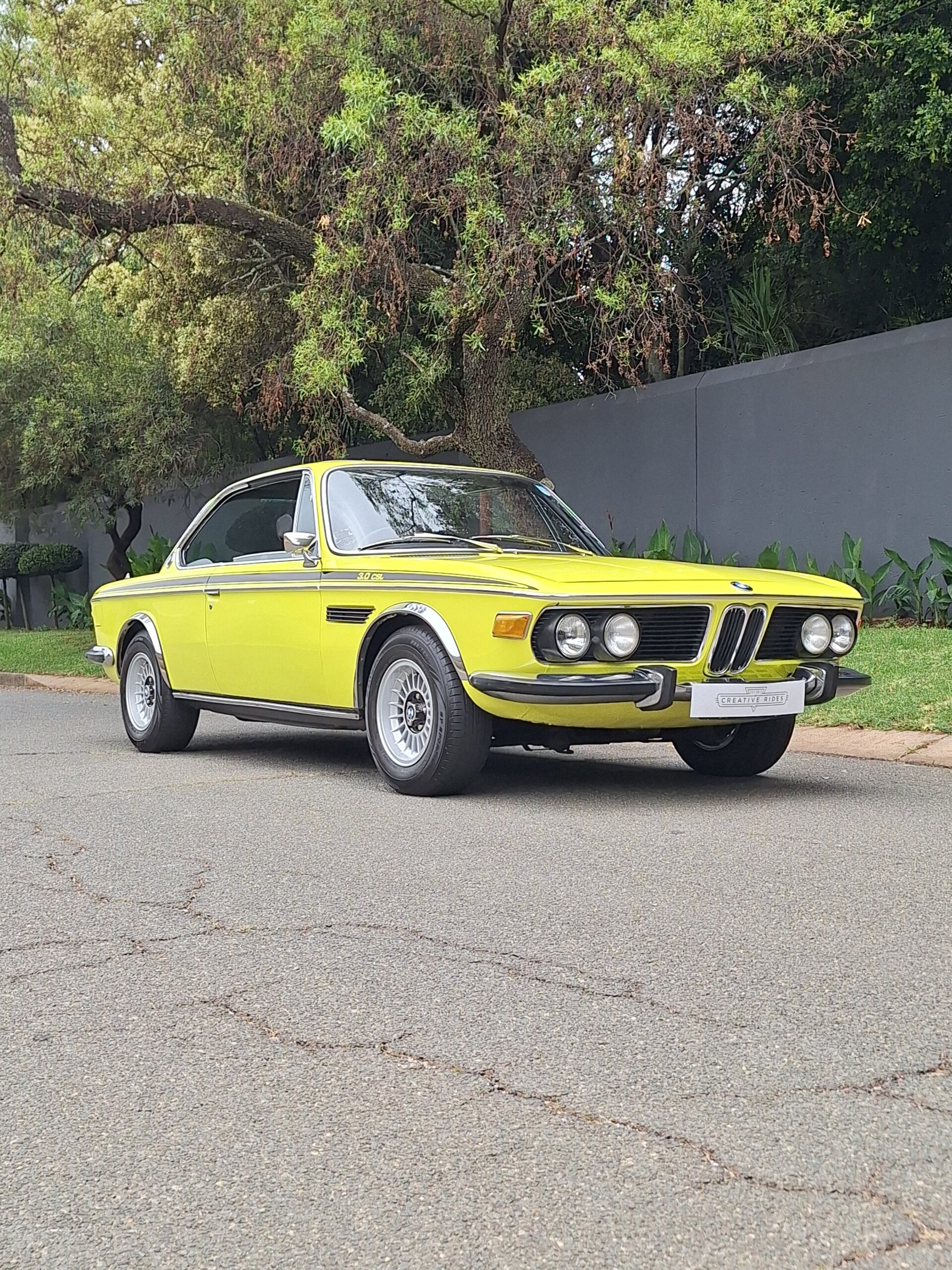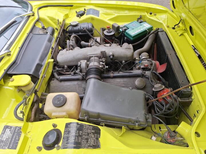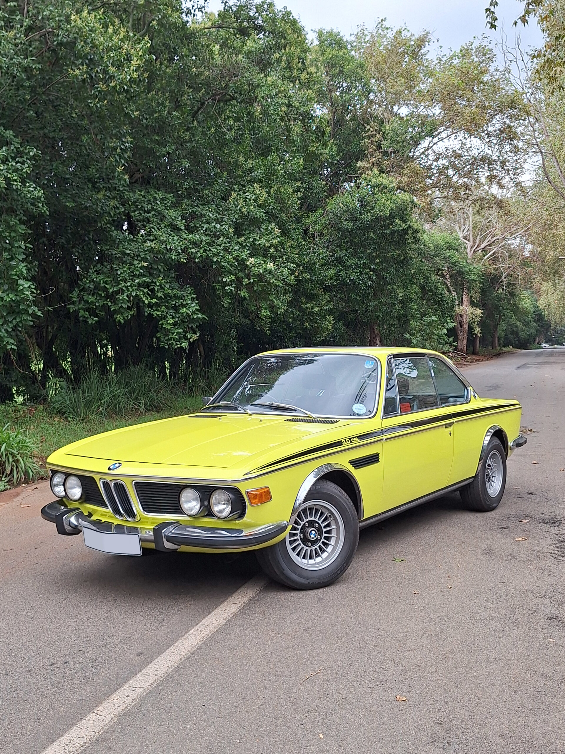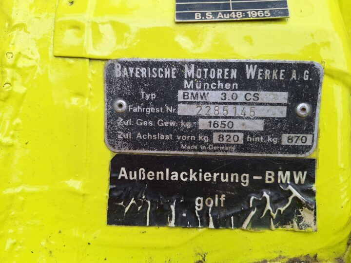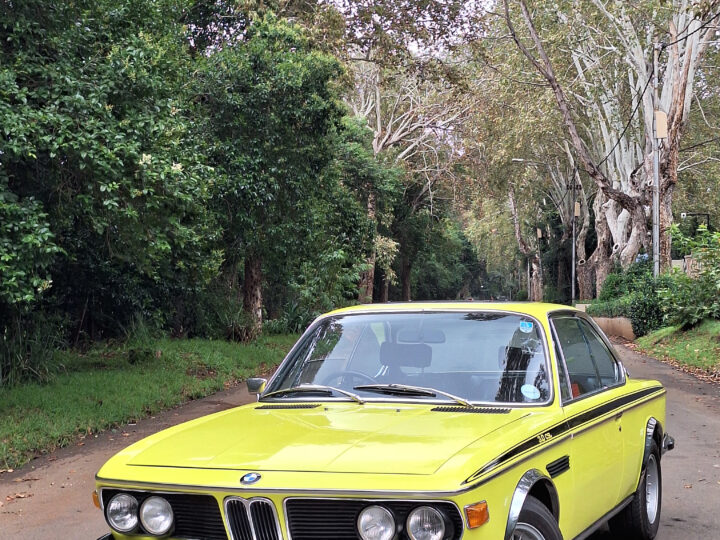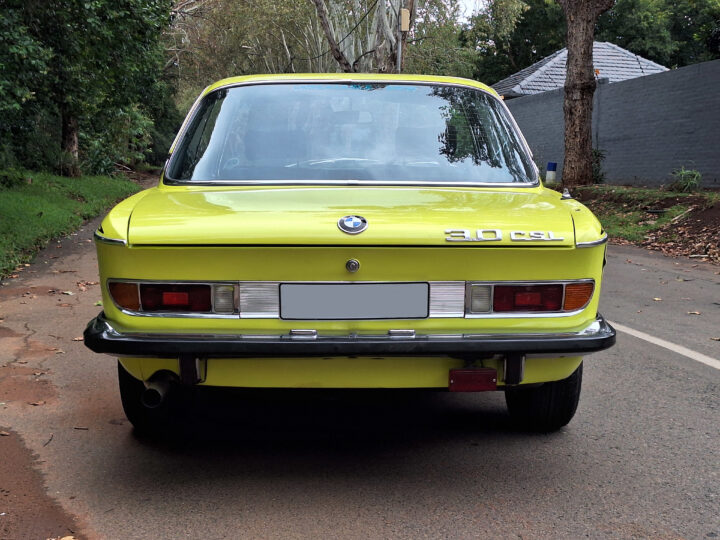 This example is finished in its factory Golf Yellow with the signature CSL black side stripes, riding on Alpina 14-inch alloy wheels. Inside you’ll find genuine Scheel bucket seats, a Mountney 3-spoke steering wheel, and classic woodgrain trim that keeps the grand touring vibe intact.