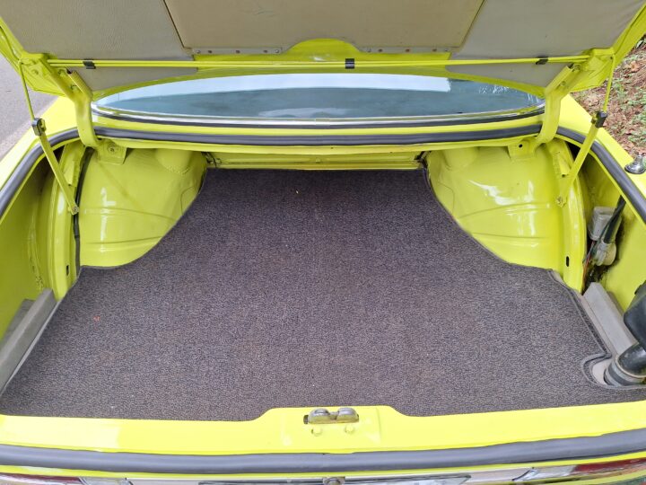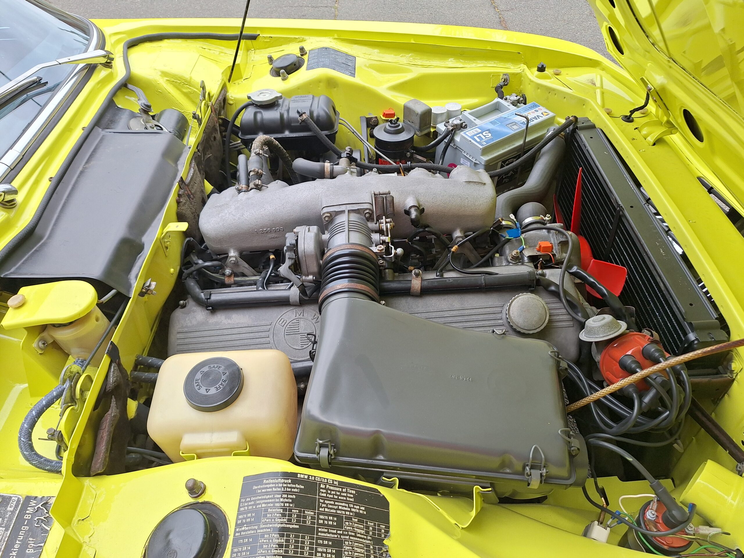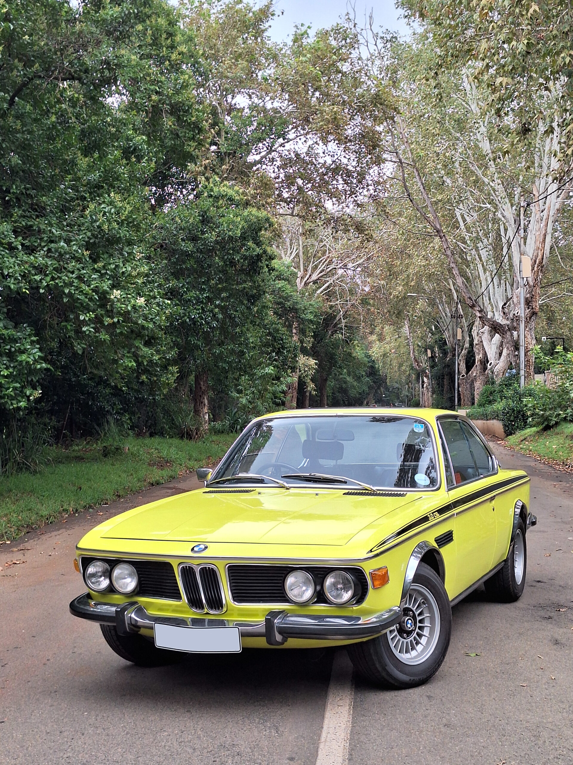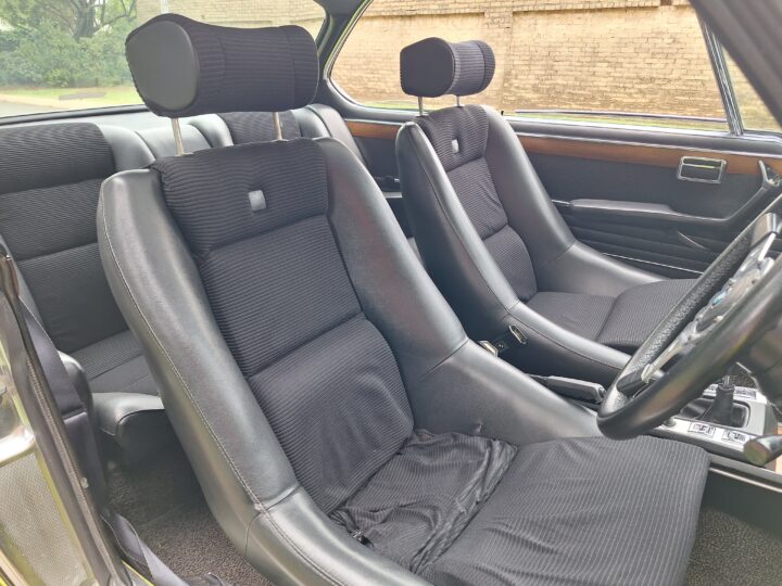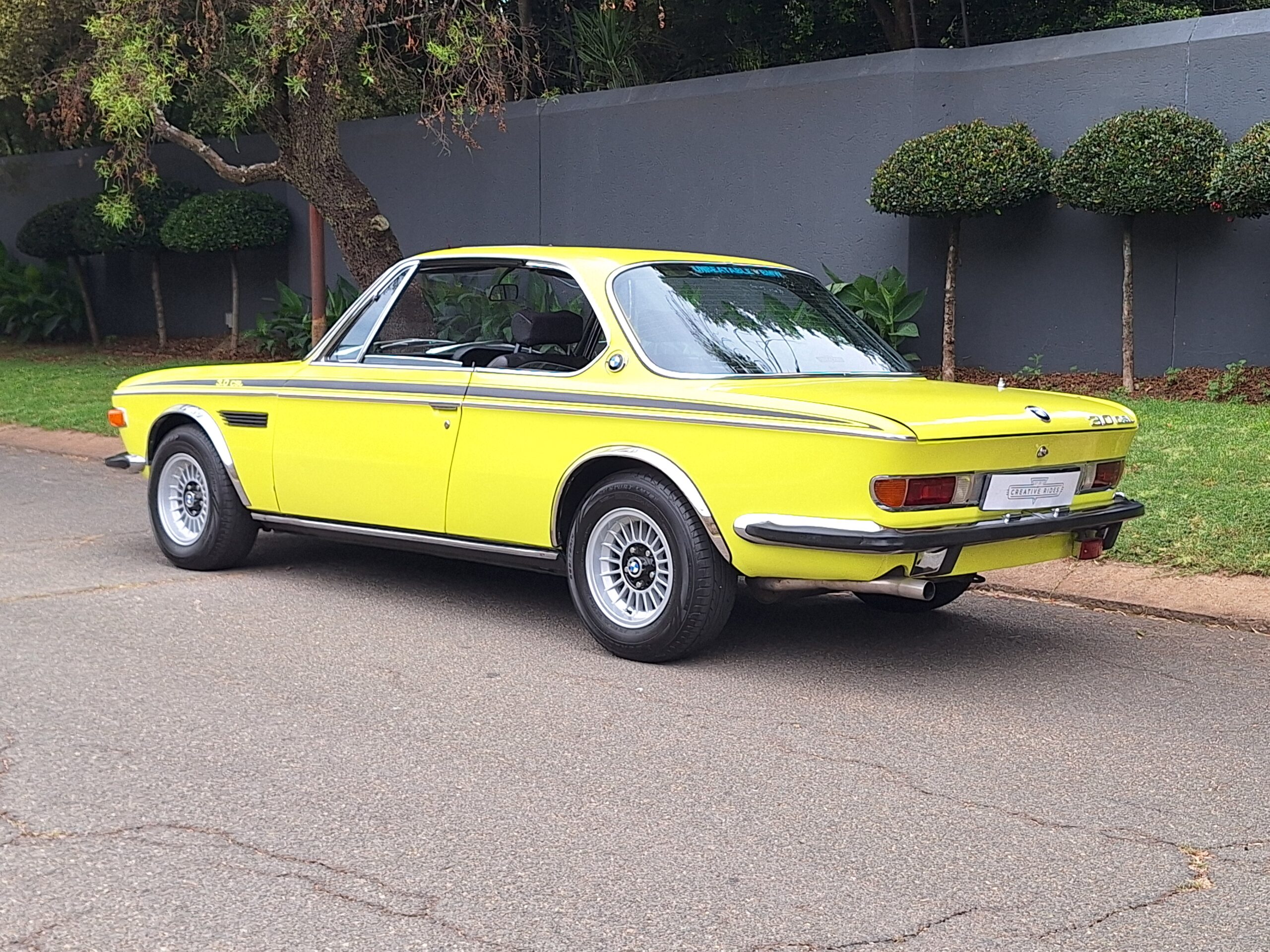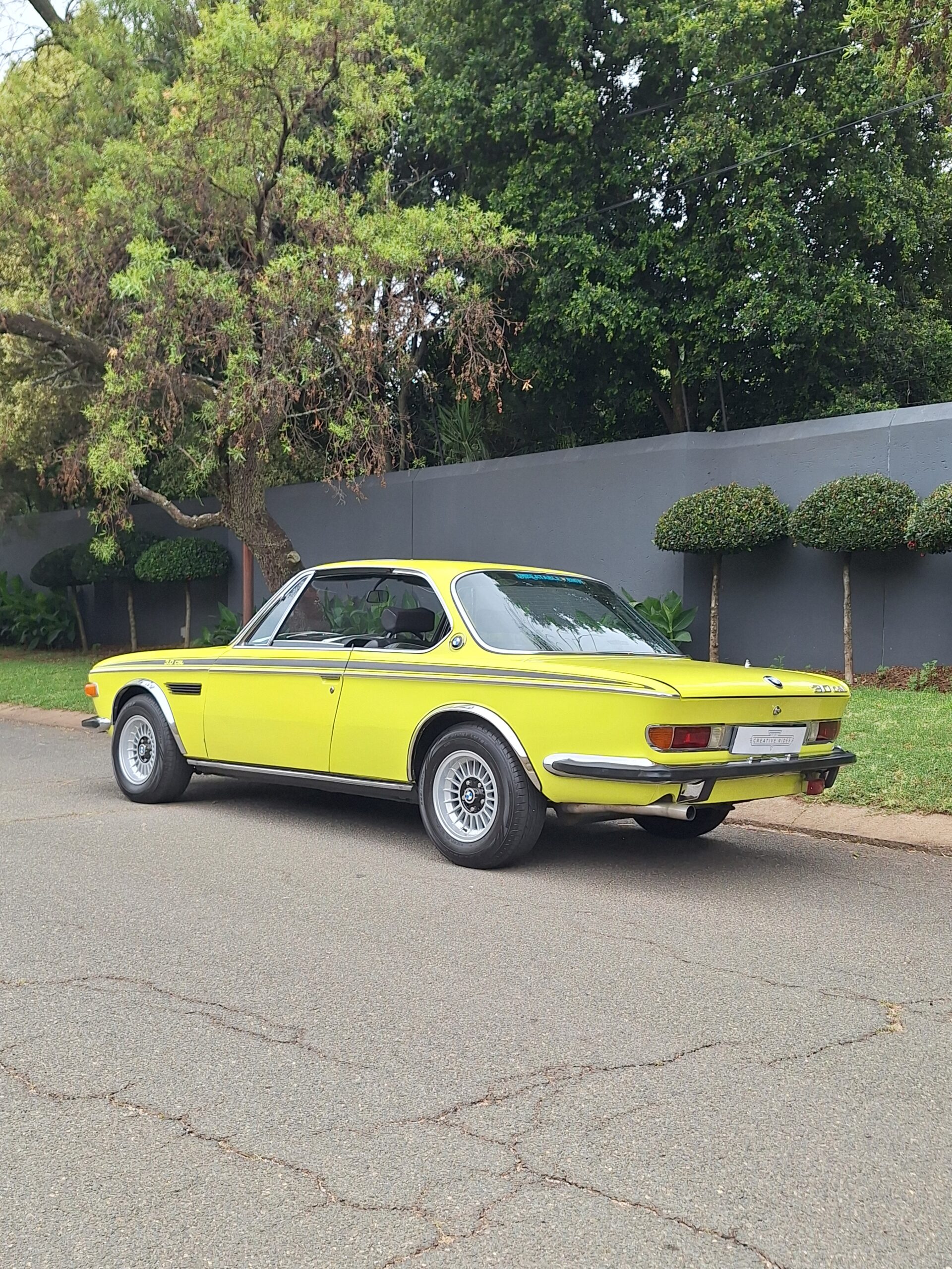 This example is finished in its factory Golf Yellow with the signature CSL black side stripes, riding on Alpina 14-inch alloy wheels. Inside you’ll find genuine Scheel bucket seats, a Mountney 3-spoke steering wheel, and classic woodgrain trim that keeps the grand touring vibe intact.