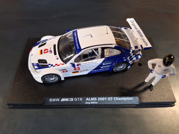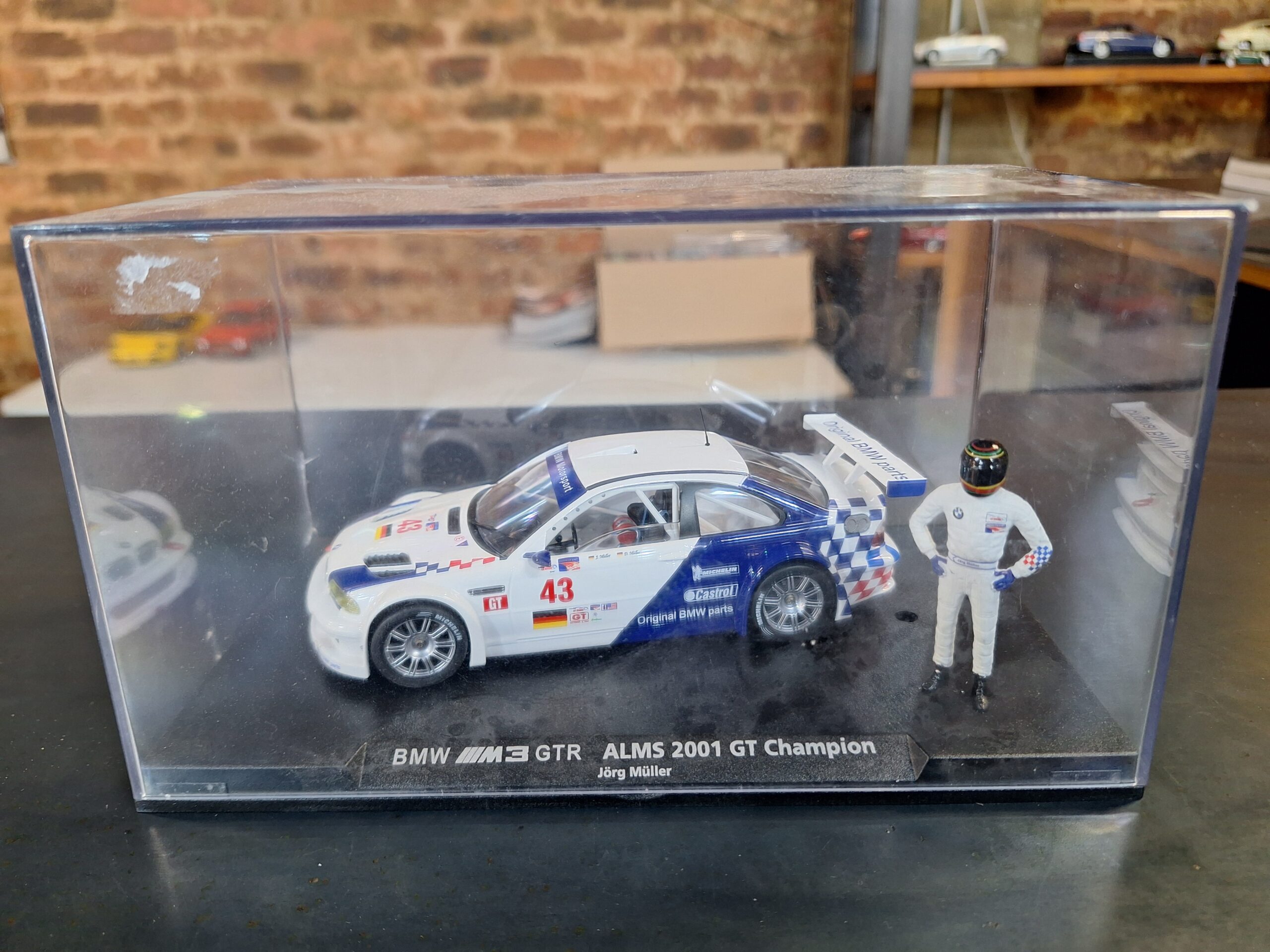 A highly collectible Fly slot car set featuring the iconic BMW M3 GTR E46 complete with a detailed Jörg Müller model statue, celebrating his GT Championship success. Ref 96014 / 91 showcases Fly’s top-tier craftsmanship with precise body detailing, accurate race livery and a striking presentation.