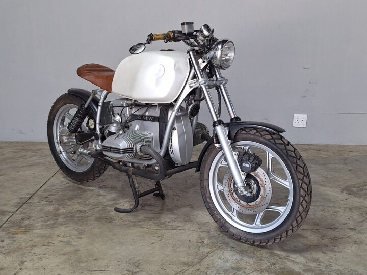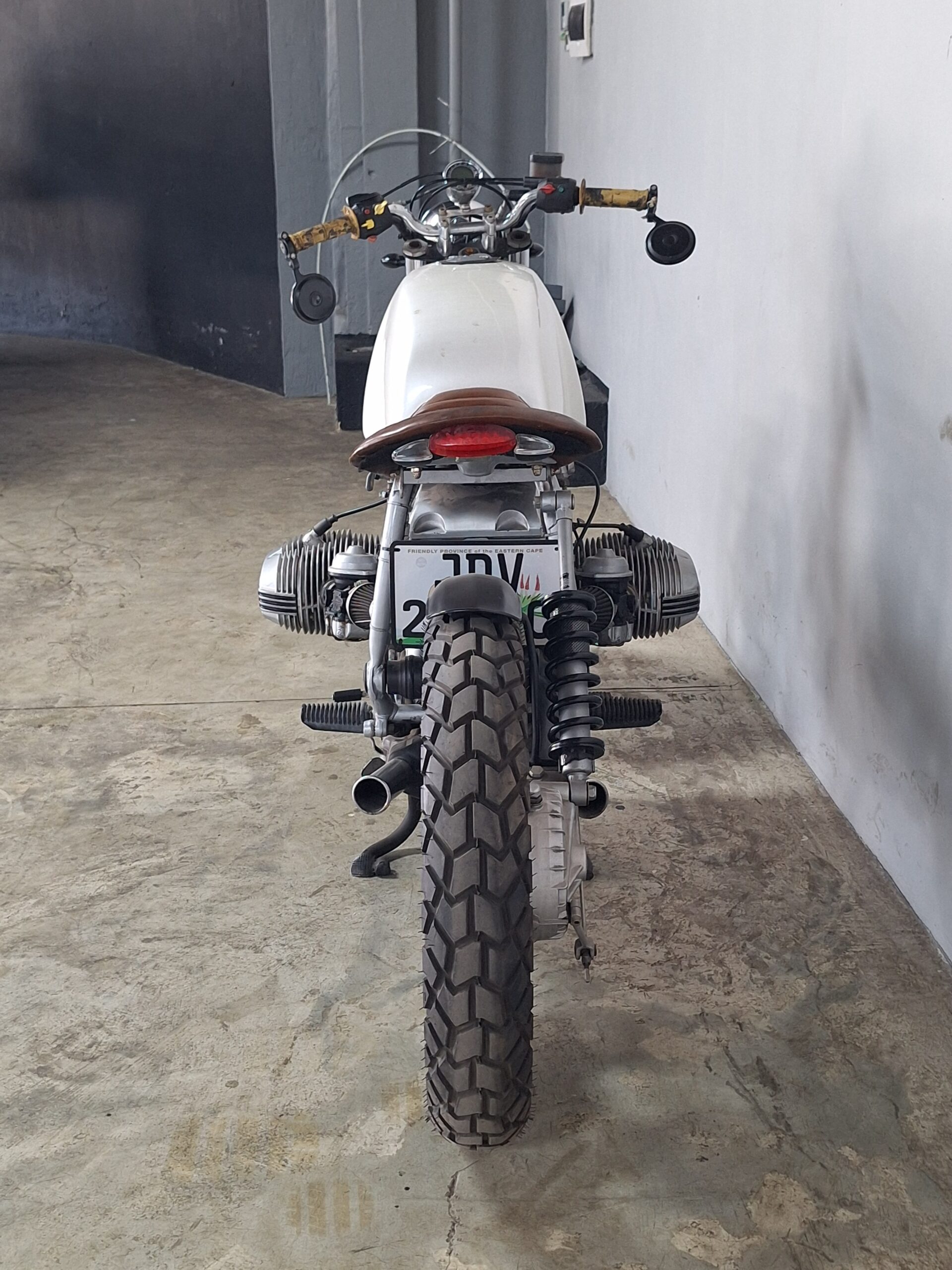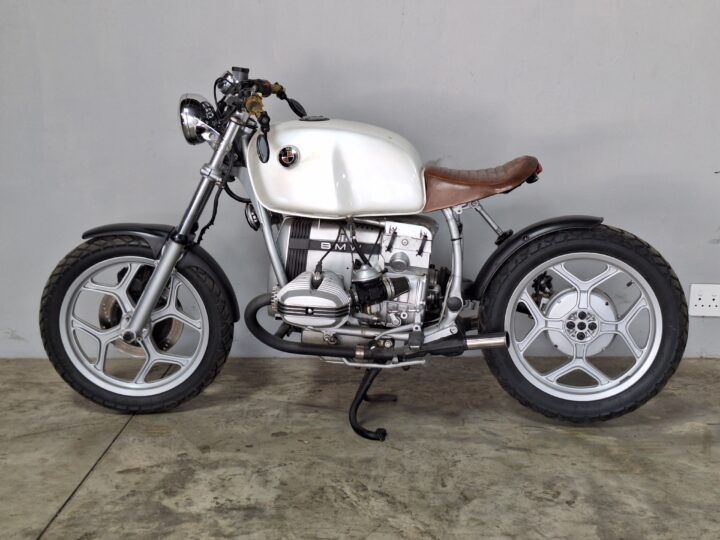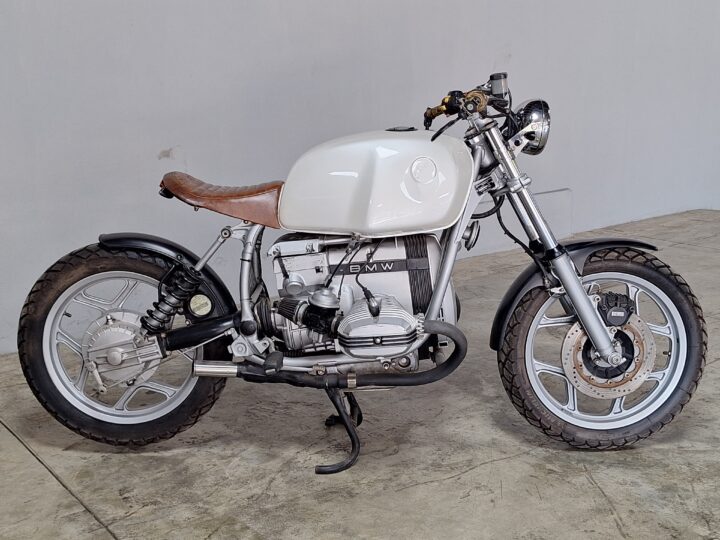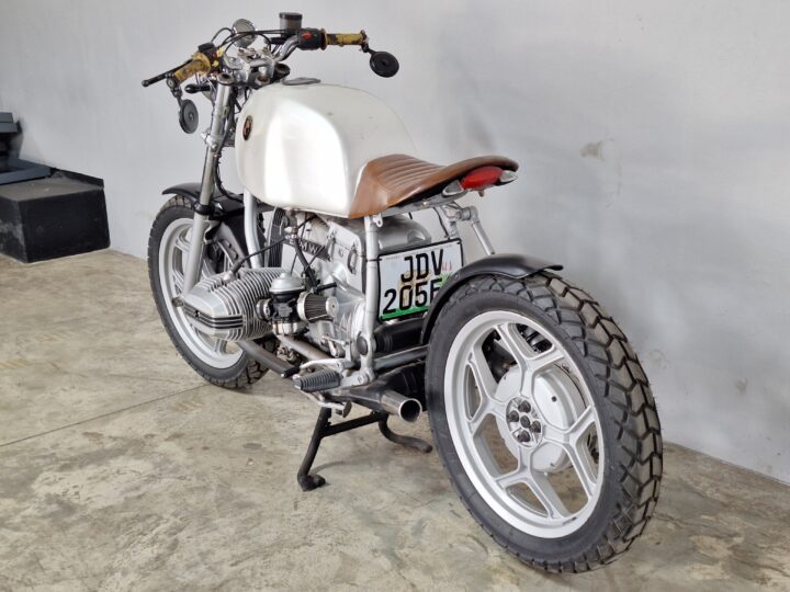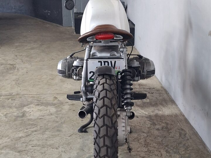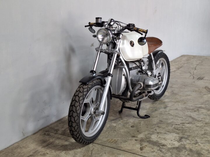 Finished in clean white with a hand-stitched tan solo seat, this bike nails the classic bobber stance: shortened rear frame, minimalist fenders, bar-end mirrors and those original alloy BMW wheels wrapped in aggressive dual-purpose tyres. The trademark boxer engine sits proudly on display, breathing through individual pod filters and barking through custom pipes – that distinctive BMW thrum is half the experience.