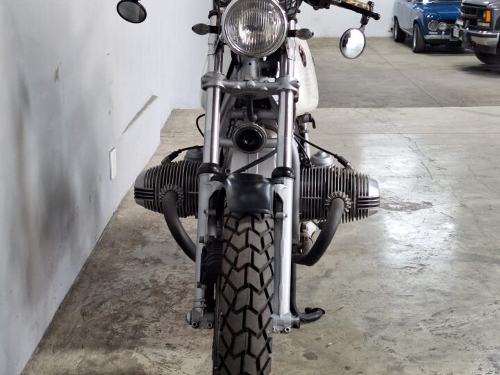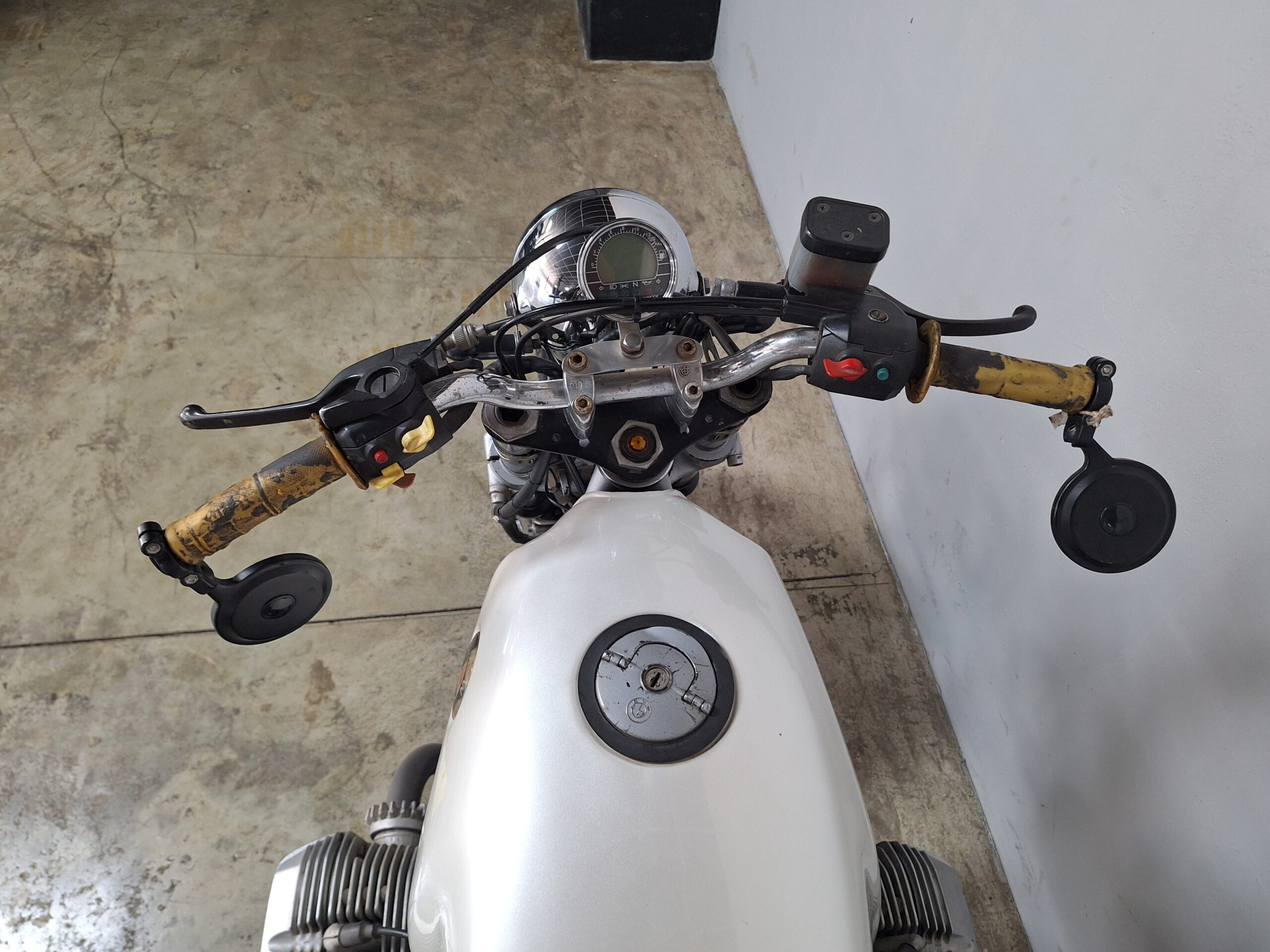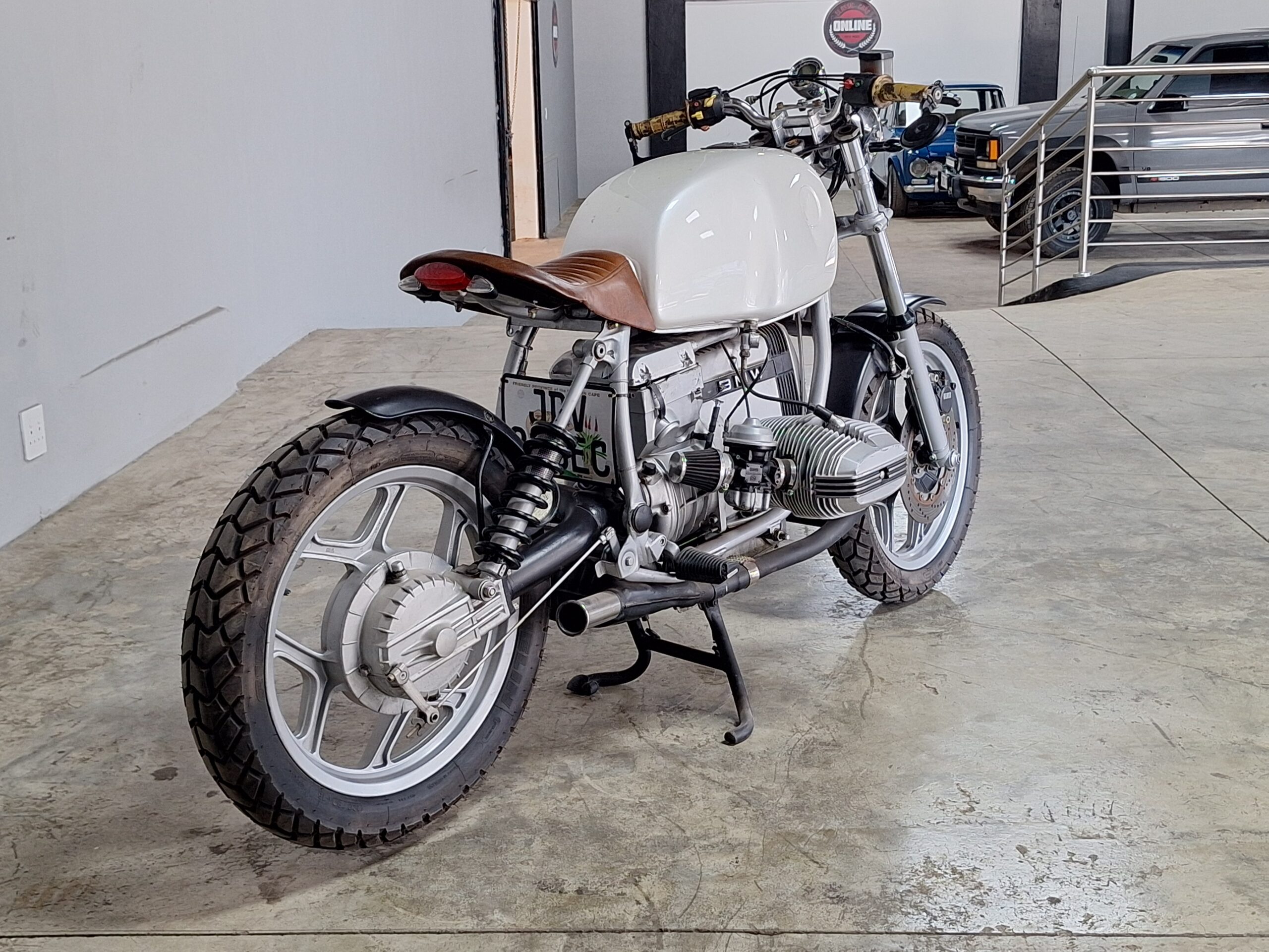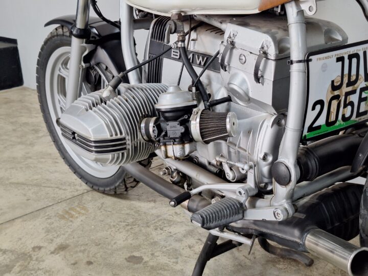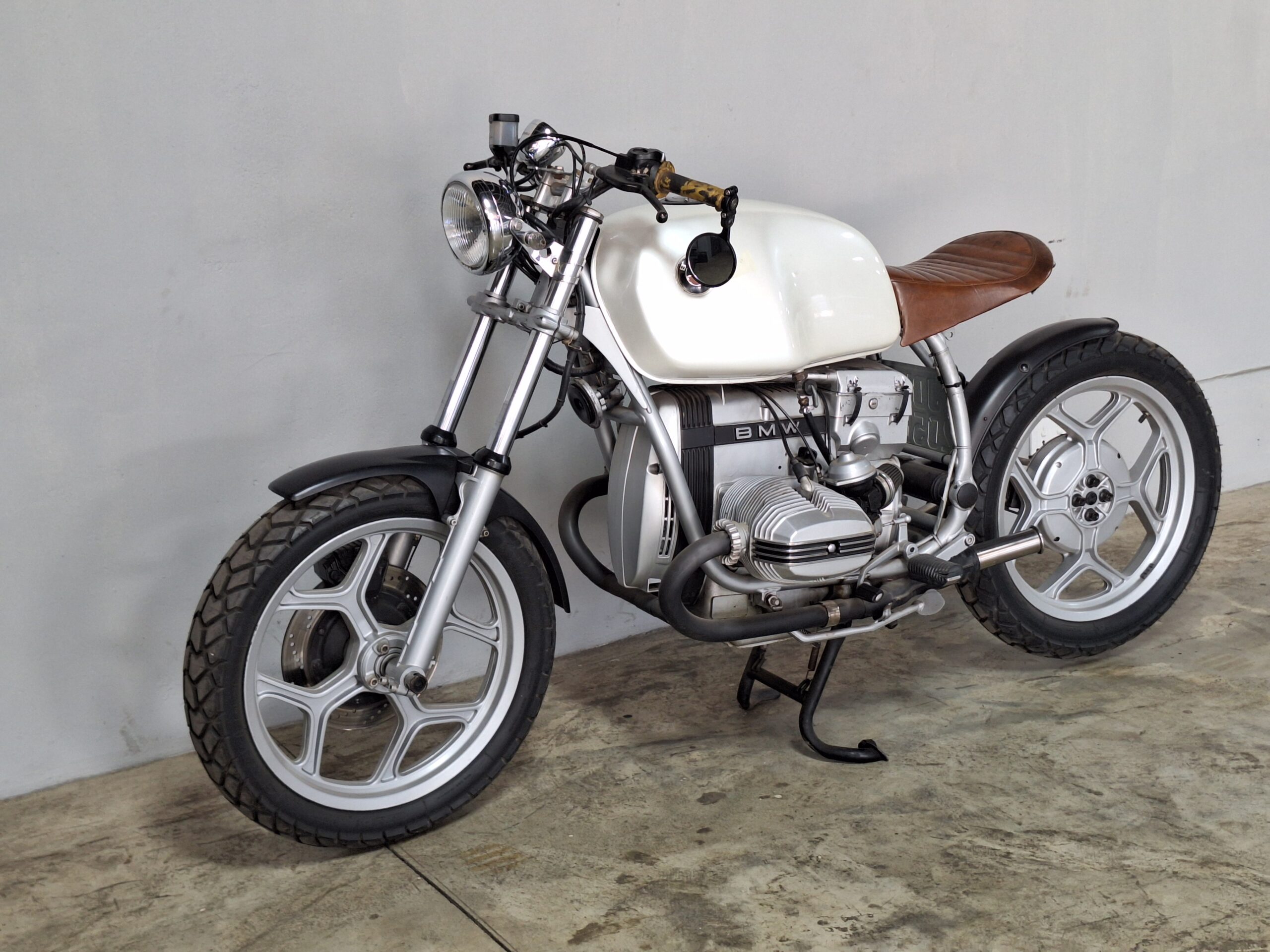 Finished in clean white with a hand-stitched tan solo seat, this bike nails the classic bobber stance: shortened rear frame, minimalist fenders, bar-end mirrors and those original alloy BMW wheels wrapped in aggressive dual-purpose tyres. The trademark boxer engine sits proudly on display, breathing through individual pod filters and barking through custom pipes – that distinctive BMW thrum is half the experience.