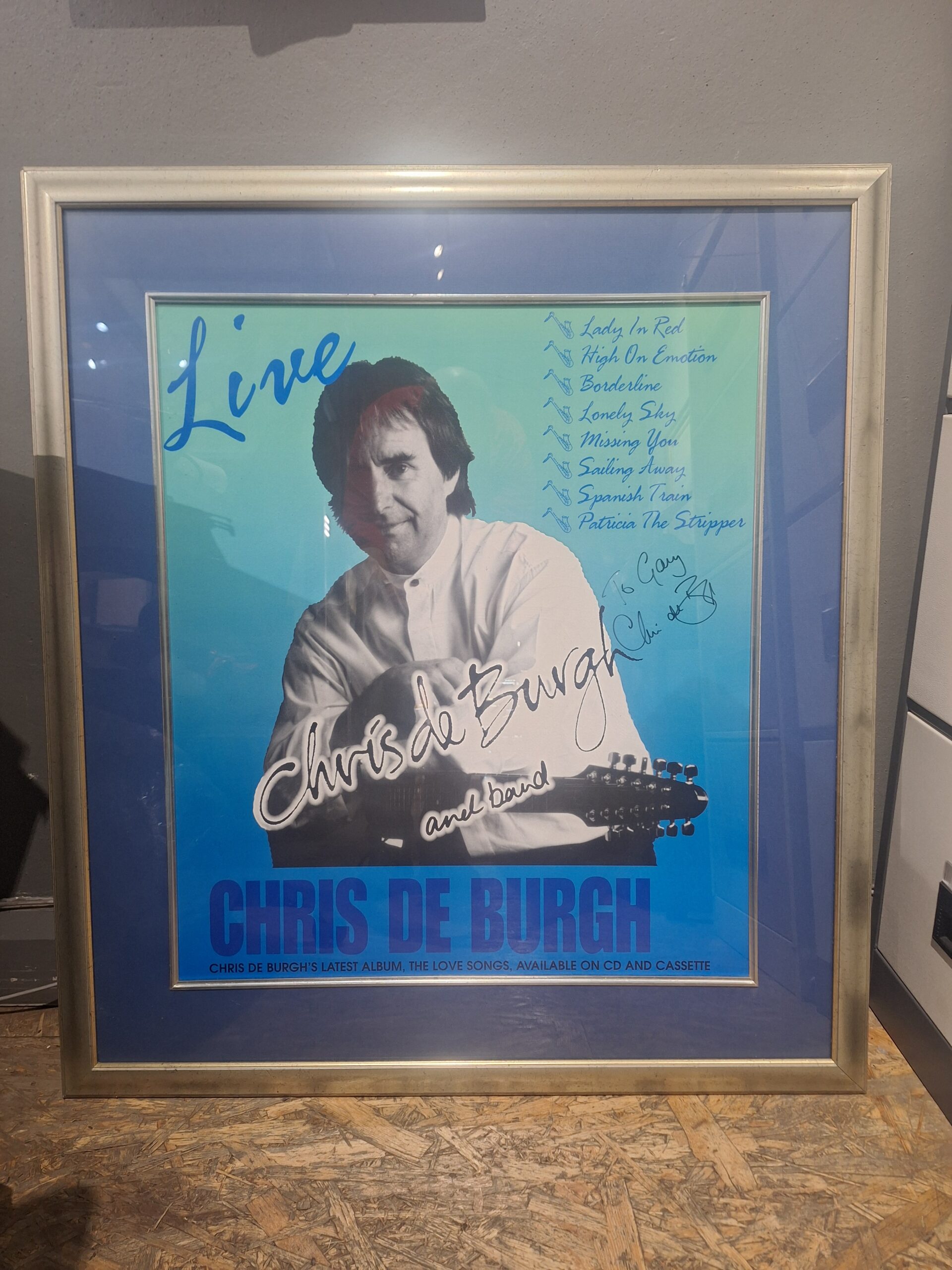 Framed Chris de Burgh poster featuring his authentic autograph. Nicely presented and ready to hang, this is a great collectible for fans of the artist or anyone building a music memorabilia collection.
