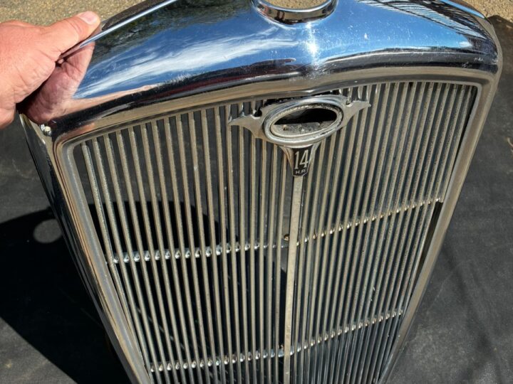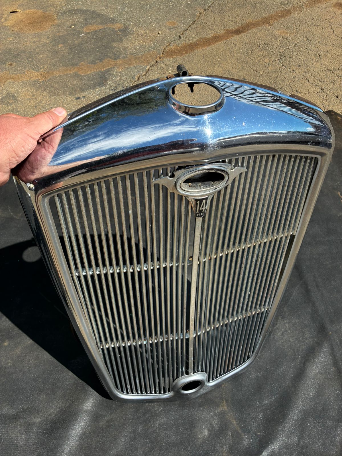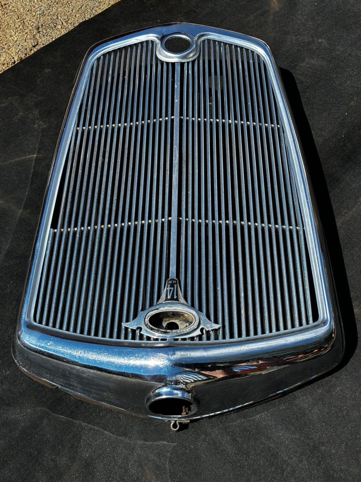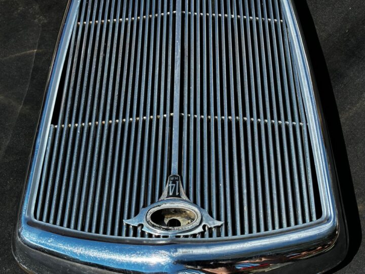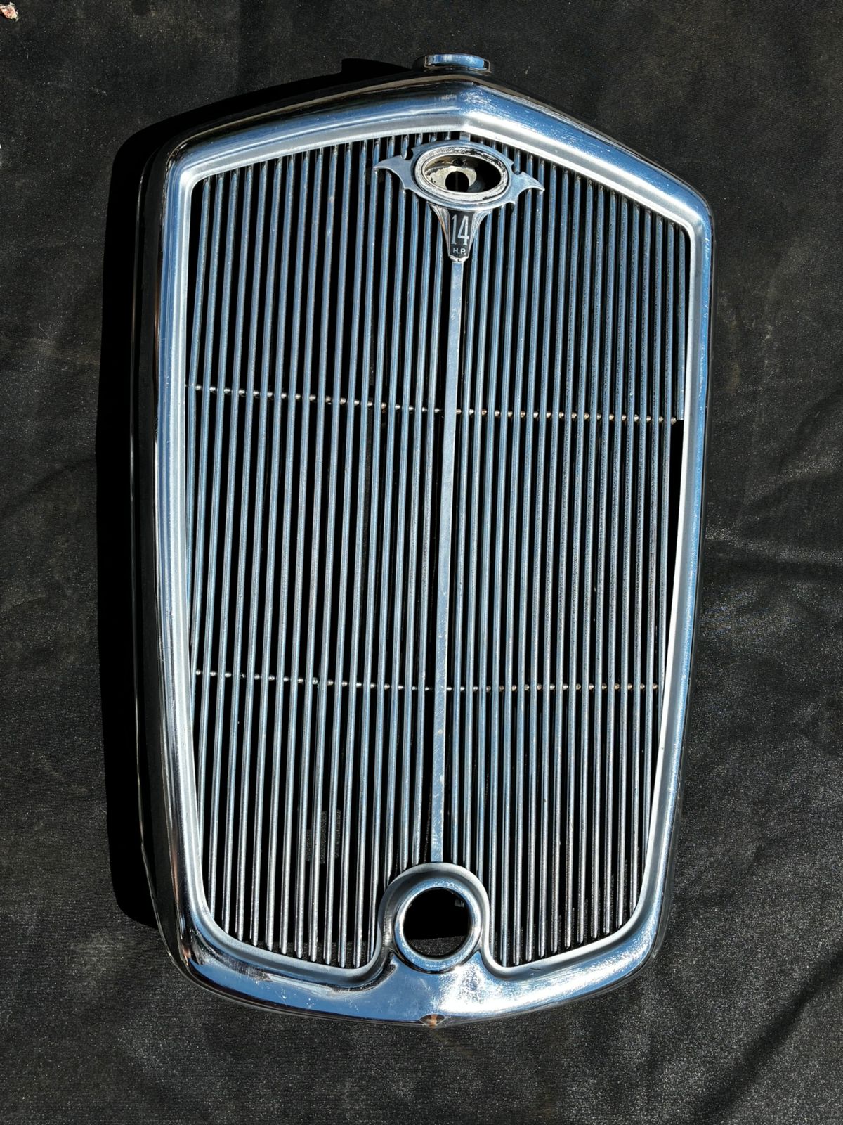 A vintage classic chrome grille, showcasing timeless styling and solid metal construction. The chrome finish has great character, making it an ideal piece for restoration projects, custom builds