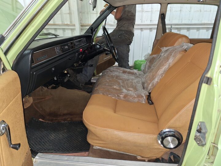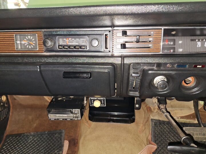 The real highlight is the interior. The tan cloth cabin presents almost like new, with the broad bench seats, door panels and carpets all in impressively well-preserved condition. The dashboard is wonderfully original, right down to the period radio and the 8-track cassette player still in place under the dash.