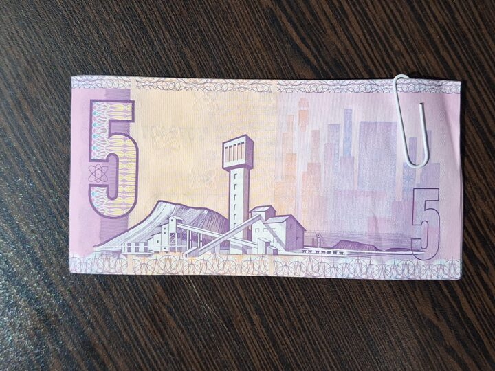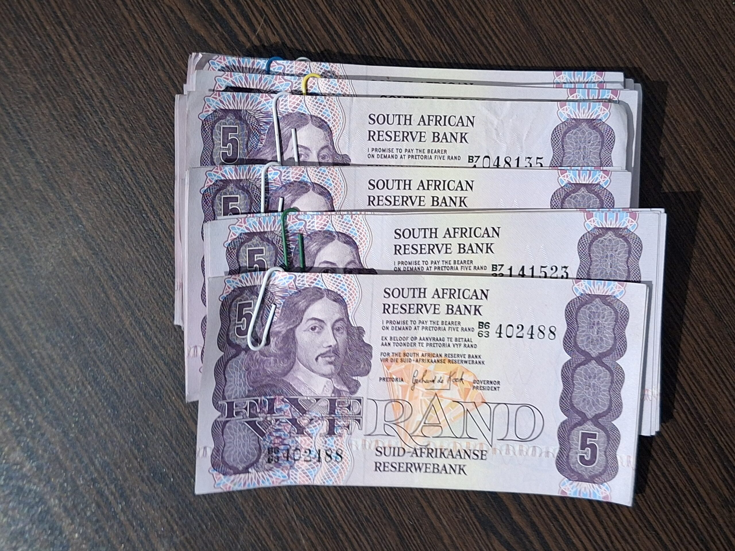 Bundle of ninety-two pre-Mandela South African R5 banknotes from the early 1990s, featuring the mining headgear reverse design. A useful bulk group for collectors, dealers or educational display, offering an affordable way to acquire multiple examples of this pre-democracy issue in one lot.