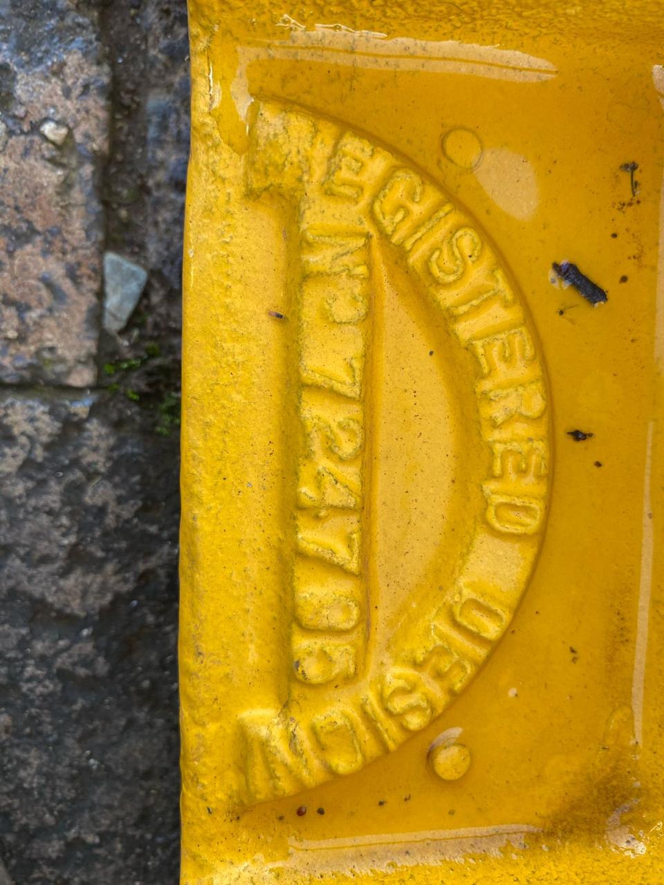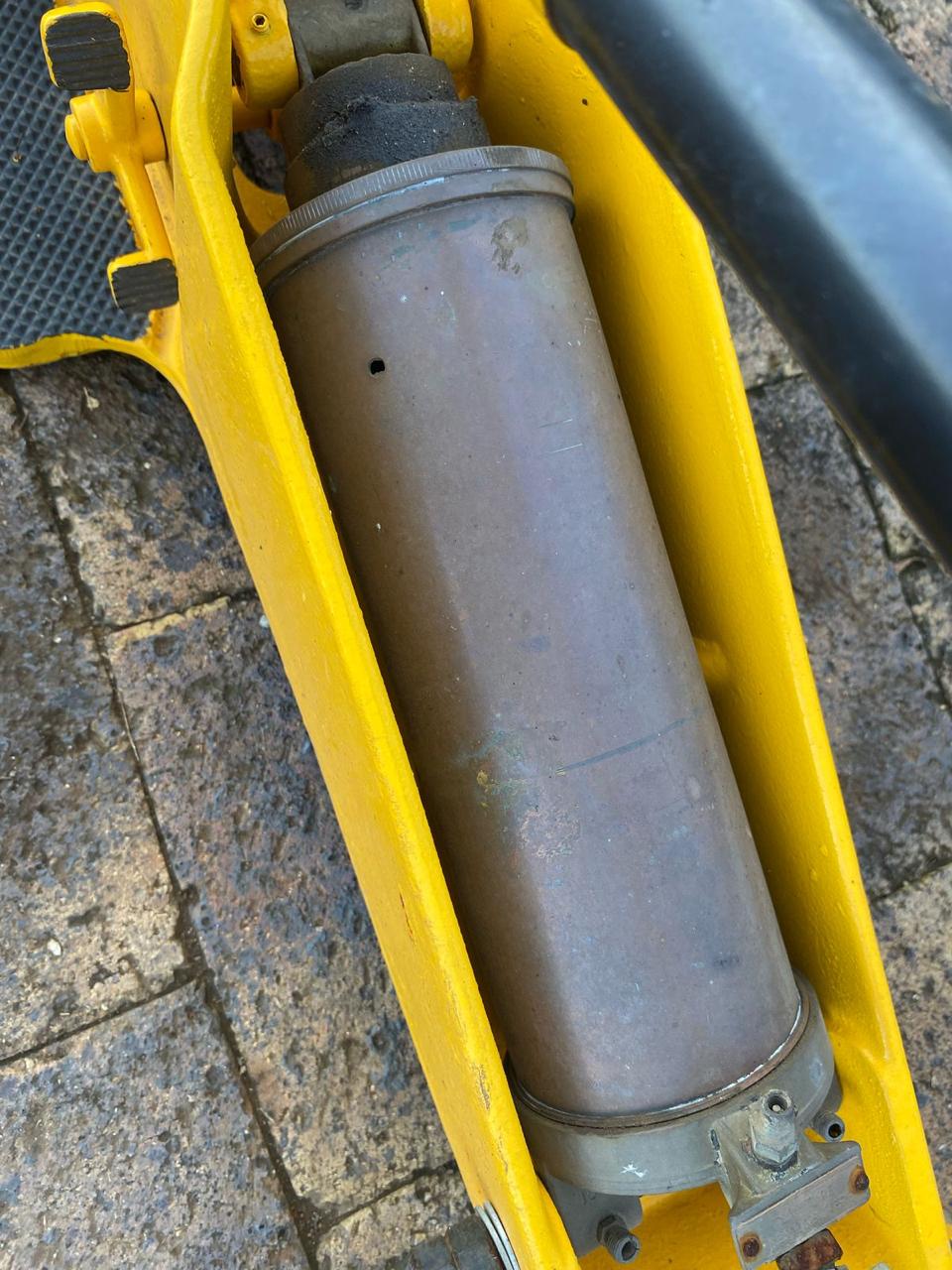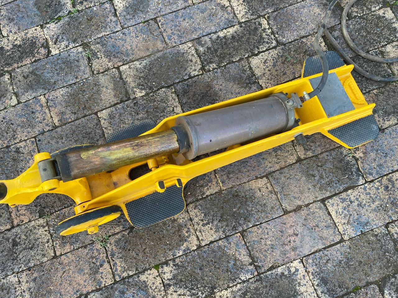 A heavy-duty antique hand air pump, built from large cast iron with a brass cylinder and mounted on wheels for mobility. This is a very scarce and unique piece, showcasing early industrial craftsmanship and serious durability.
