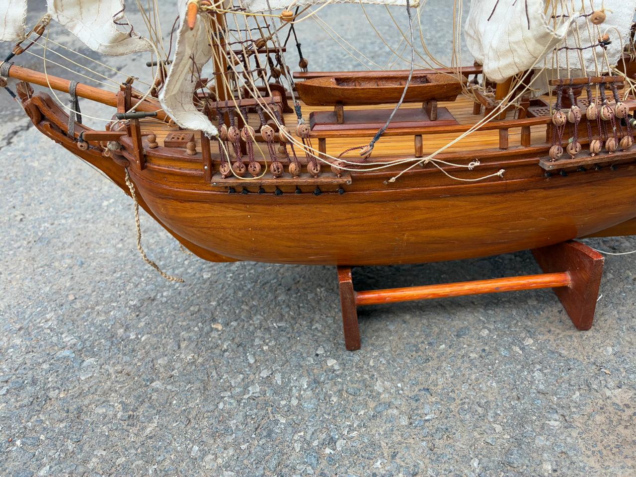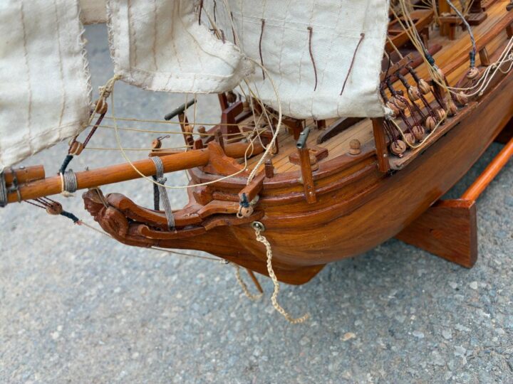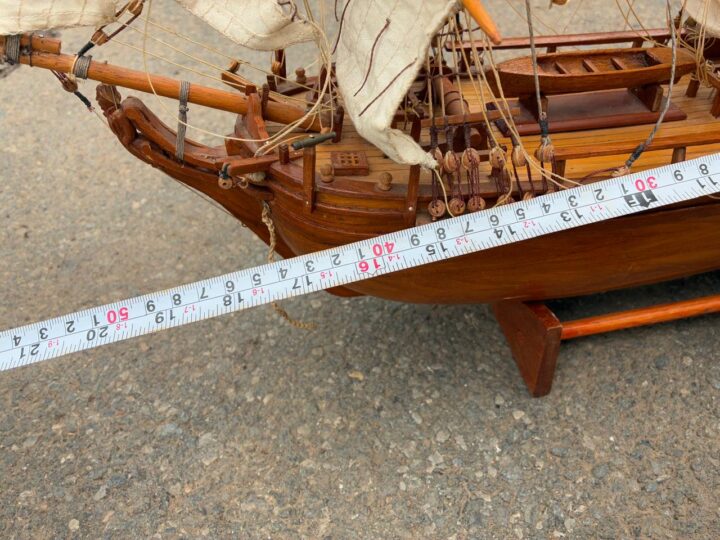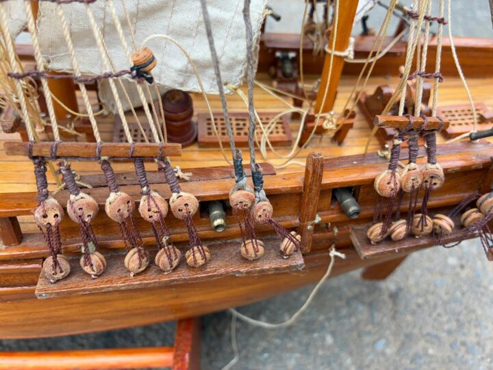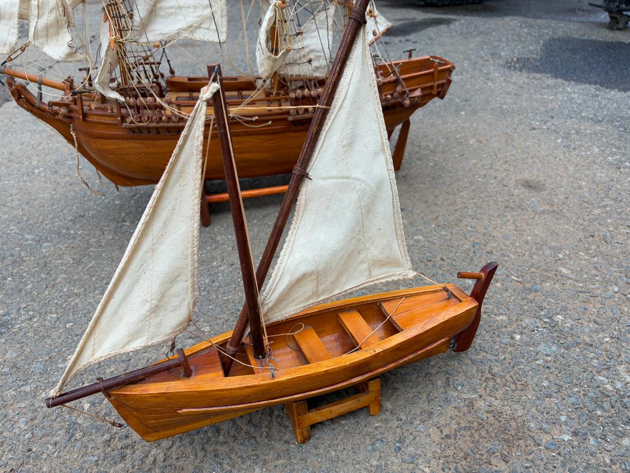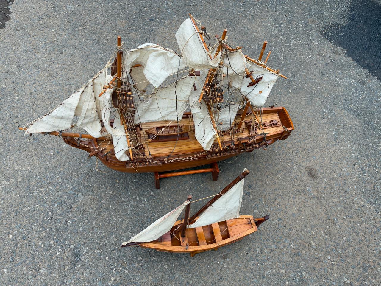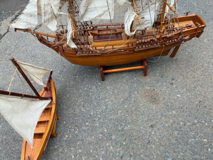 Pair of professionally built wooden sailing ships on stands – 1 large and 1 small – both hand crafted with lots of fine detail including cannons, sails and lifeboat. Beautifully made display pieces from a deceased estate, ideal for a study, office, bar or nautical-themed room.