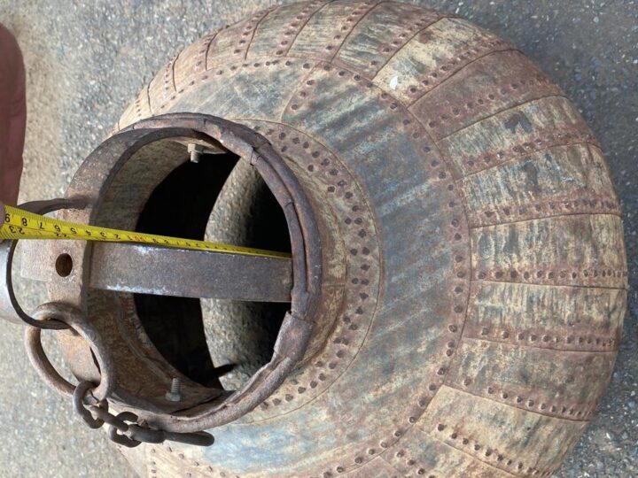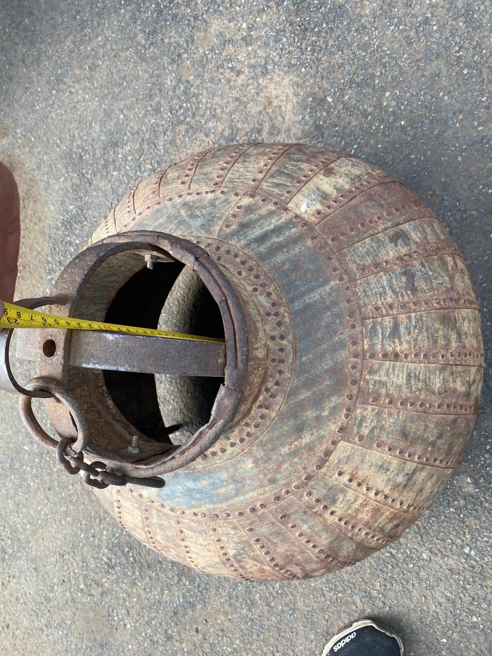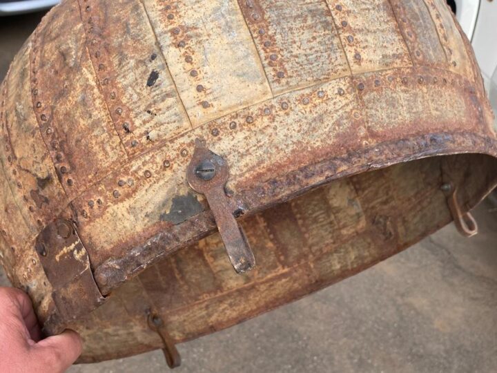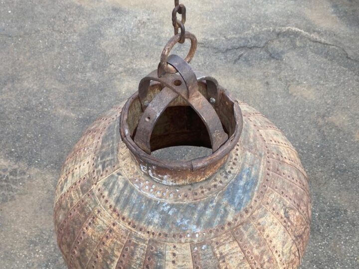 A striking industrial antique lamp shade from the 1800s, crafted from riveted steel and wrought iron in true old-world workshop style. This large, impressive chandelier measures 500 mm in diameter and 800 mm in height, giving it serious presence and architectural charm.
