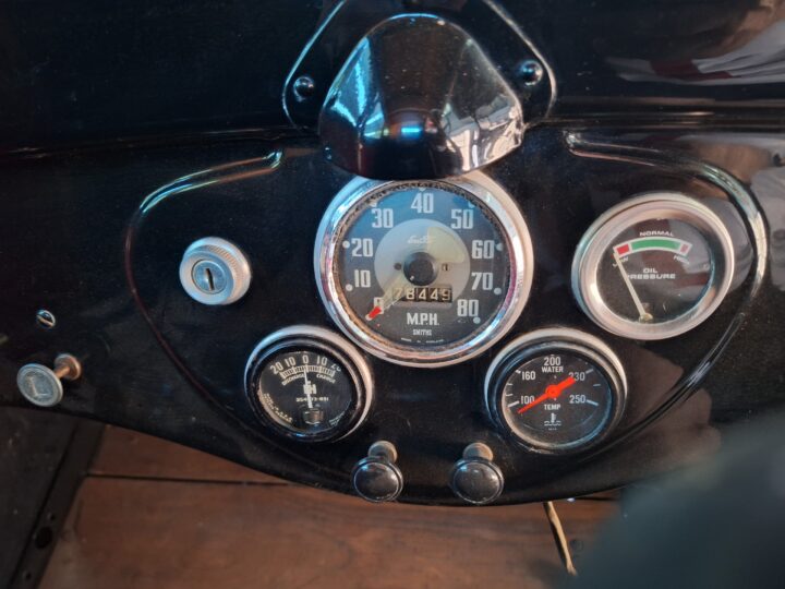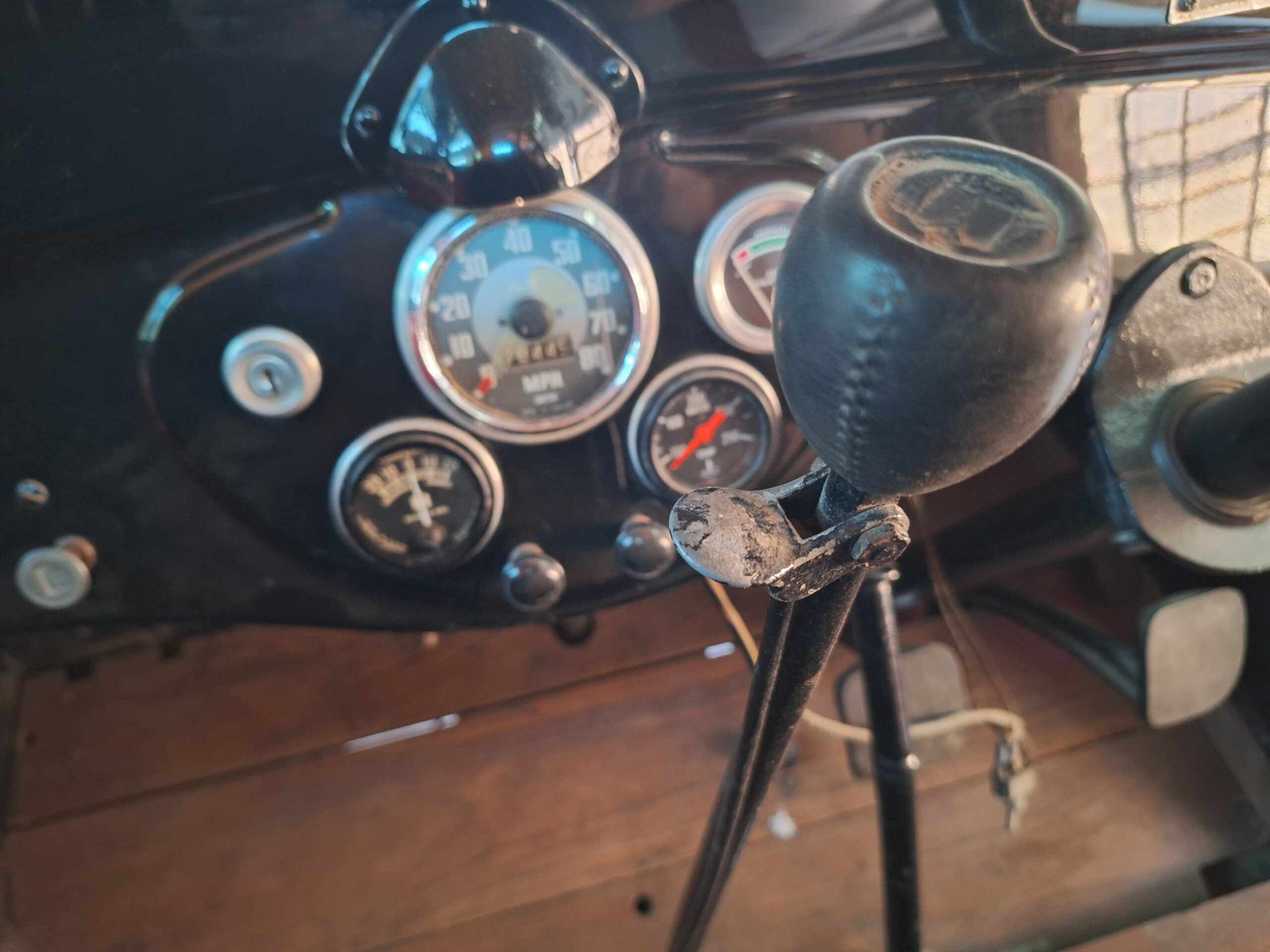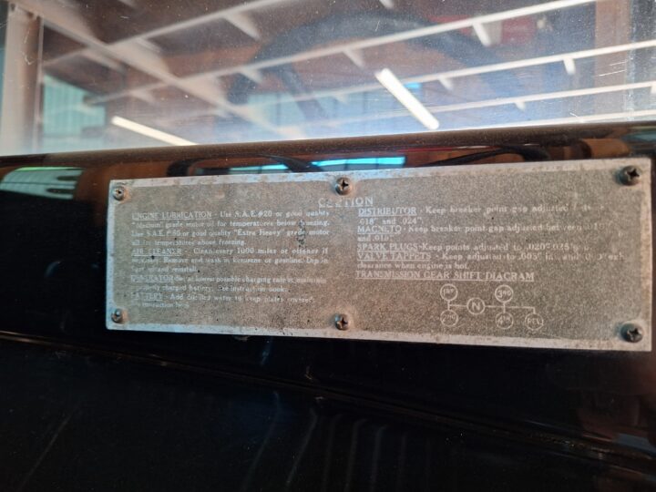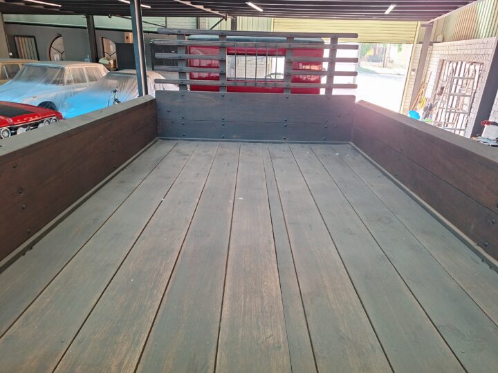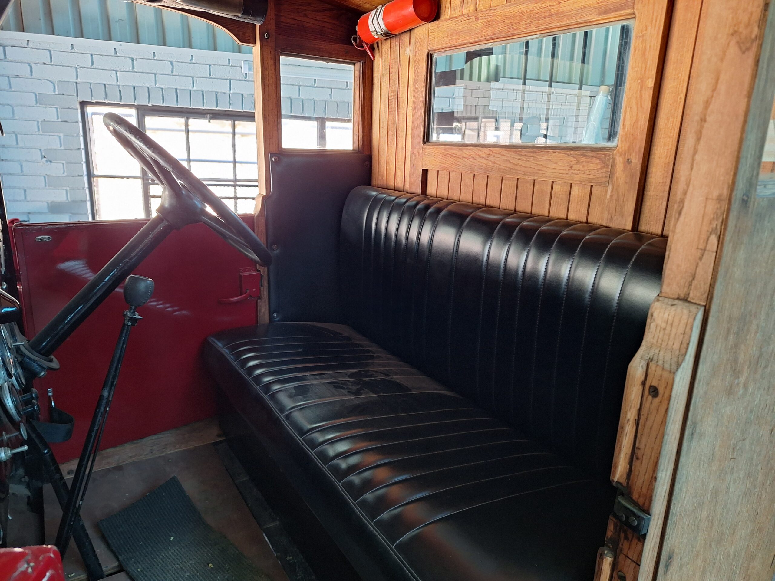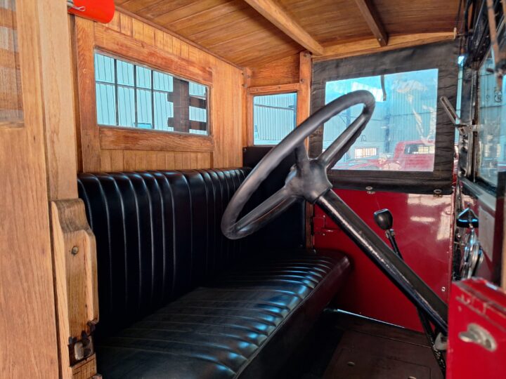 The cab has been sympathetically restored in timber, with a new wooden body and floor replacing the original oak that succumbed to dry rot. Inside you get a simple black bench seat, timber roof and sides, original-style gauges and data plates, plus that huge steering wheel and long floor shifter that remind you this is a real truck, not a toy.