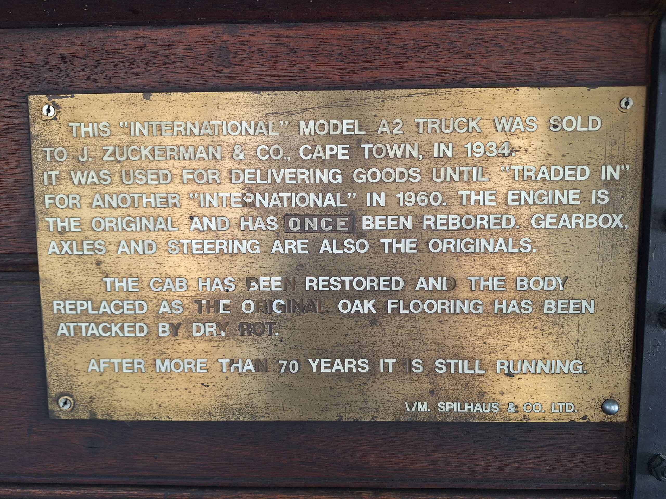 This International Model A2 is a proper working piece of South African commercial history. Sold new to J. Zuckerman & Co. in Cape Town in 1934, it spent decades delivering goods before being traded for another International in 1960. According to the brass history plaque on the body, the engine is the original unit and has only been rebored once, with the gearbox, axles and steering also still original.