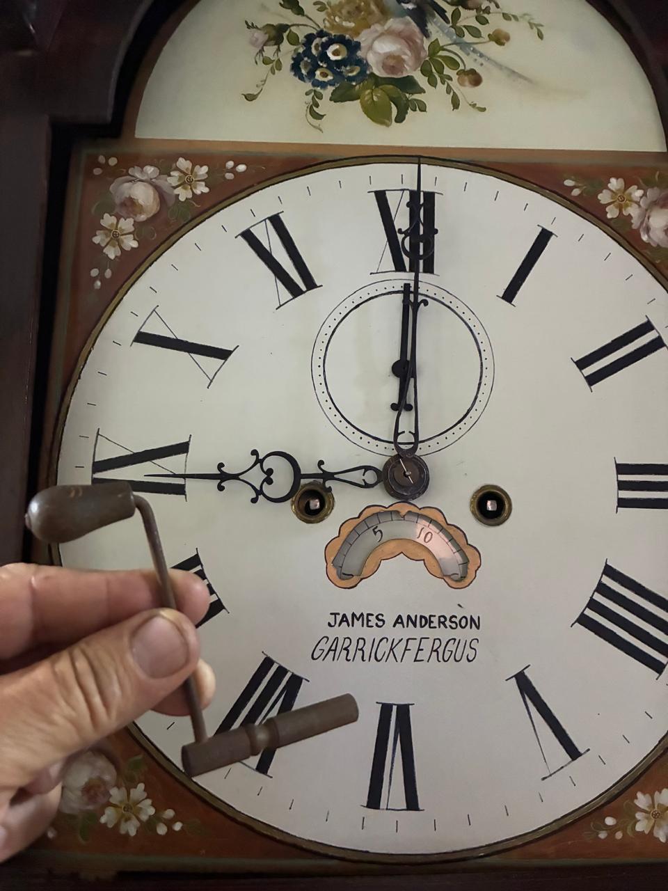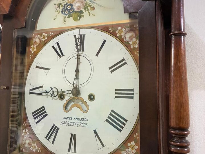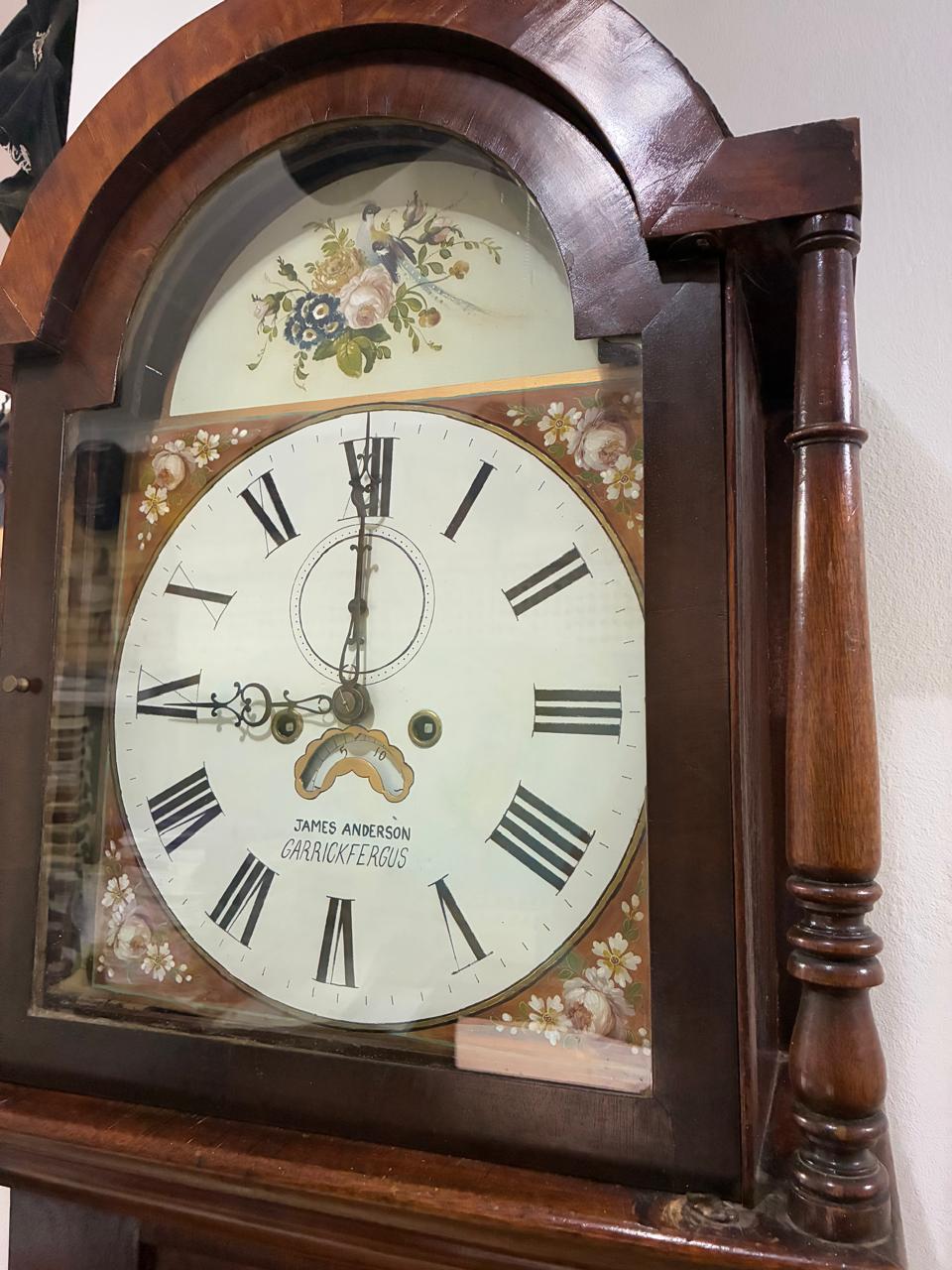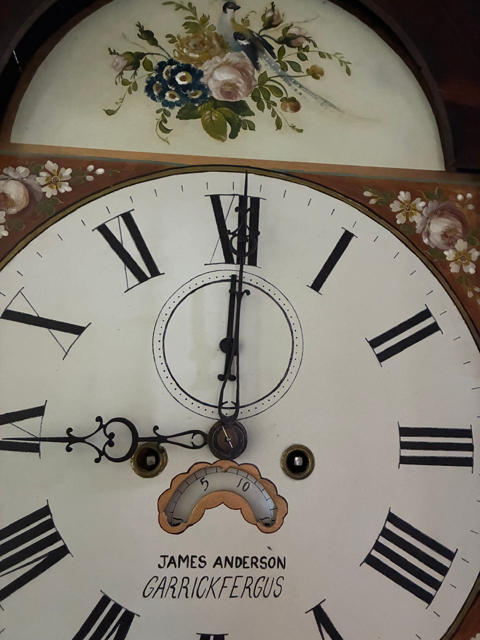 The painted 14-inch dial features Roman numerals, a subsidiary seconds dial, and charming hand-painted floral spandrels. The dial is clearly signed “James Anderson, Garrick Fergus,” indicating manufacture in the historic County Antrim port town.