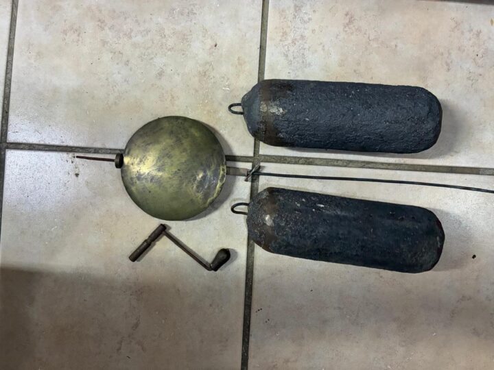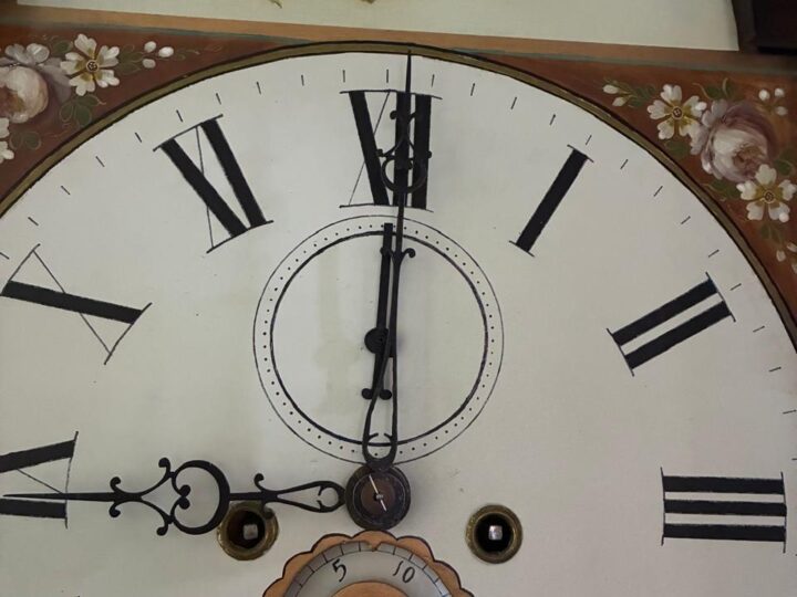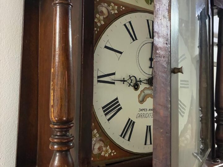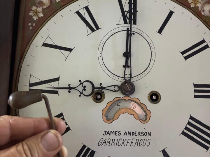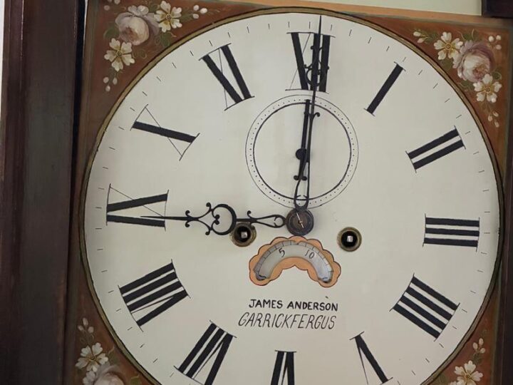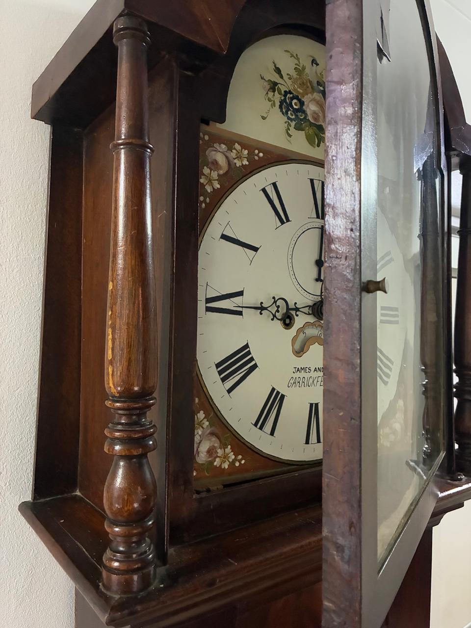 The painted 14-inch dial features Roman numerals, a subsidiary seconds dial, and charming hand-painted floral spandrels. The dial is clearly signed “James Anderson, Garrick Fergus,” indicating manufacture in the historic County Antrim port town.