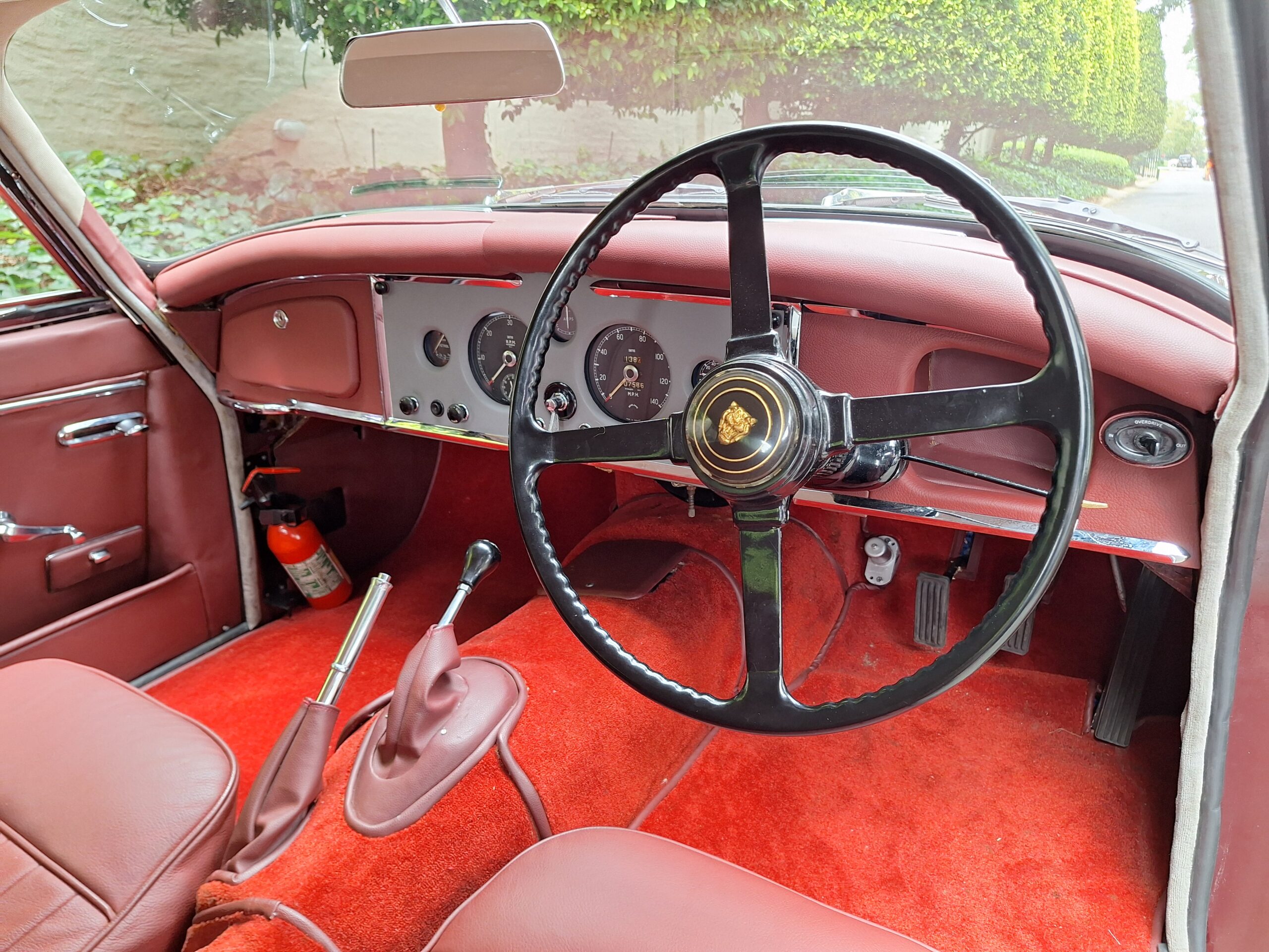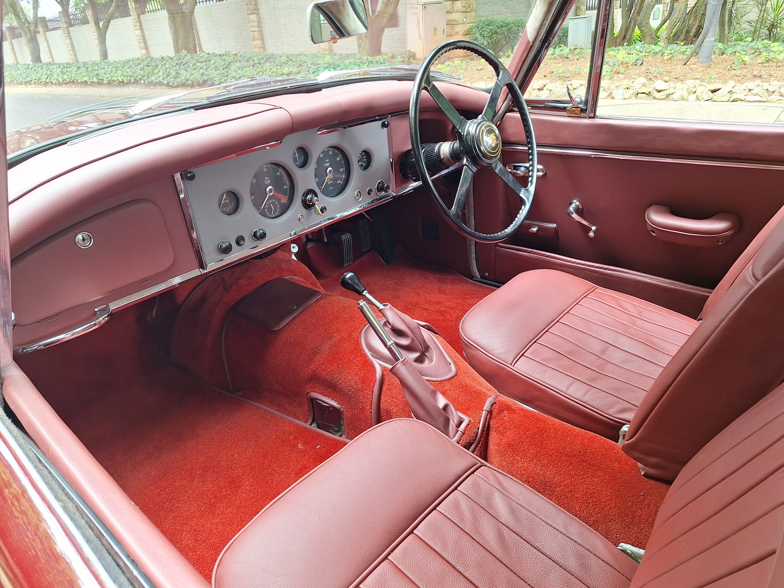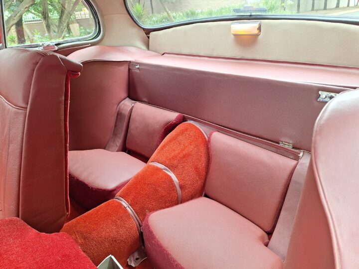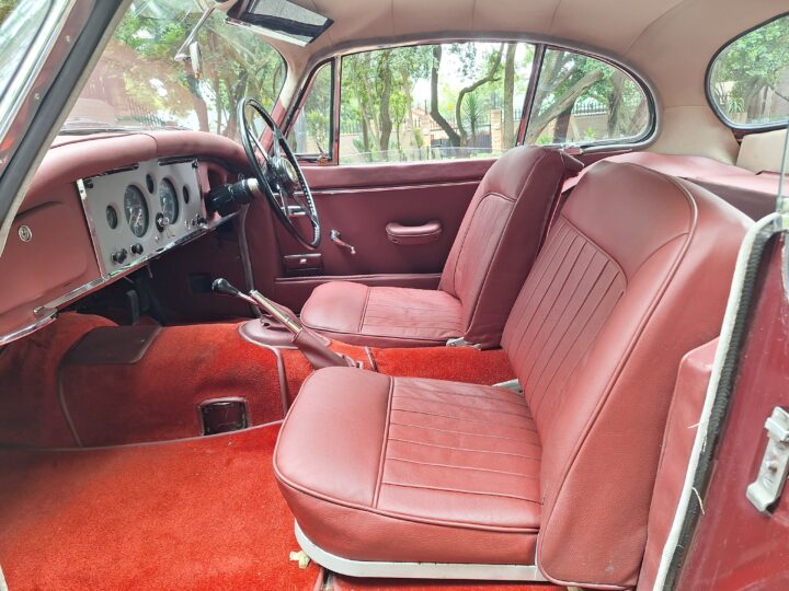A standout feature is Dunlop disc brakes on all four wheels, giving confident stopping power even by modern standards. Inside, the cabin is beautifully finished in Ox Blood red leather with matching carpets, complementing the black exterior.