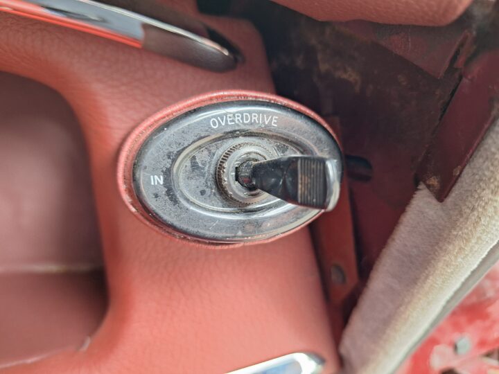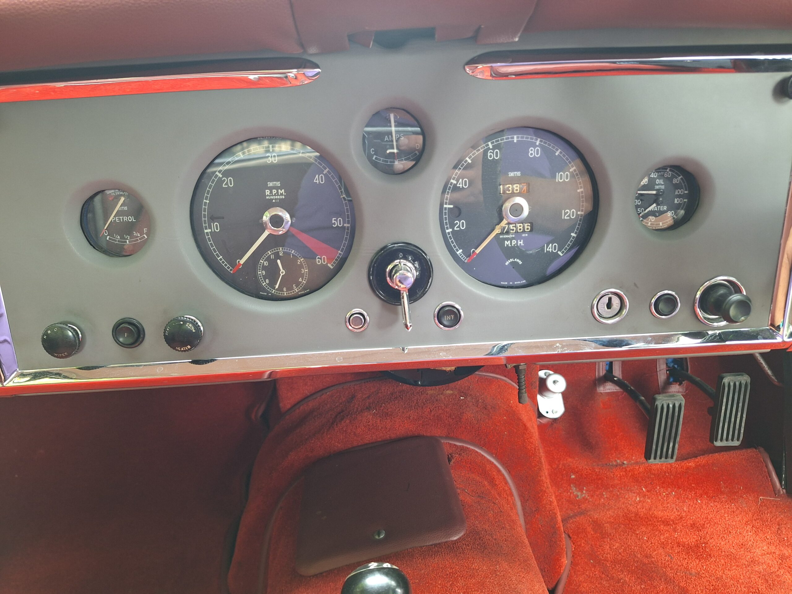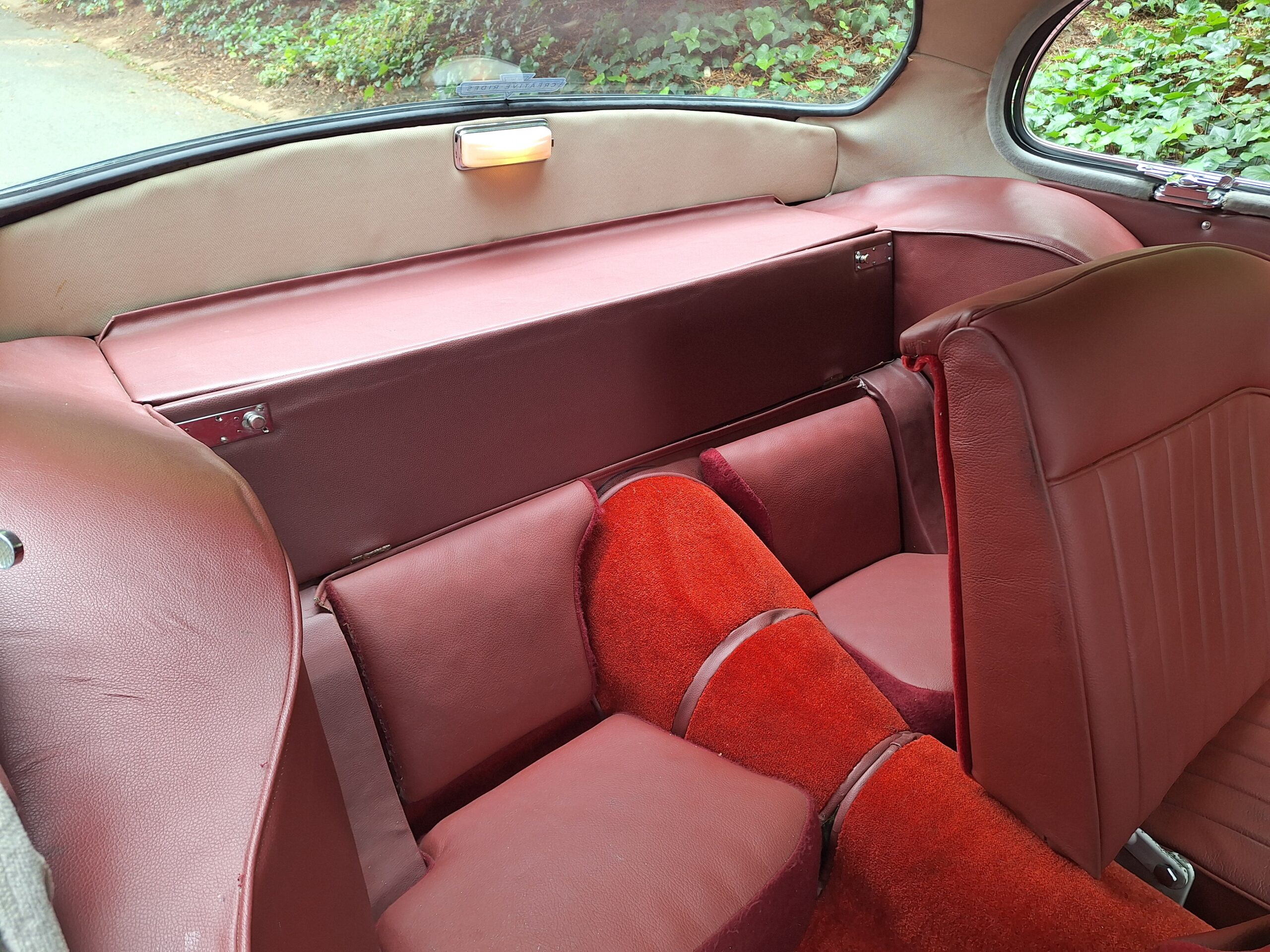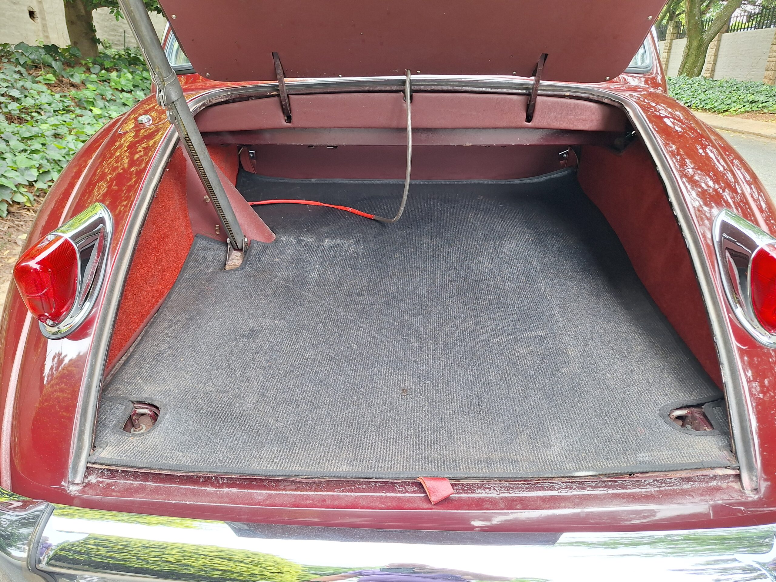 A standout feature is Dunlop disc brakes on all four wheels, giving confident stopping power even by modern standards. Inside, the cabin is beautifully finished in Ox Blood red leather with matching carpets, complementing the black exterior.