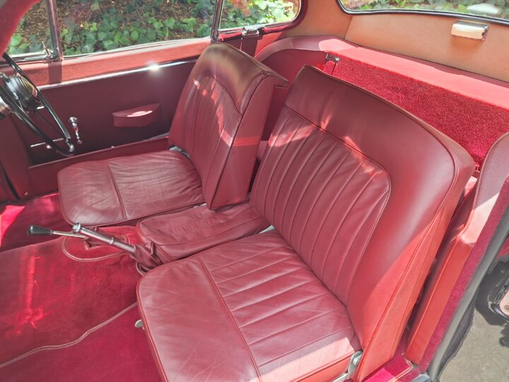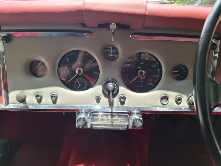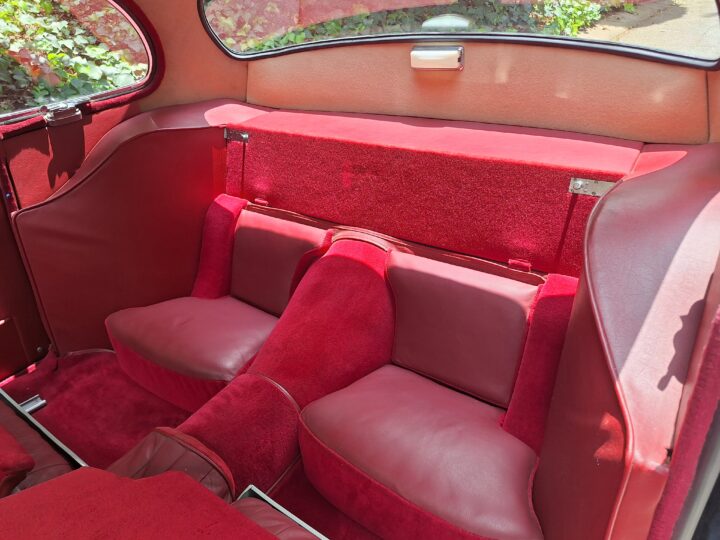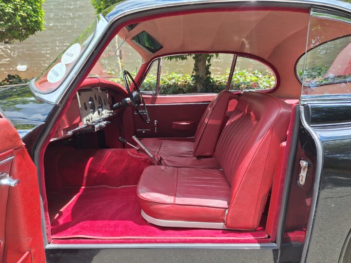 Inside, the cabin is every bit as special as the engineering. Finished in rich Ox Blood red leather with matching red carpets, it perfectly complements the deep black exterior. The dashboard retains its correct period switchgear, and the original Radiomobile radio is still in place, adding to the authentic 1950s Jaguar ambience.
