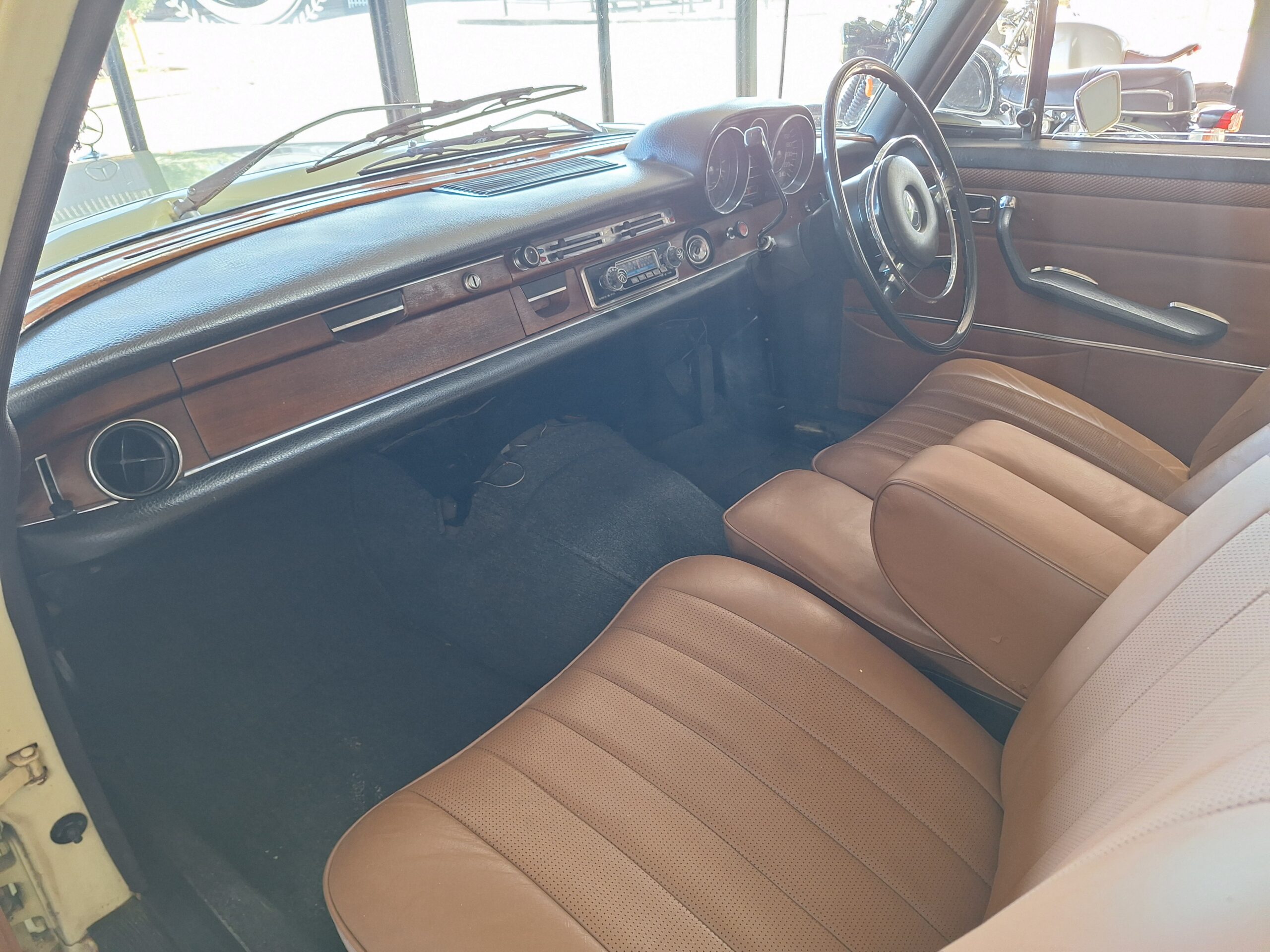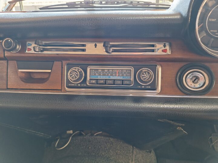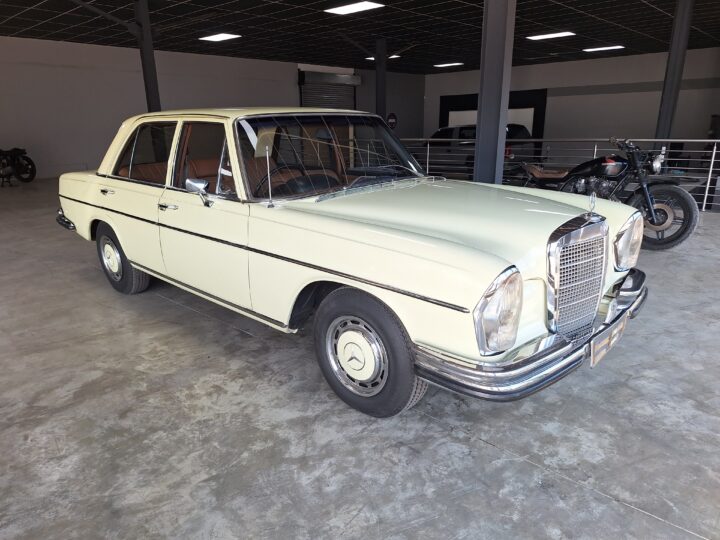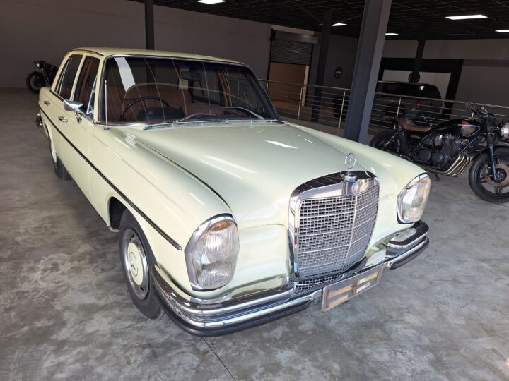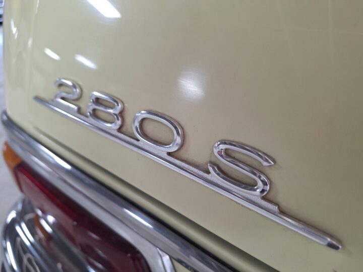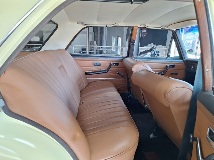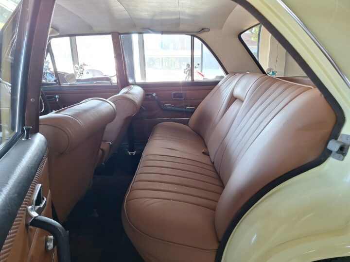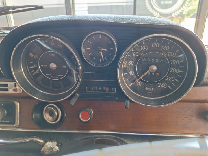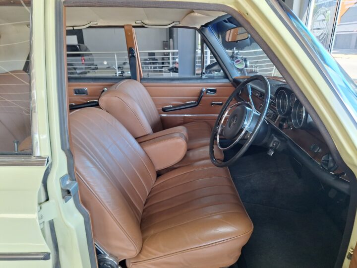 The W108 280S is where the Mercedes-Benz S-Class story really starts, and this example captures that classic luxury feel perfectly. Finished in elegant Cream White with colour-coded hubcaps, it presents very well – a solid 8/10 car. The body has had a blow-over respray while the side panels and roof lining remain original, giving a nice balance between preservation and refresh. Inside, the seats and carpets have been redone in period-correct style, complementing the dark dash and wood trim to create a very inviting cabin.