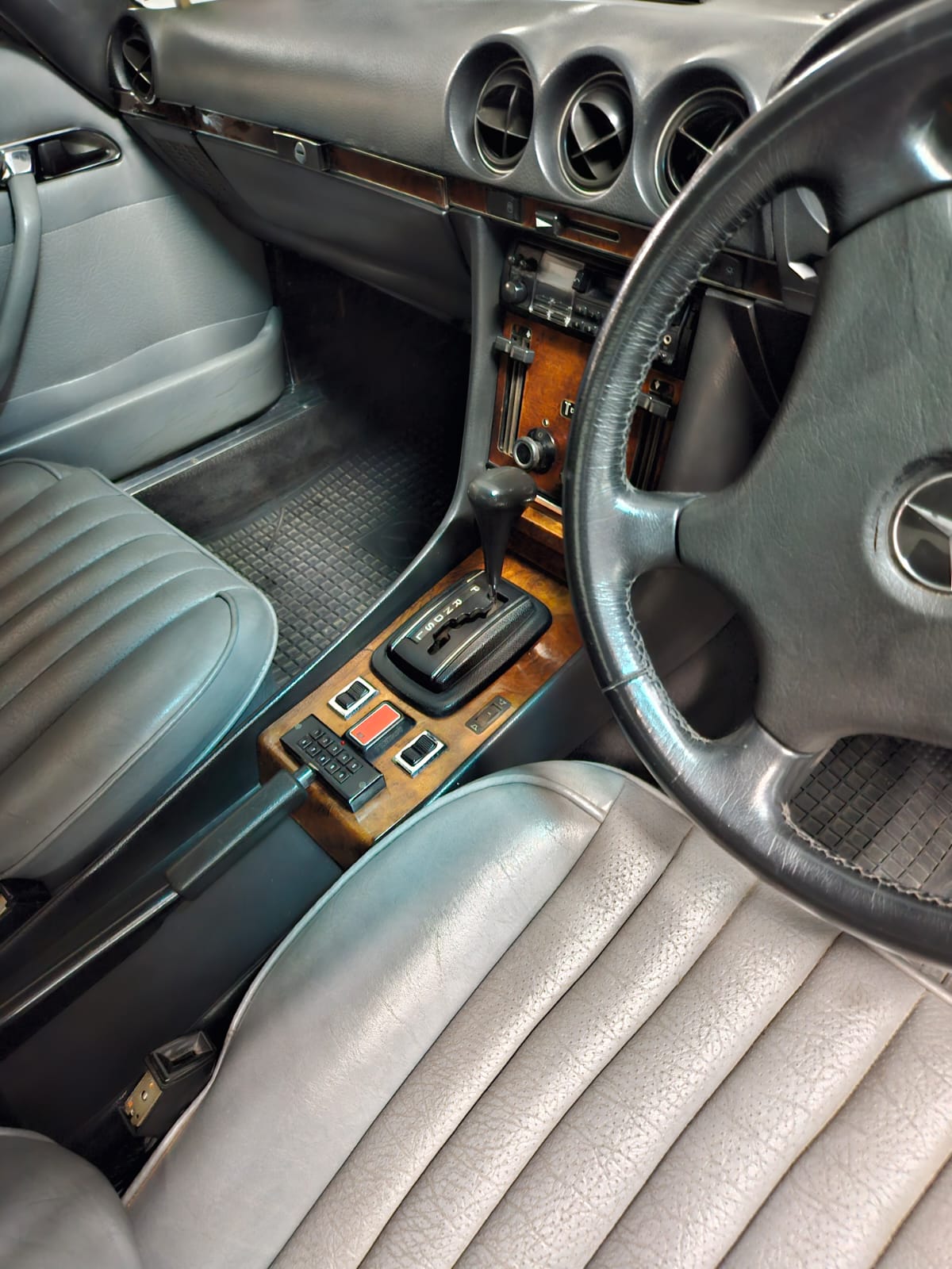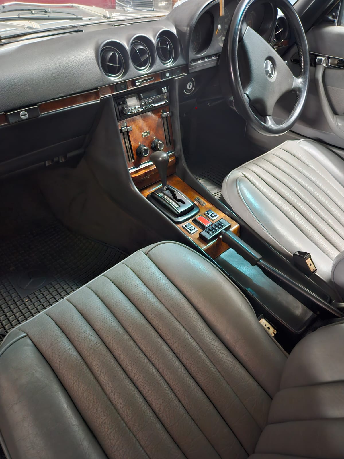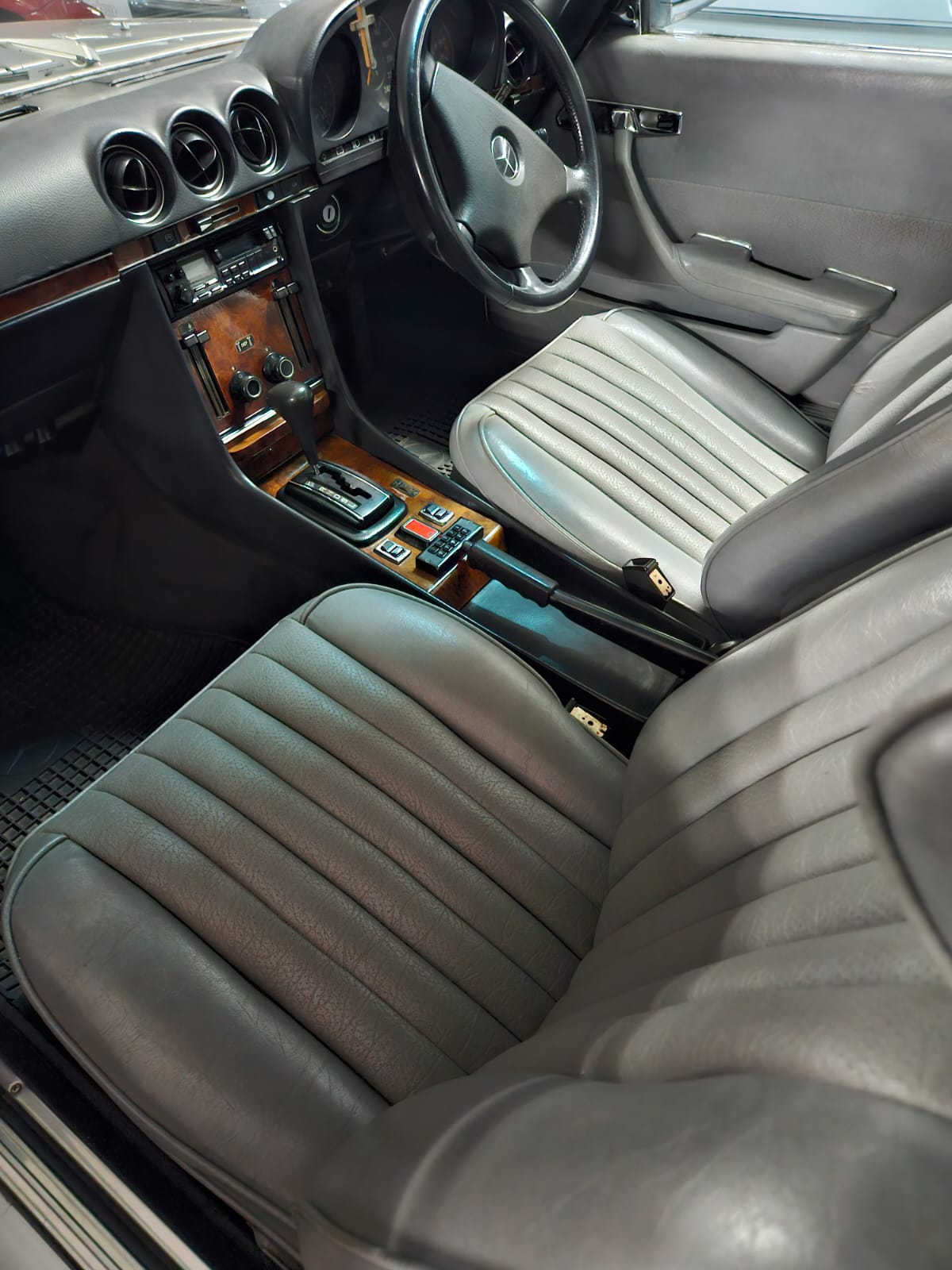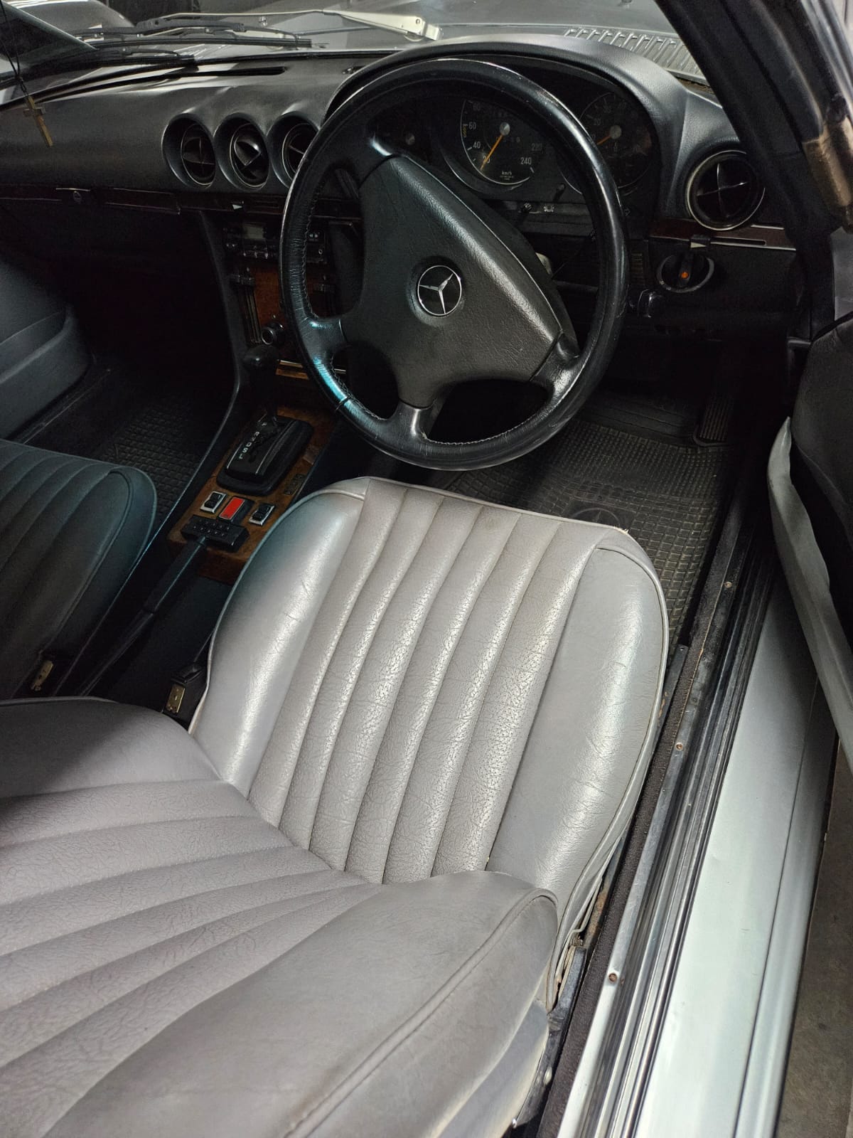 Finished in classic silver over grey, it still rides on its original “Mexican hat” alloy wheels, which really suit the shape. The 4.5L V8 pulls strongly and the automatic gearbox shifts smoothly, delivering that relaxed, grand-touring feel the R107 is known for. A nice bonus on this car is the factory sunroof, adding to the appeal and usability.