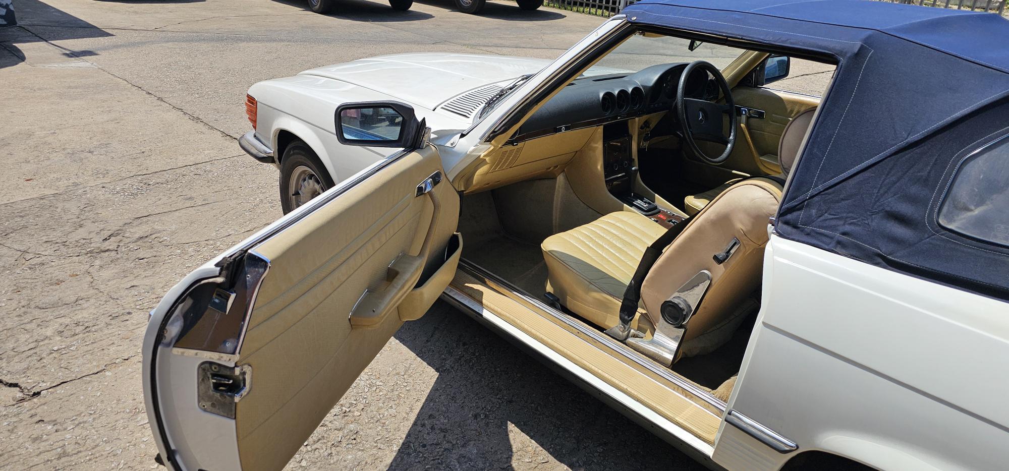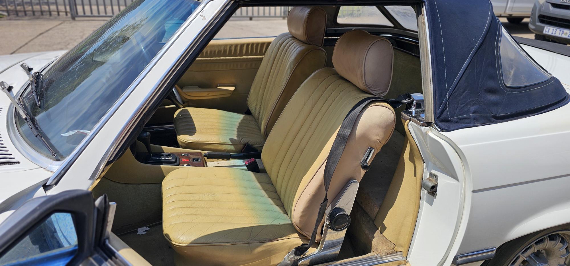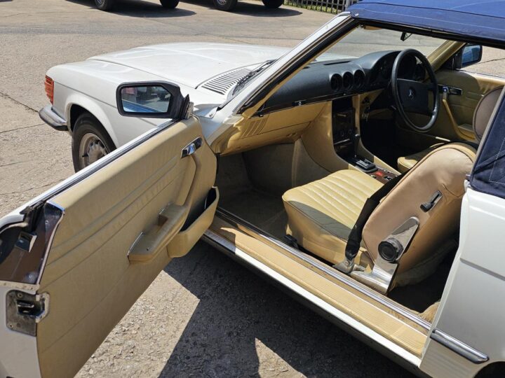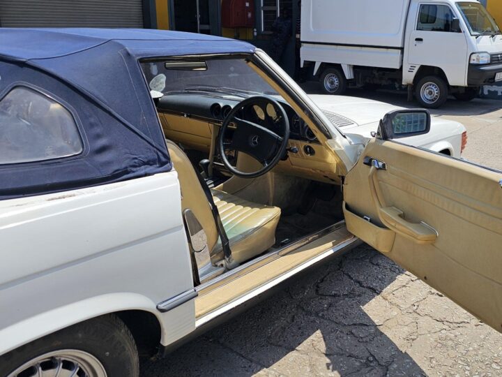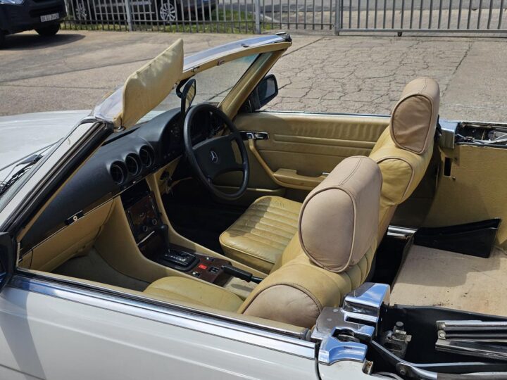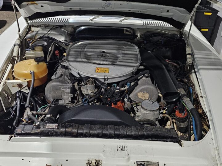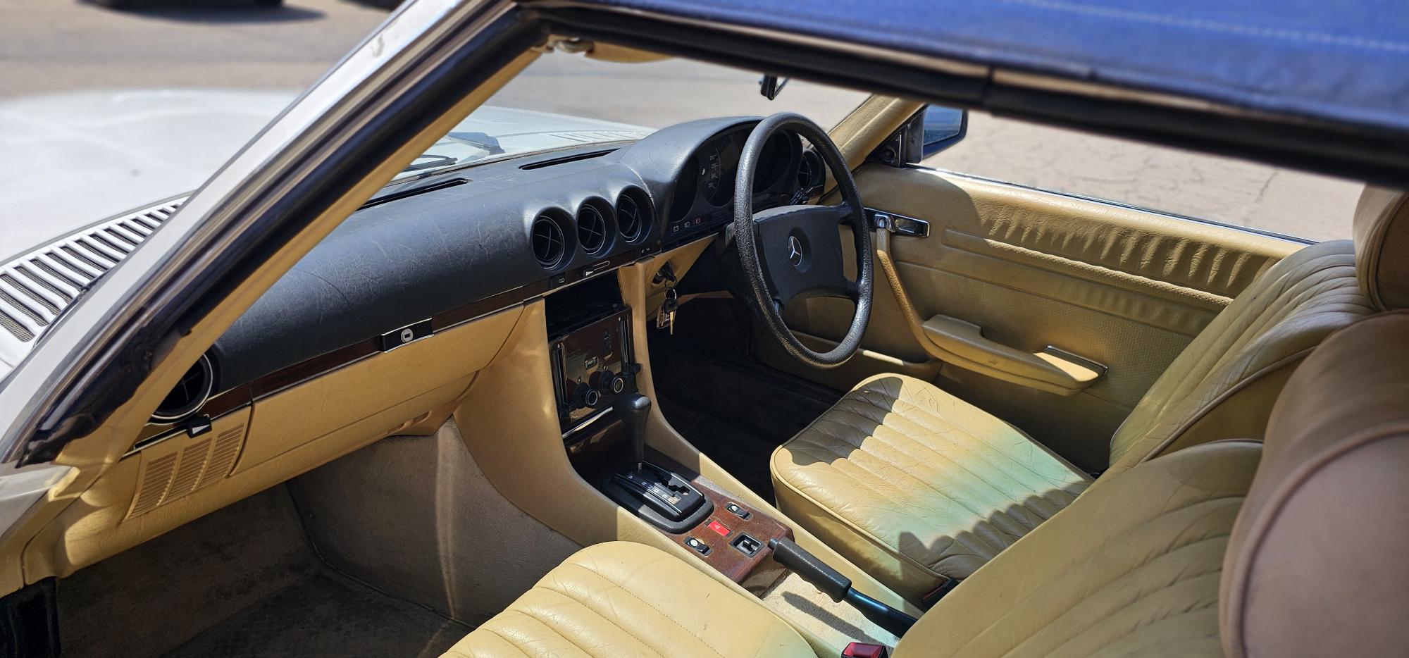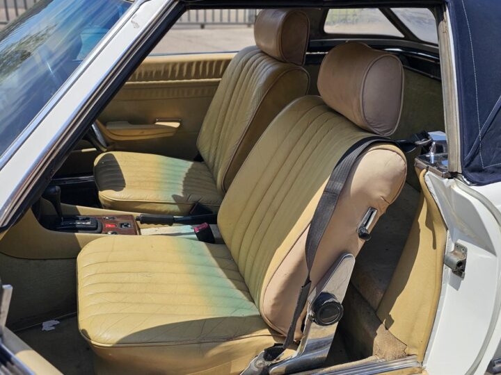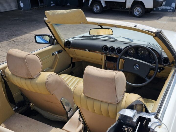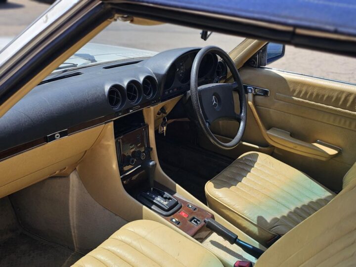 Riding on its period-correct “Mexican Hat” alloy wheels, the car has exactly the right stance and look for an early V8 SL. Visually it presents as a solid, honest project: a straight, largely complete example that gives the next owner a great foundation to either restore back to factory-correct spec or build into a tasteful cruiser without feeling guilty about cutting up a time-warp survivor.
