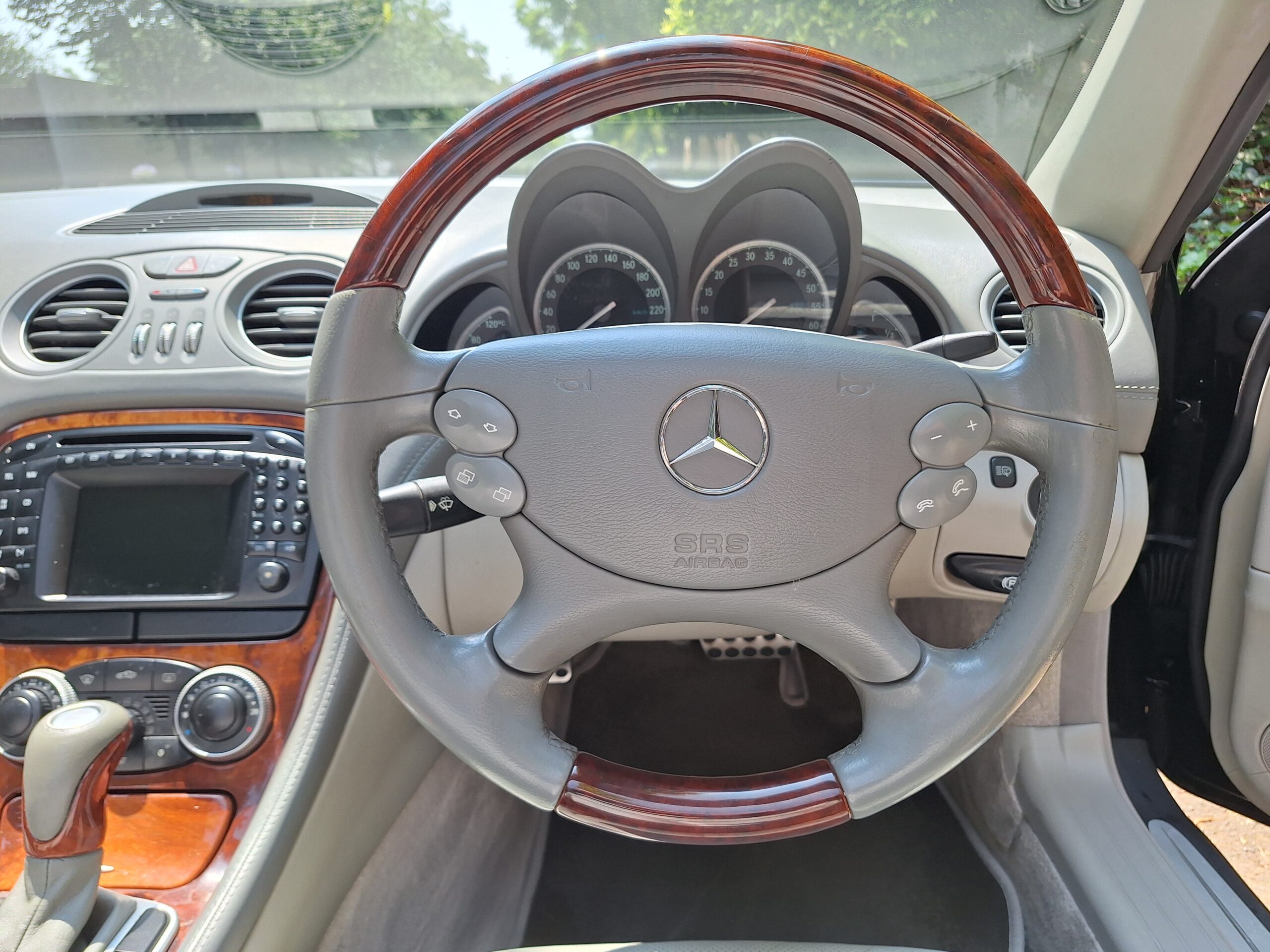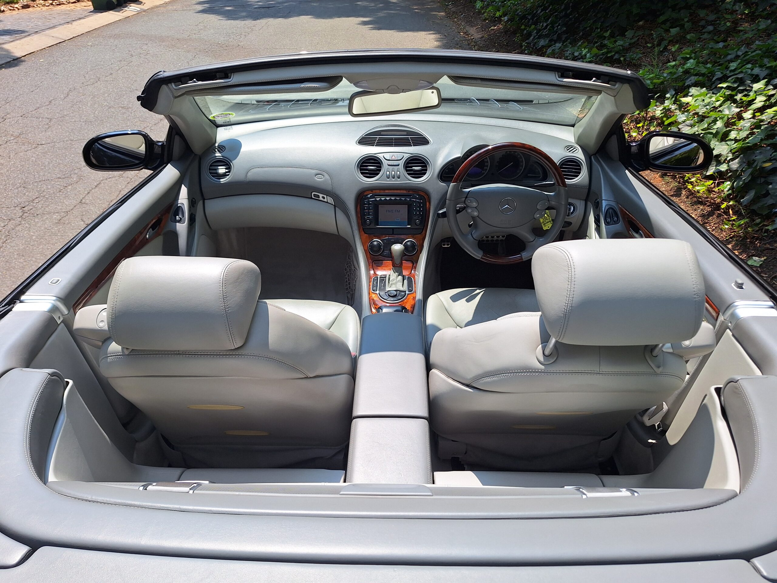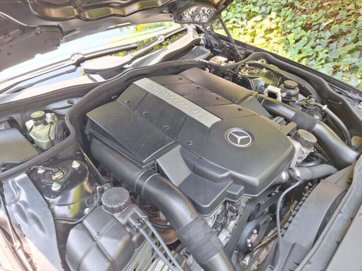 Grey leather seats with sophisticated wood veneer accents, offering unparalleled comfort and style. Powered by a potent M113 5.0L V8 engine, delivering smooth yet thrilling performance.