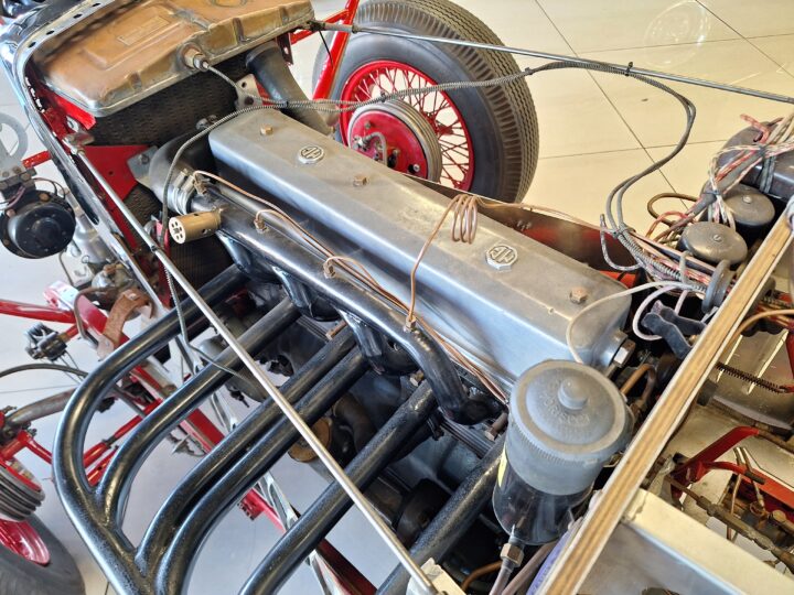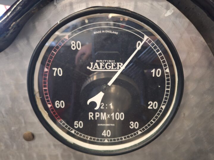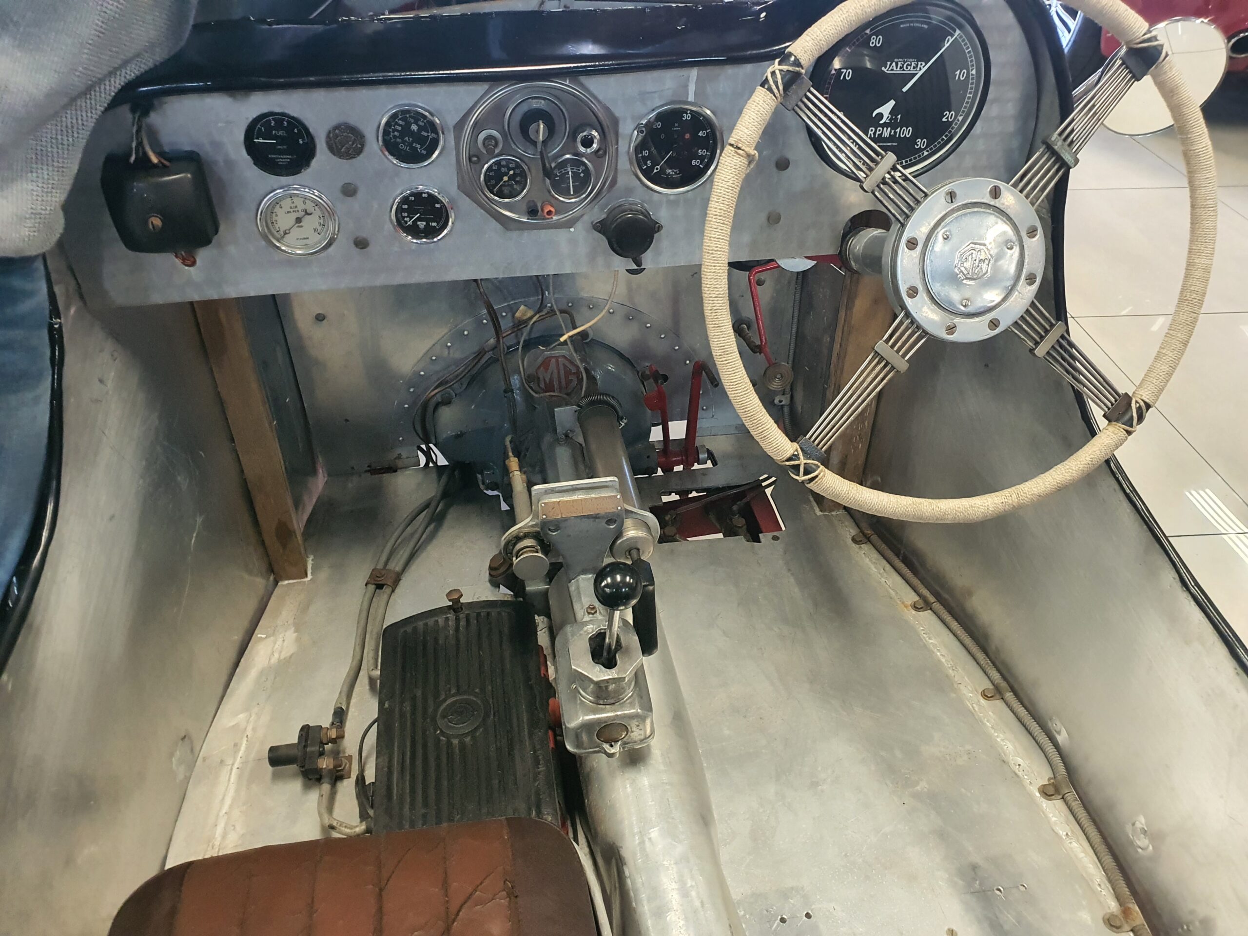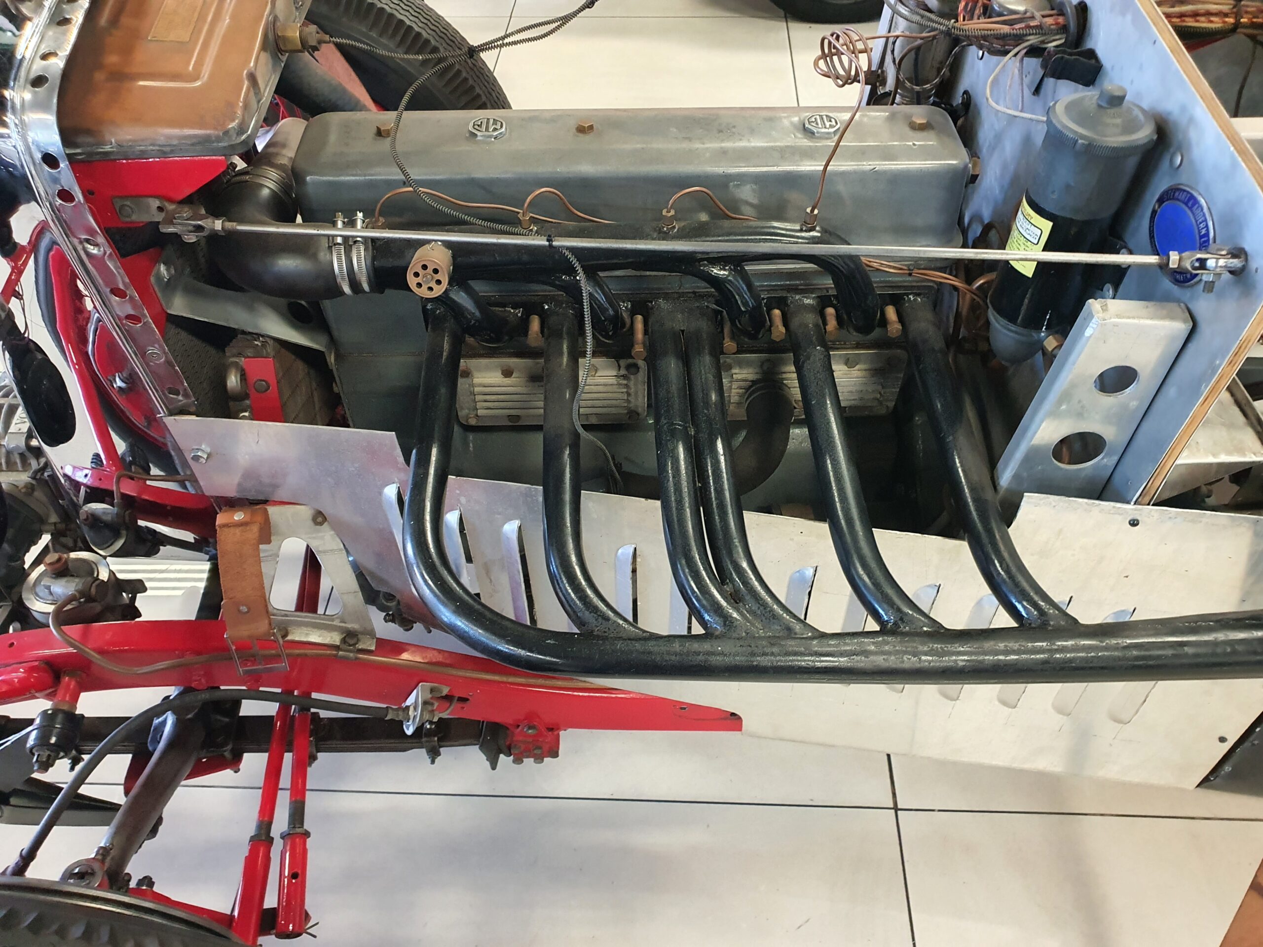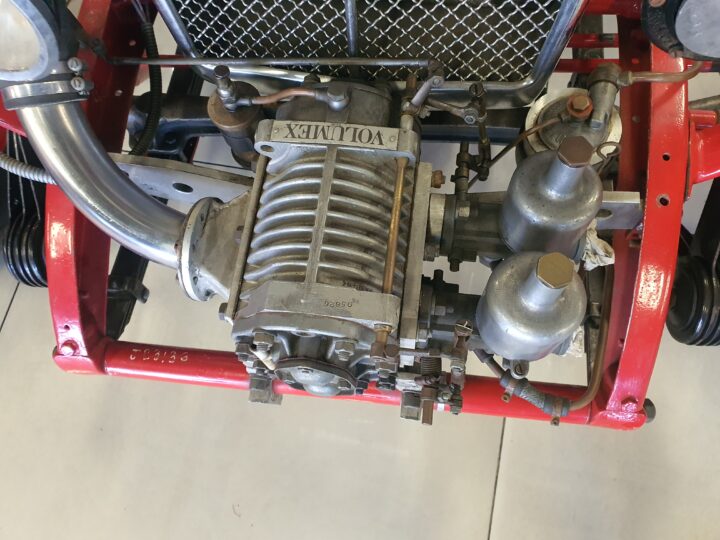 It has a Volumex Roots type supercharger with twin SU Carburettors. The gearbox is a period MG manual.