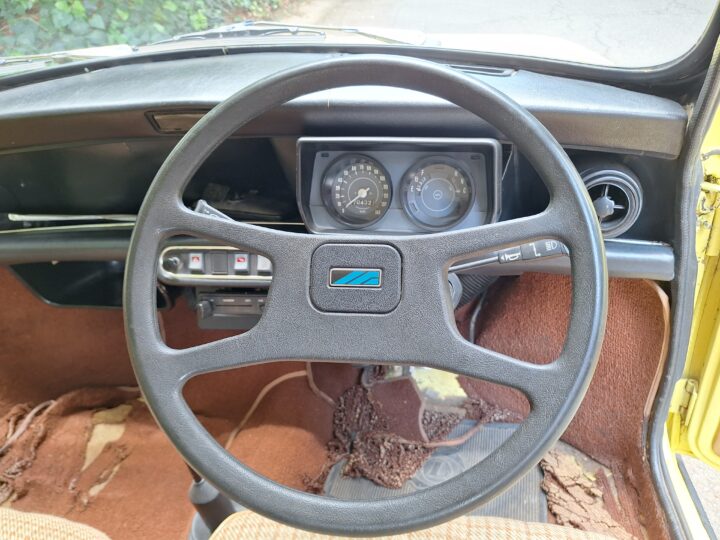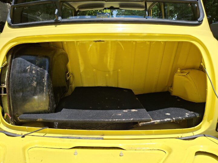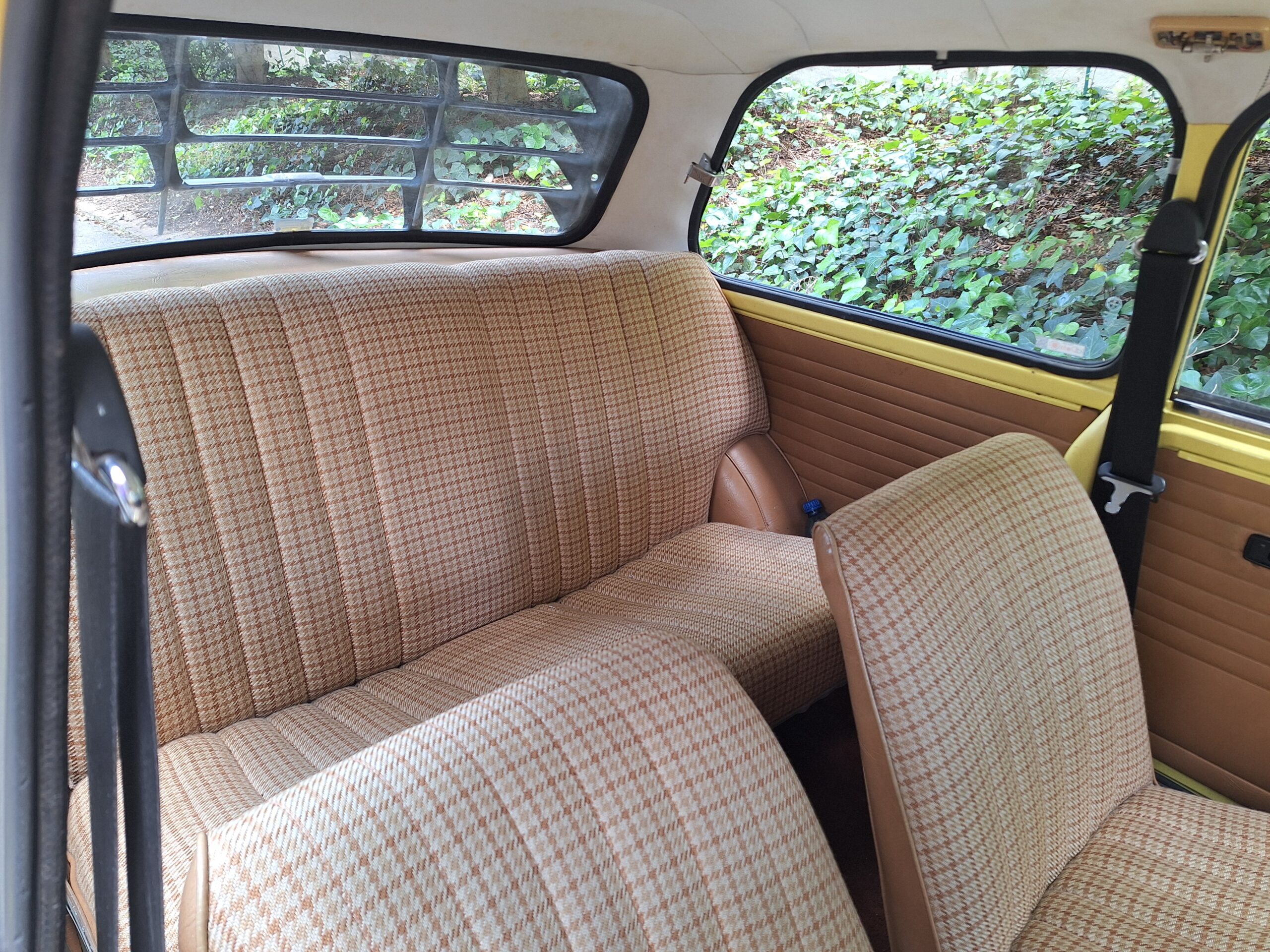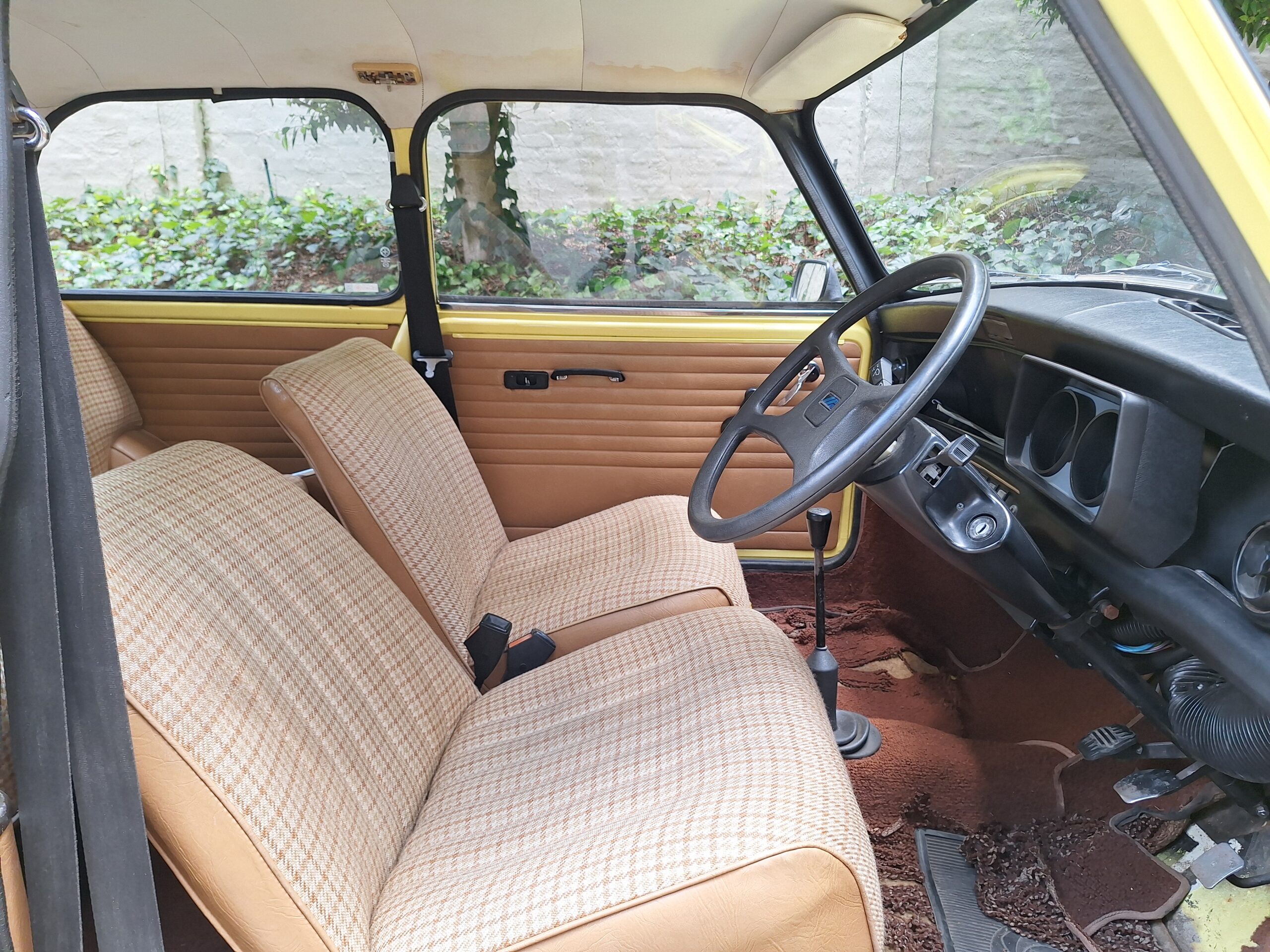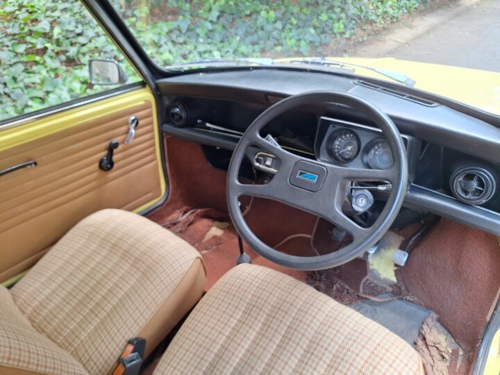This example has had paintwork in the past but remains largely factory-spec, still wearing its 10-inch steel wheels with hubcaps, with the spare wheel in the boot as it should be. The interior retains the correct tan cloth seating, keeping the period feel intact.
