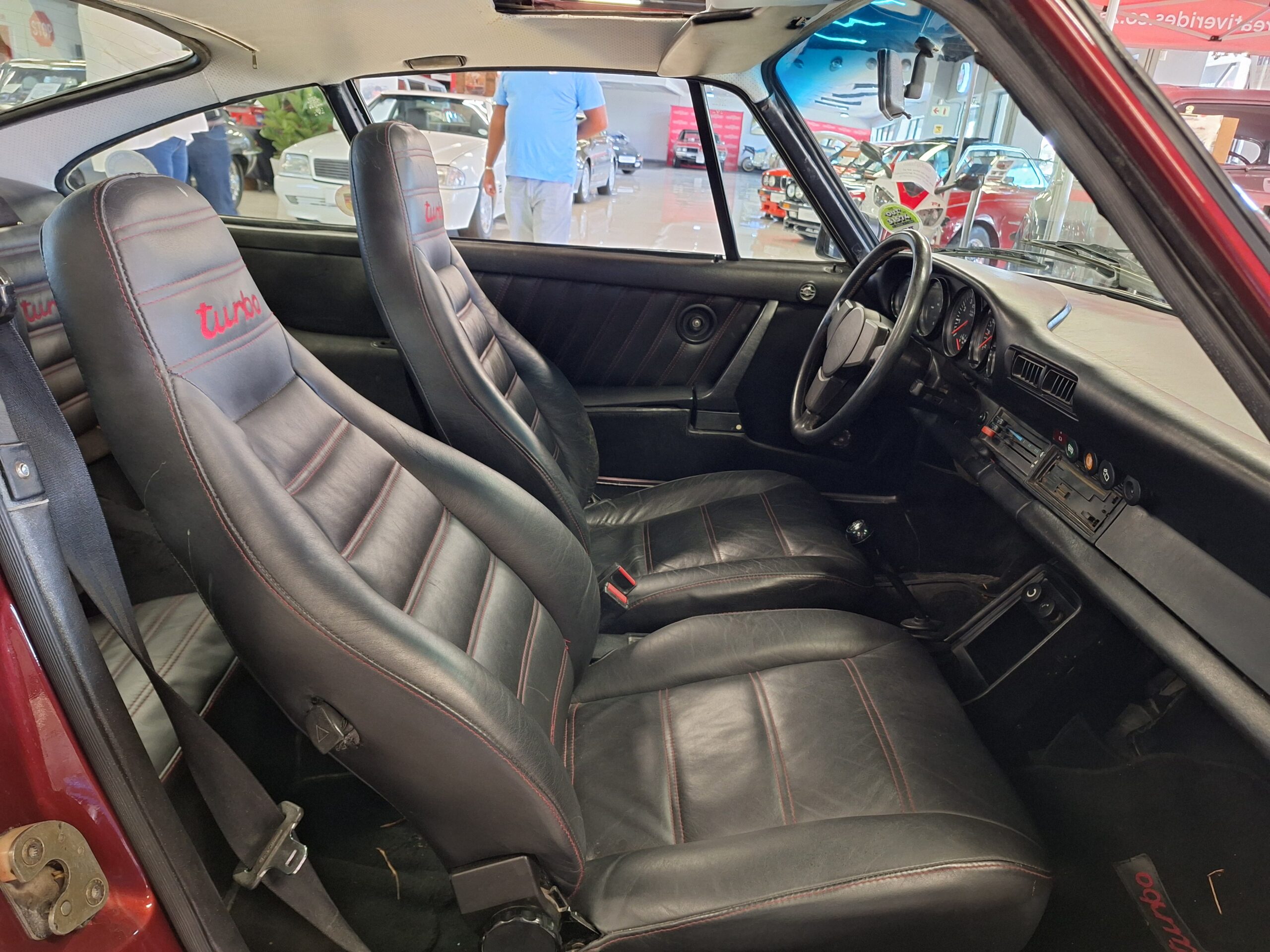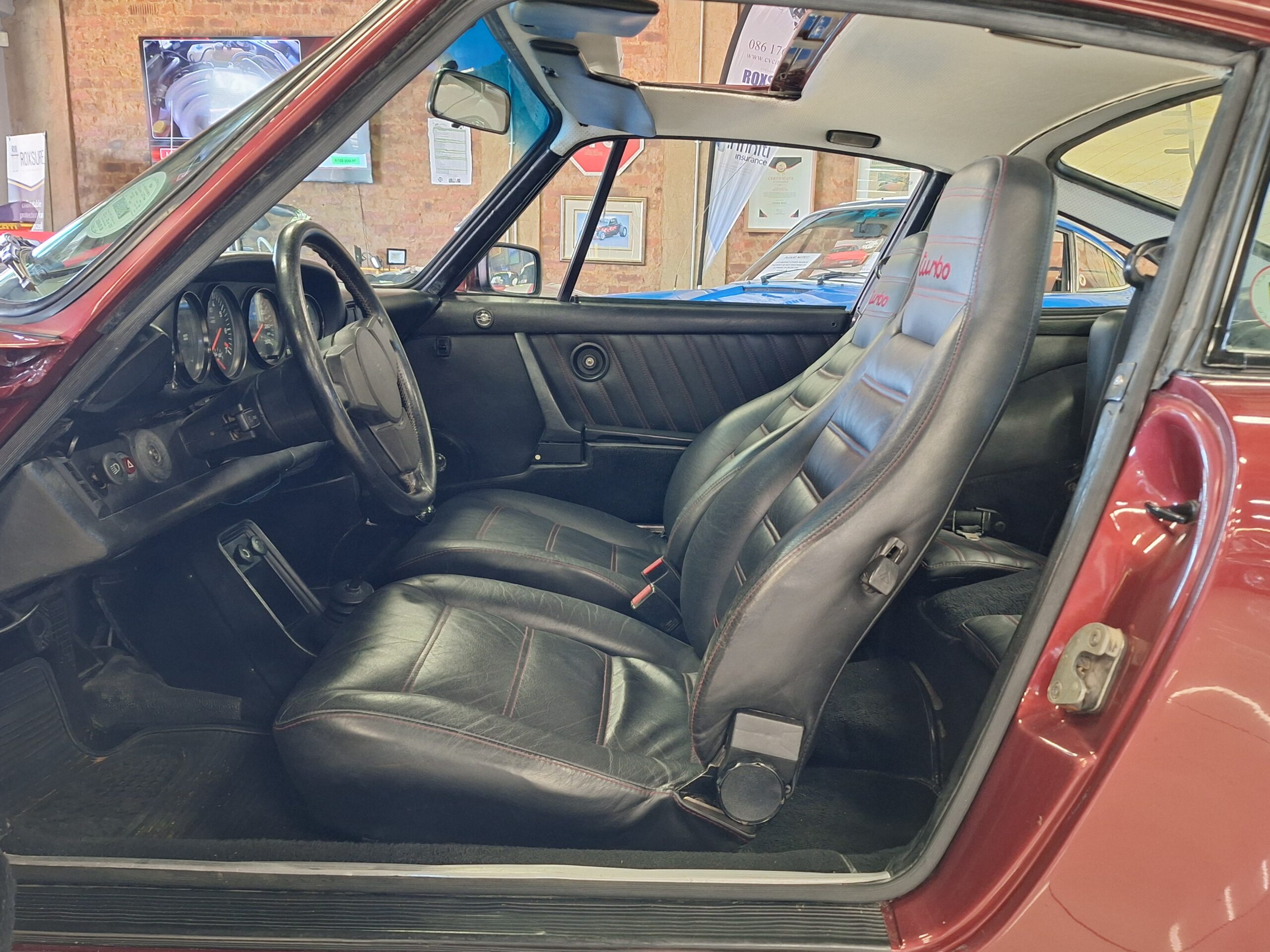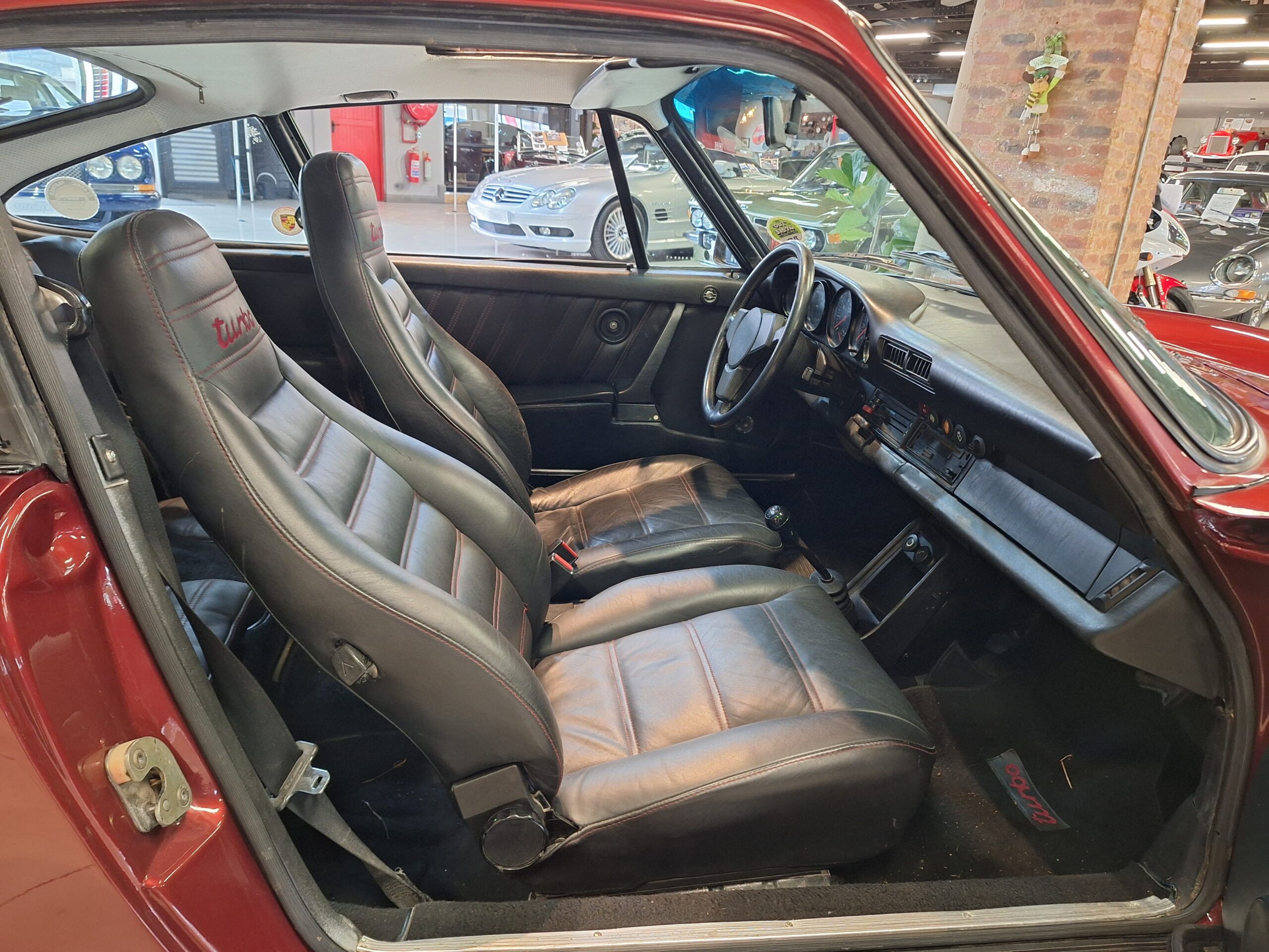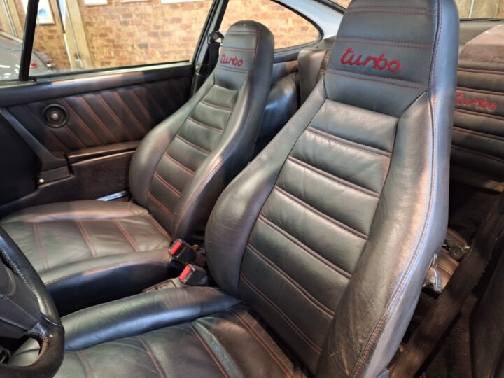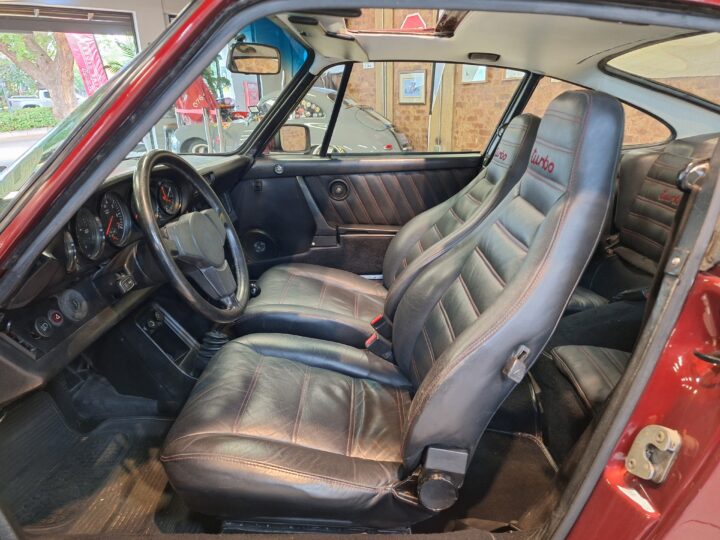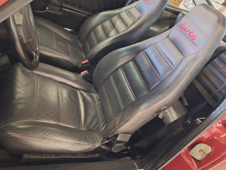 The vehicle has had some previous paintwork in the past. The paint code on the car shows the colour as Wine Red Metallic (wein-rot-metallic) which was for the 1980-1981 year model. It has a sunroof fitted. The seats have had turbo emblems embossed in the head rest area. Original wheels are still fitted.
