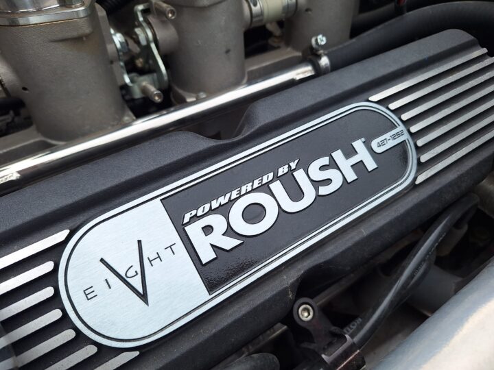 The wheels are a modern version of the Halibrand knock offs and are 15 inch. Brakes are Wilwood. The engine is the Roush 427 ci (7 Liter) V8 with 8 Stack throttle body fuel injection. Transmission is the Tremec 5 speed. It has a Limited slip diff.