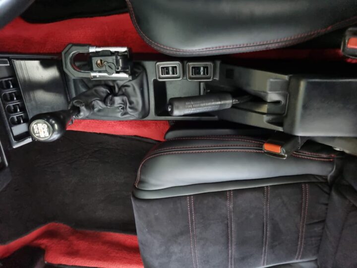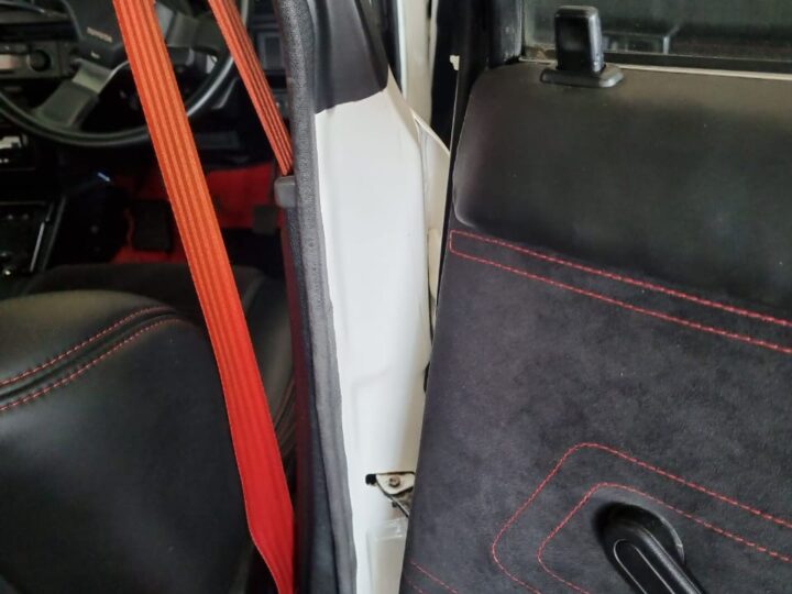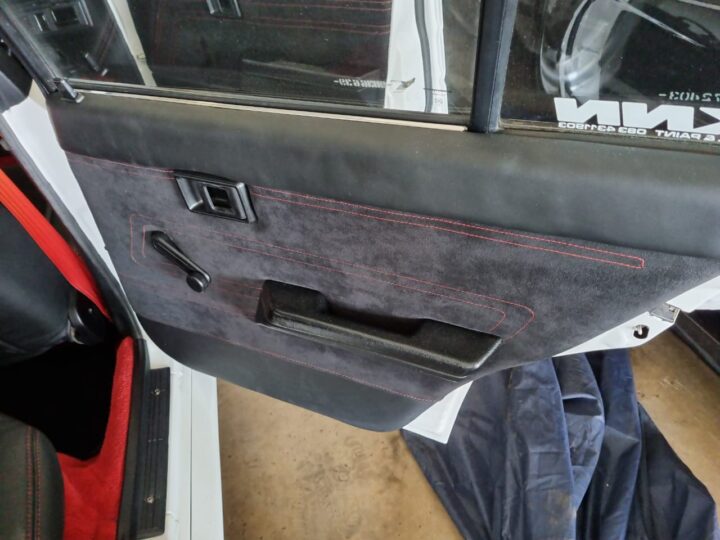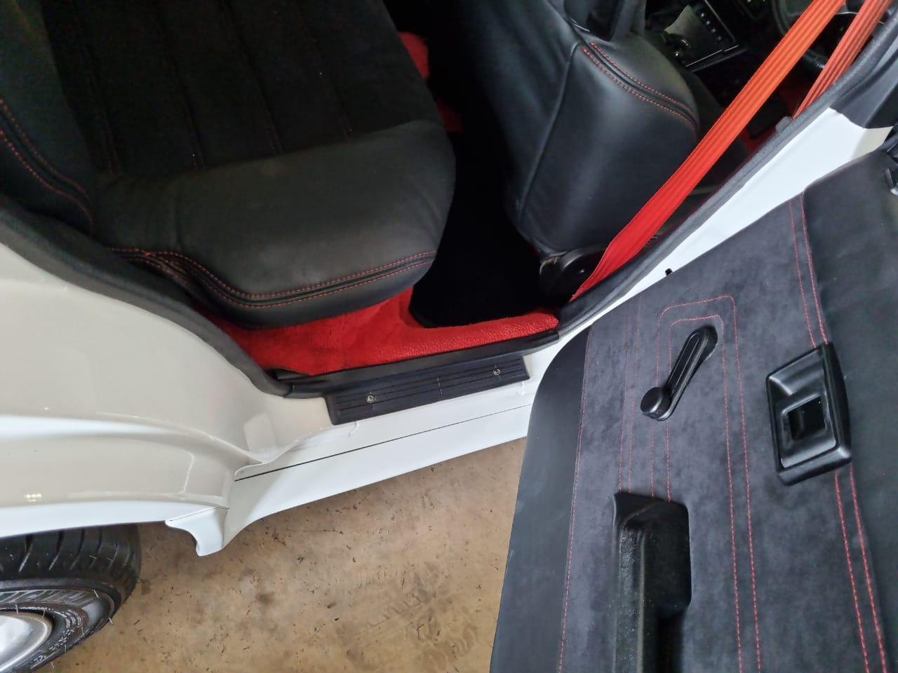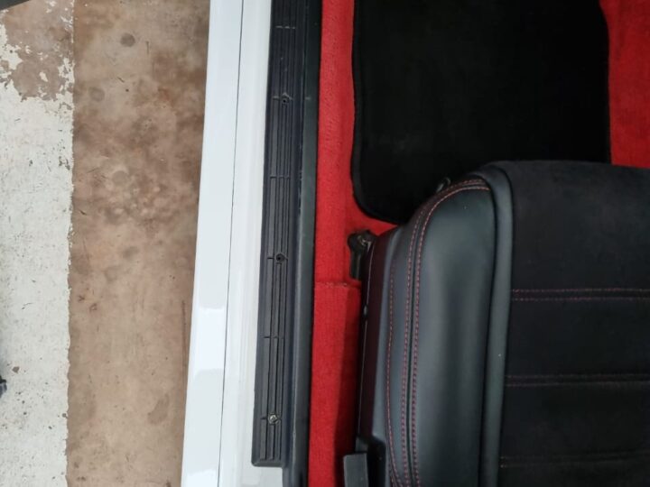 The chassis and stance are sorted with BC coilovers, and if the next owner wants to go air, Airlift bags can be swapped onto the BC struts. Outside, the car stays true to its roots in white with Twin Cam 16 graphics and period-style wheels that suit the shape perfectly. Inside, it’s been treated to a full Nappa leather and Alcantara retrim with red accents, giving a modern, premium feel without losing the RSi character.