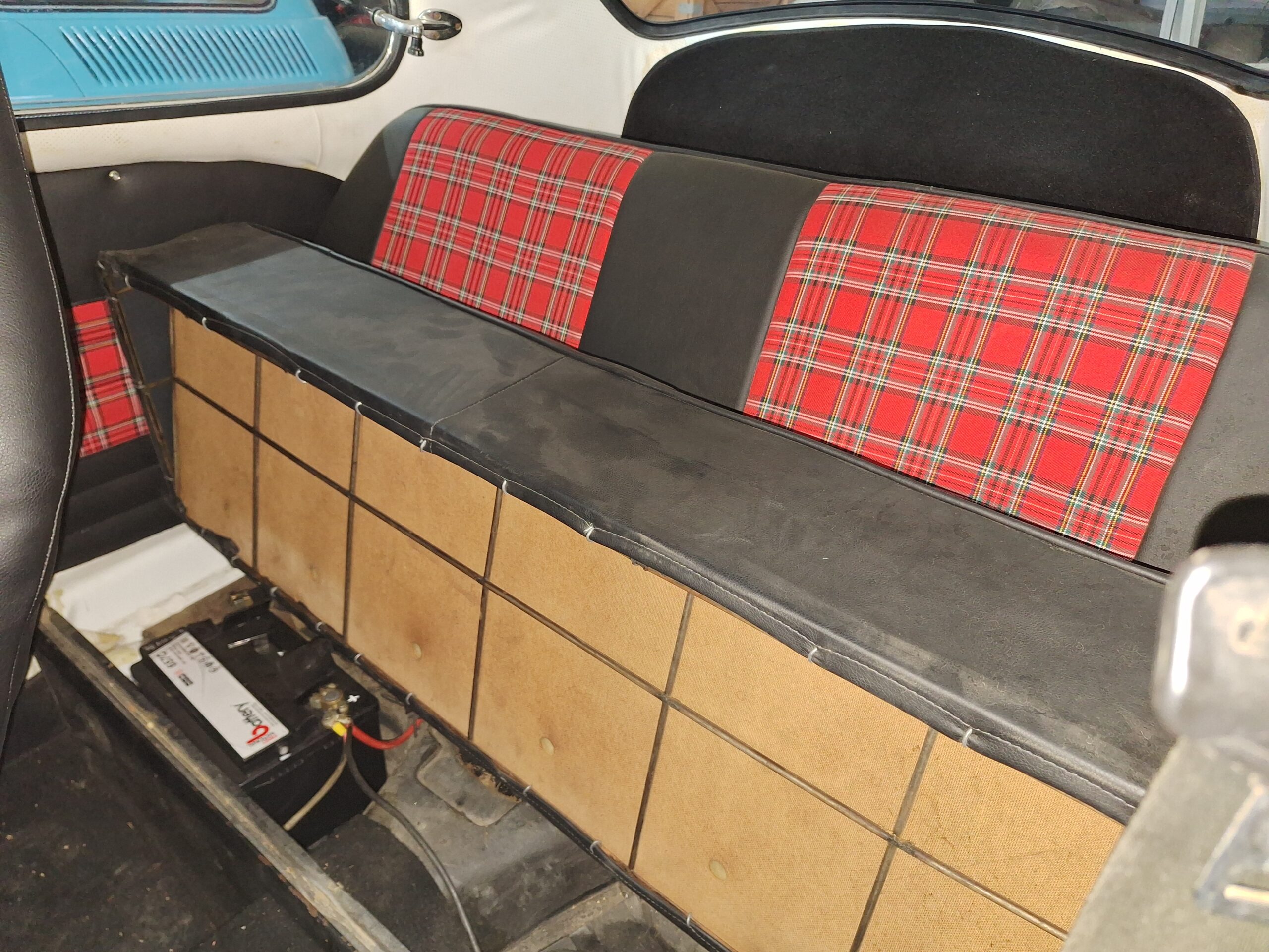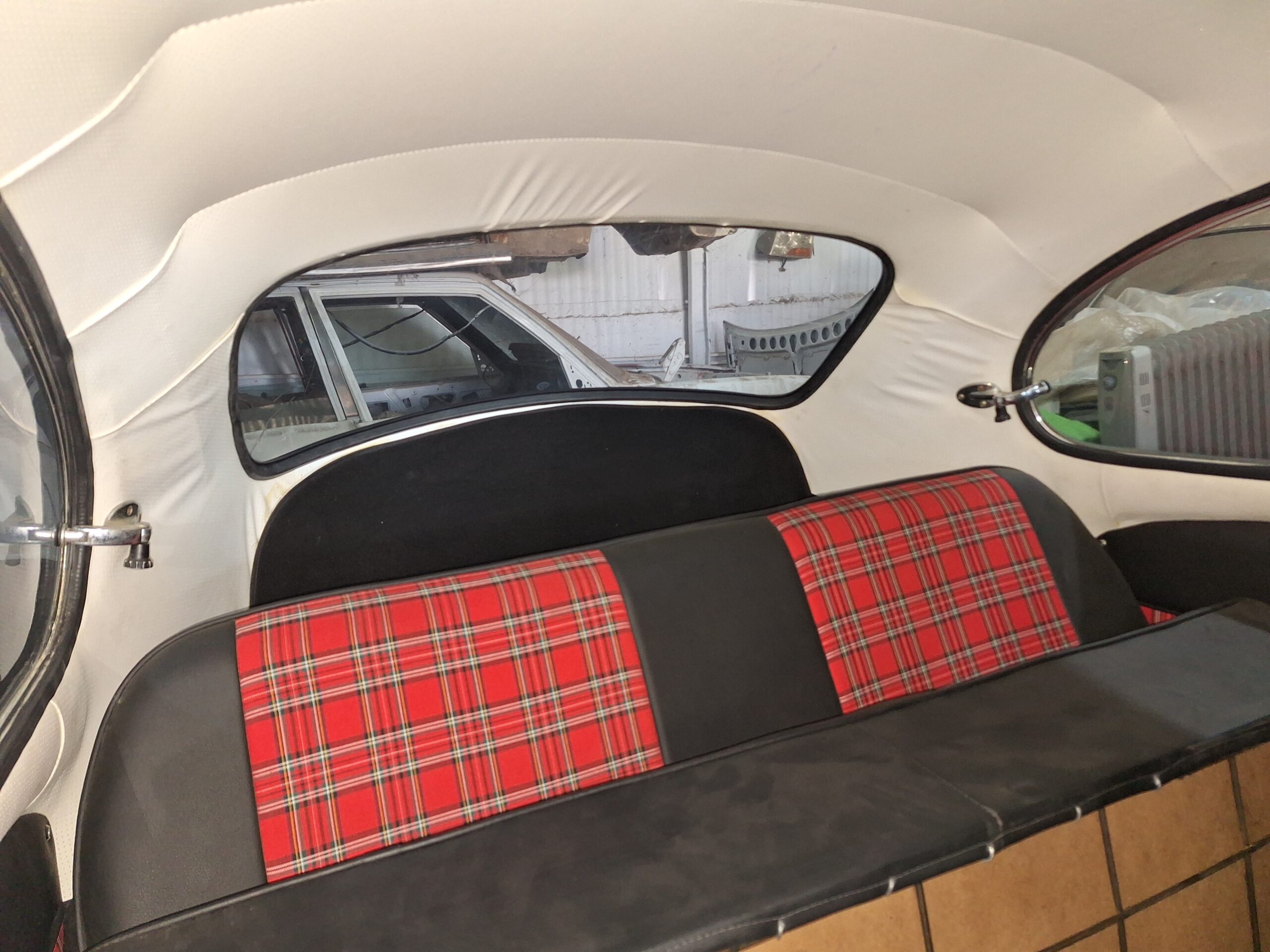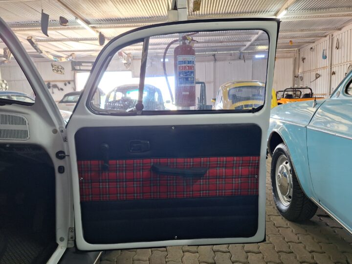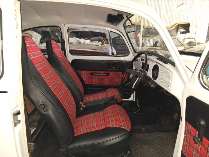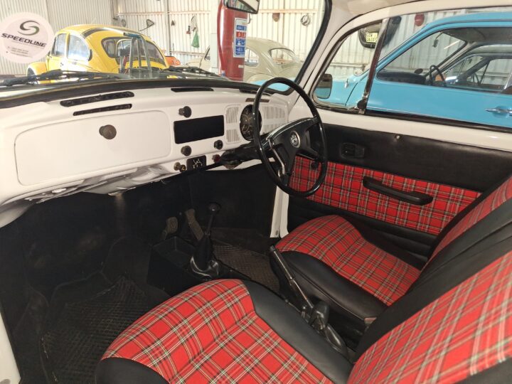 Inside, the red tartan cloth with black leatherette is a standout feature, giving the car a cool period custom feel that really suits the white exterior. The cabin presents neatly and still feels very much like an honest, old-school Beetle.
