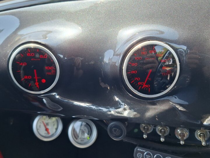 Inside, the cockpit is fitted with Corbeau racing seats, a short shifter, and a full suite of Defi performance gauges. Underneath, custom Budnik alloys (18” front, 19” rear) complete the aggressive look.