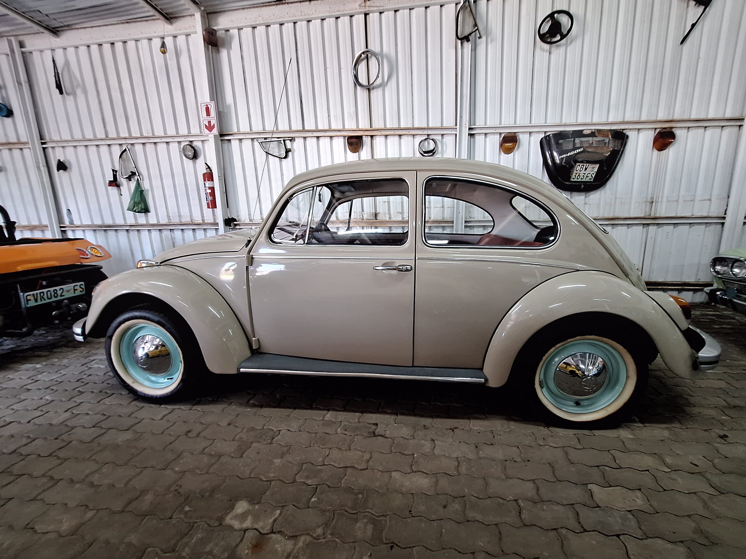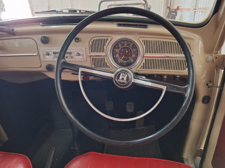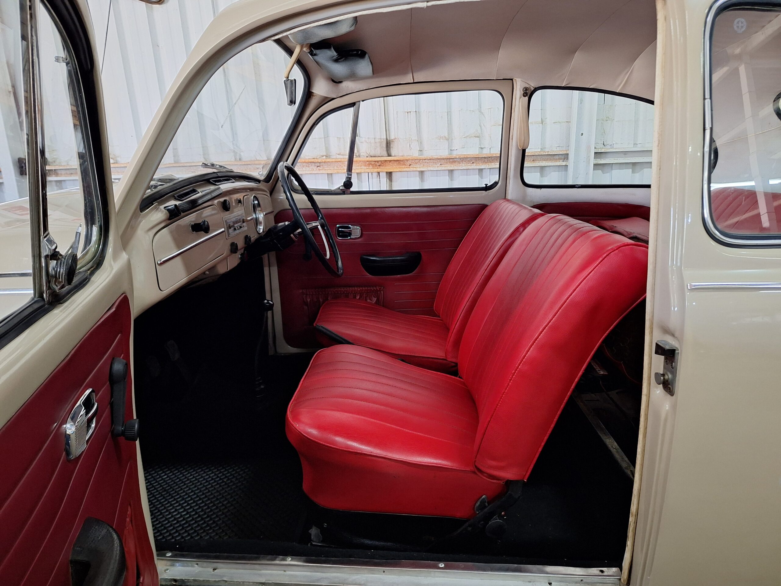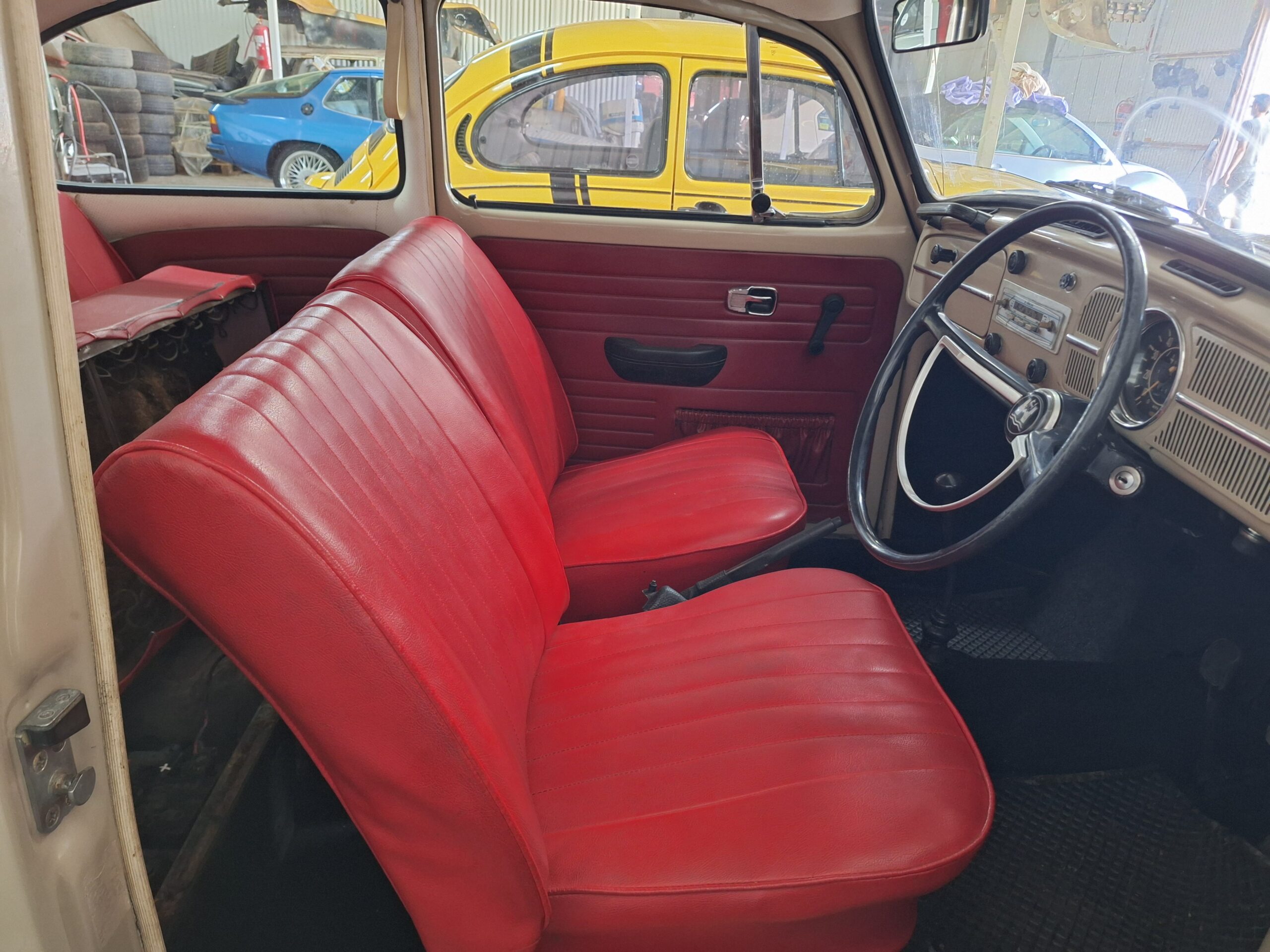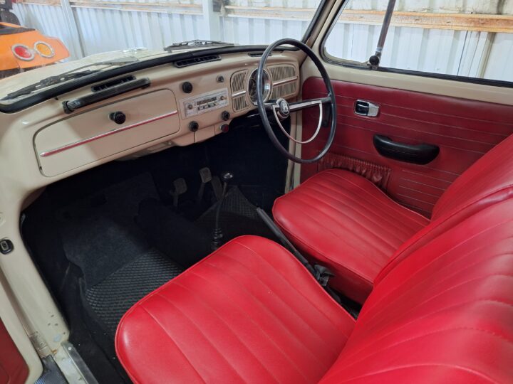 This 1969 Beetle wears a neat coat of Savanna Beige, a classic shade that really suits the rounded lines of the car. The look is lifted with baby-blue wheel centres, chrome hubcaps and wide whitewall tyres, giving it a proper retro, “beach cruiser” stance. The bright red leatherette interior adds a bold contrast, with the seats, door cards and dash trim presenting with a charming period feel the moment you open the door.