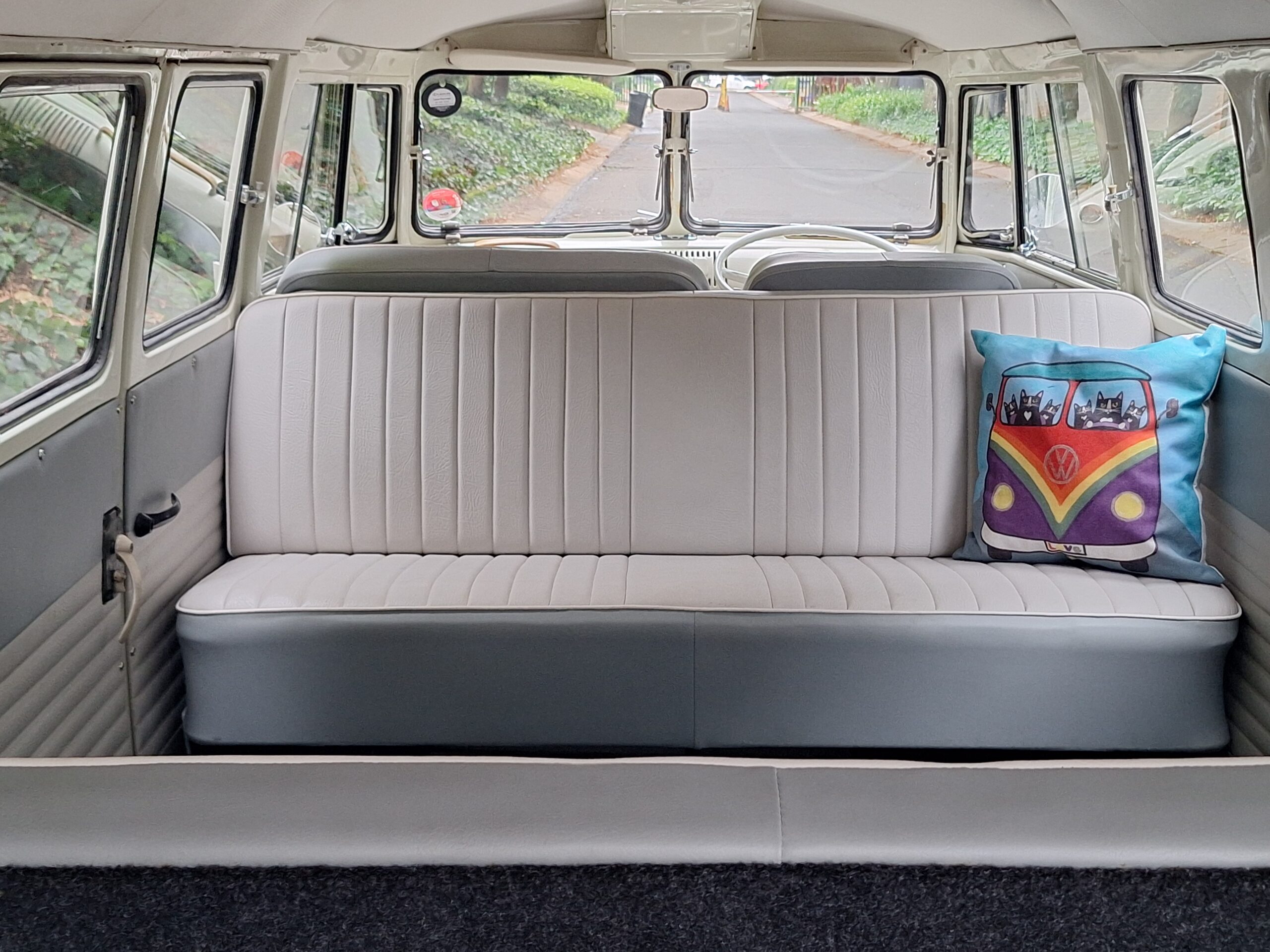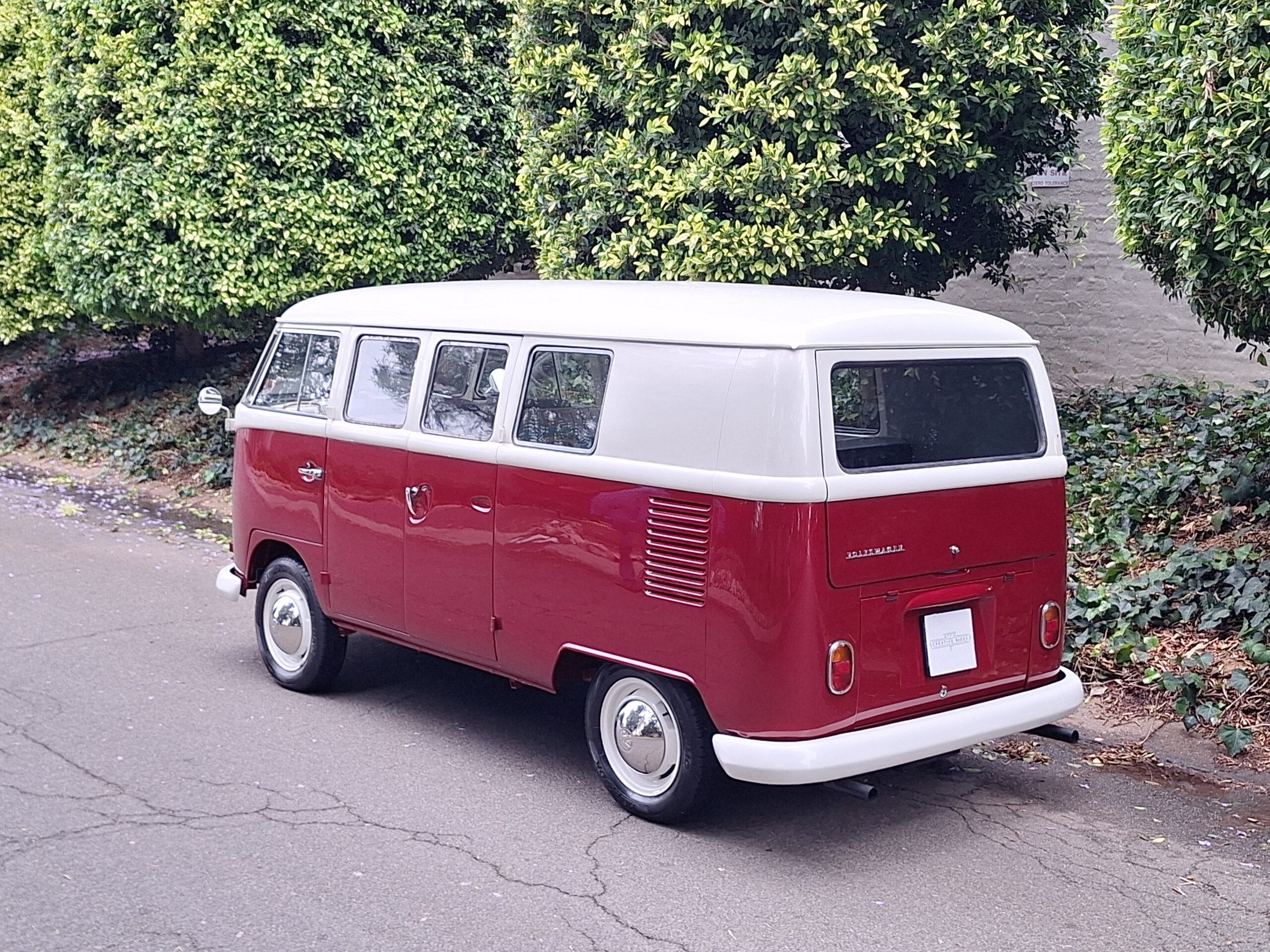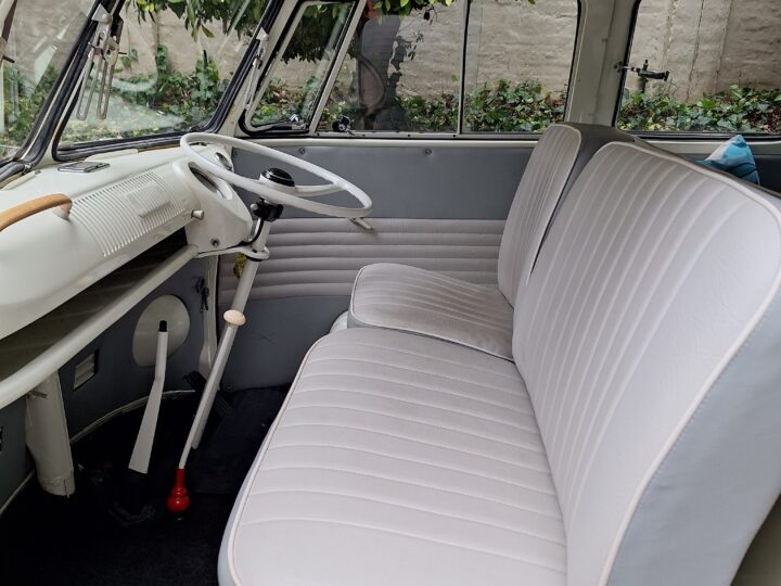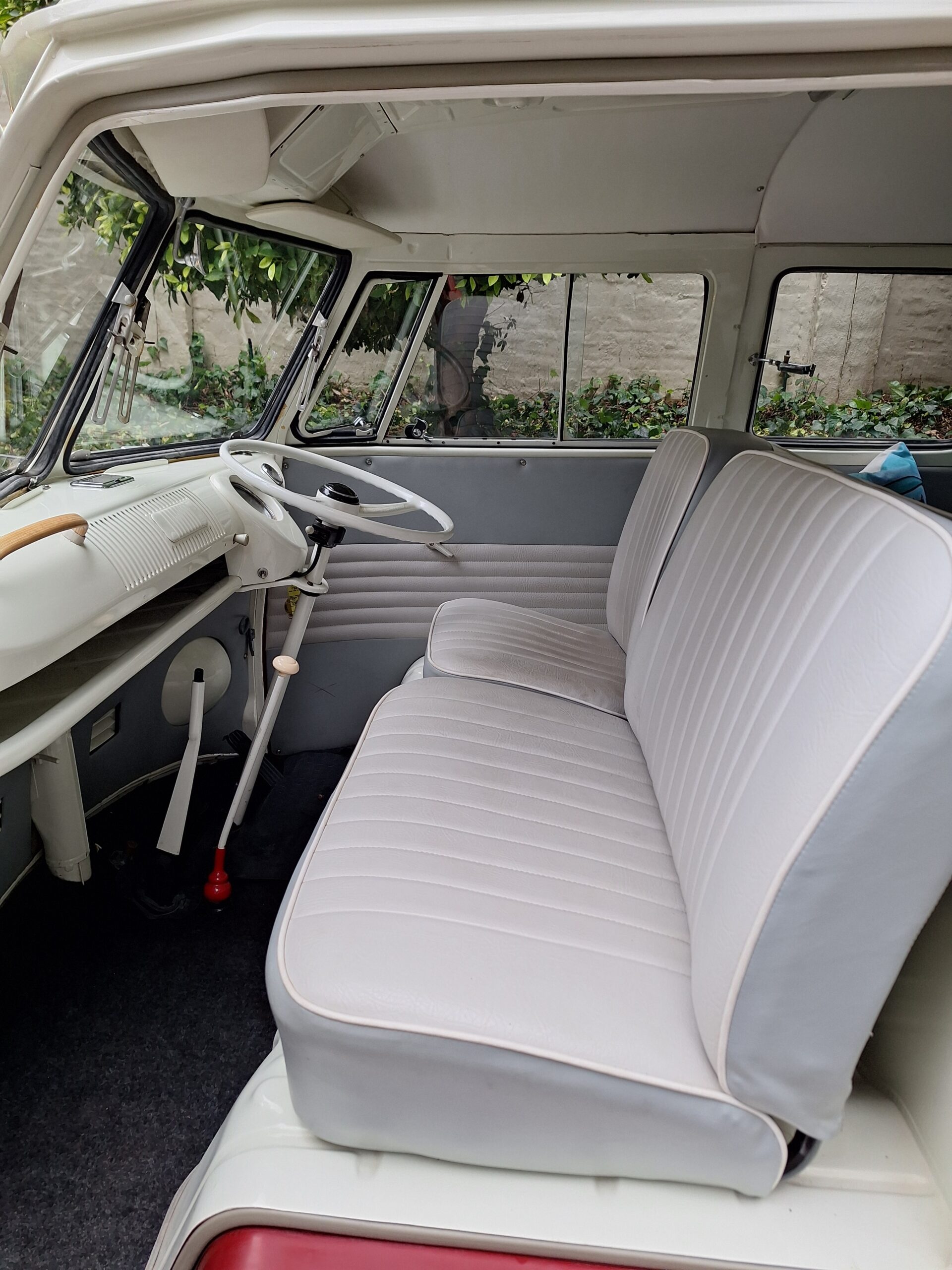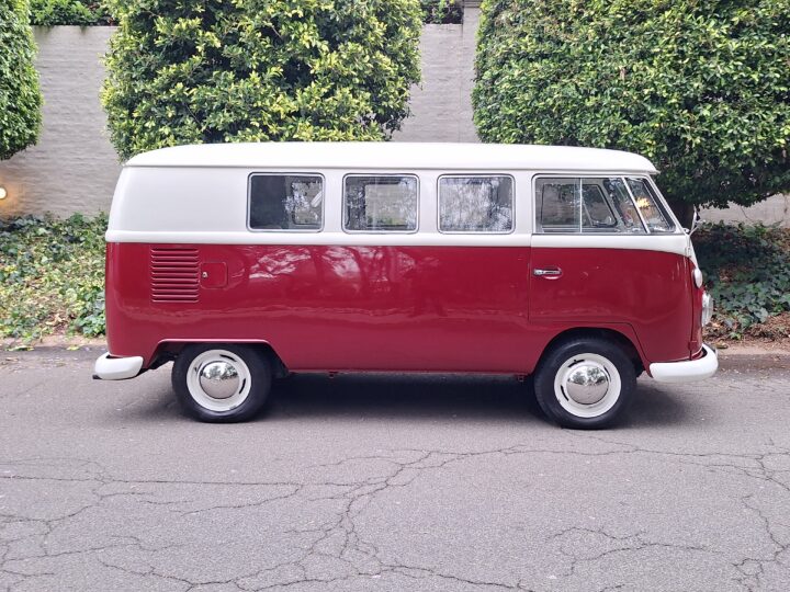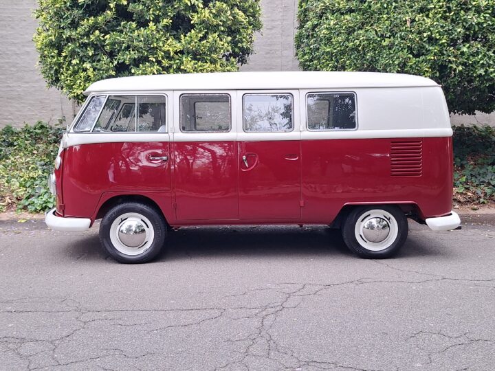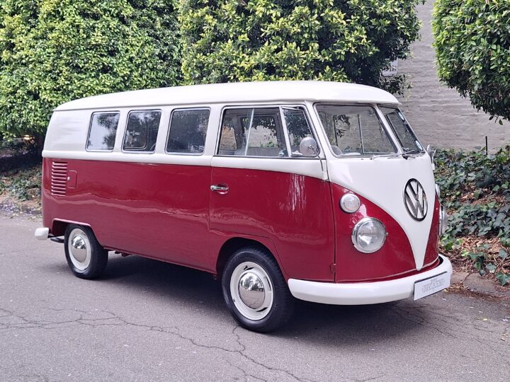 Finished in a striking two-tone red and cream scheme with chrome trim and hubcaps, it captures the Kombi’s timeless charm. Inside, the re-trimmed grey and cream vinyl cabin features twin bench seats in a lounge-style layout and the signature minimalist dash.