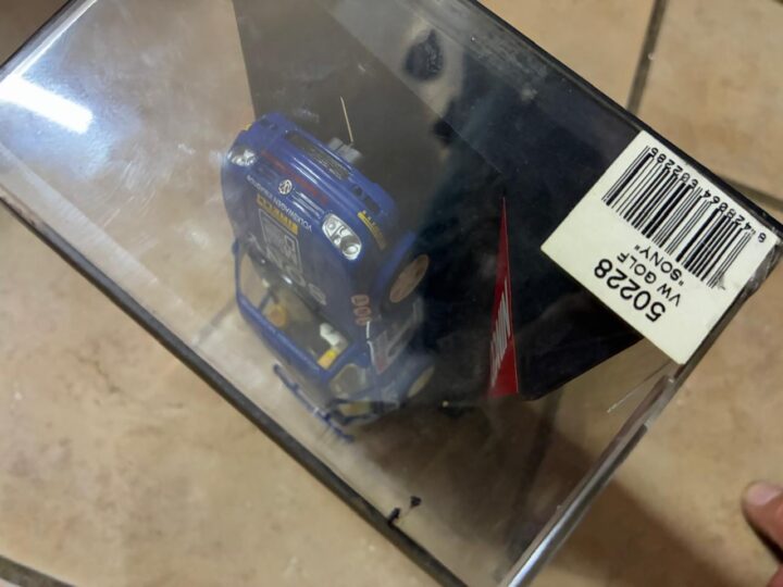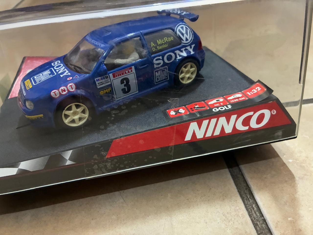 Blue VW Golf “Sony” No.3 Ninco slot car, ref 50228, with distinctive sponsor livery and classic hatchback stance. A desirable piece for VW, Sony-livery and Ninco collectors, ideal for display or club racing
