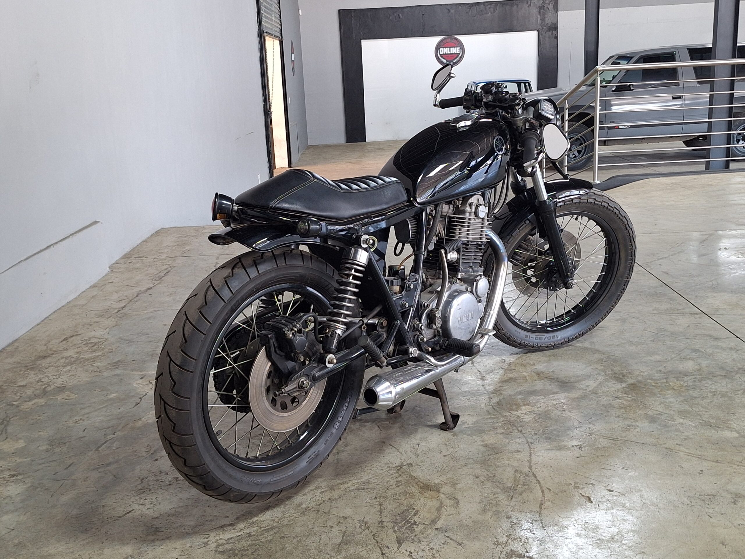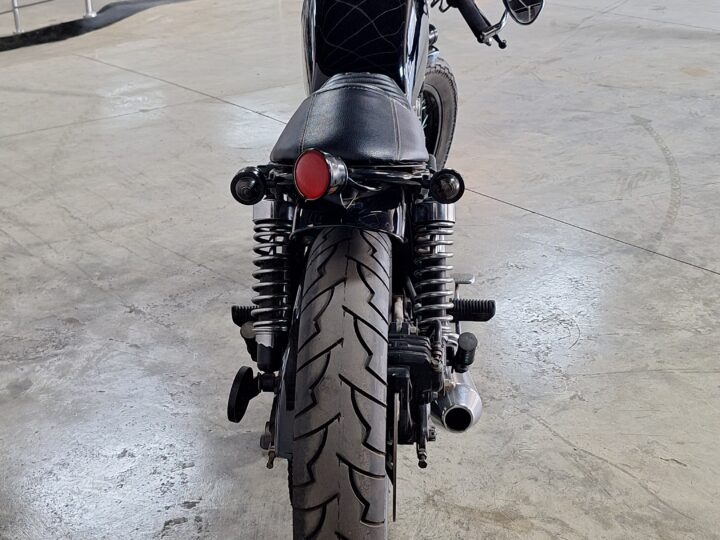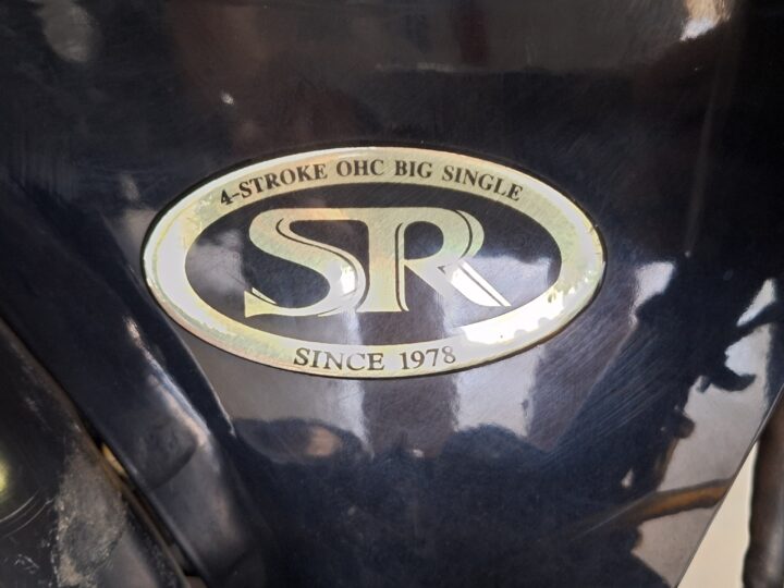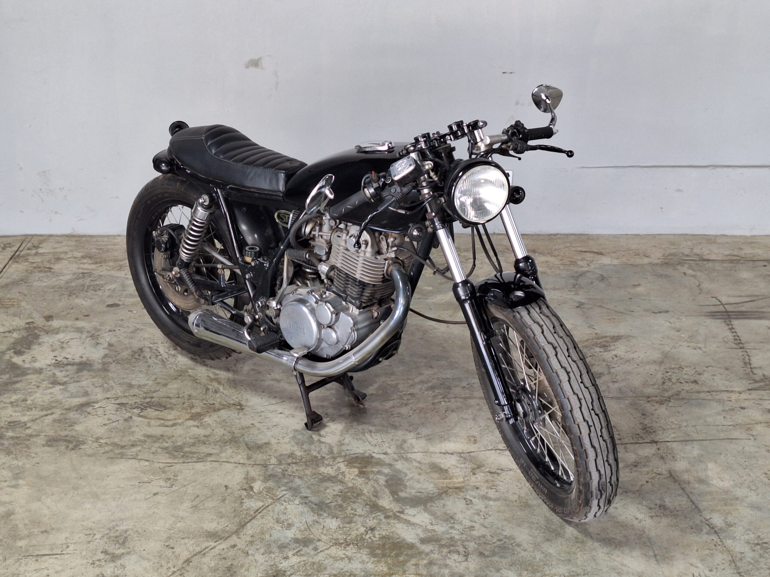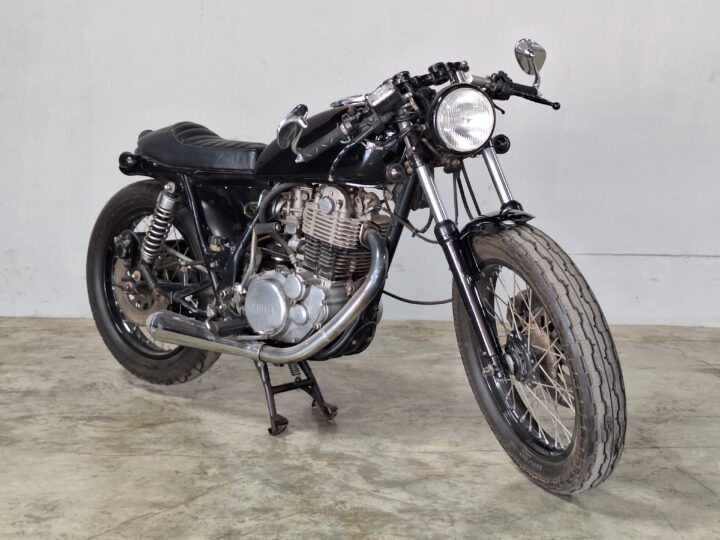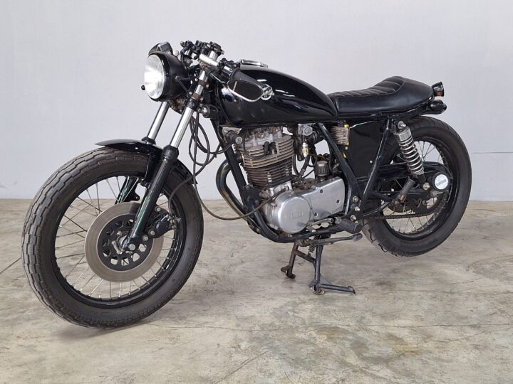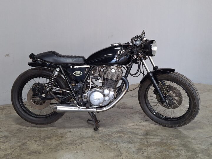 The bike features clip-on drop bars, a shortened tail section and a custom café racer seat, giving it a low, focused stance. Finished in black with matching black trim, it has a clean, no-nonsense look that suits the SR’s minimalist character.