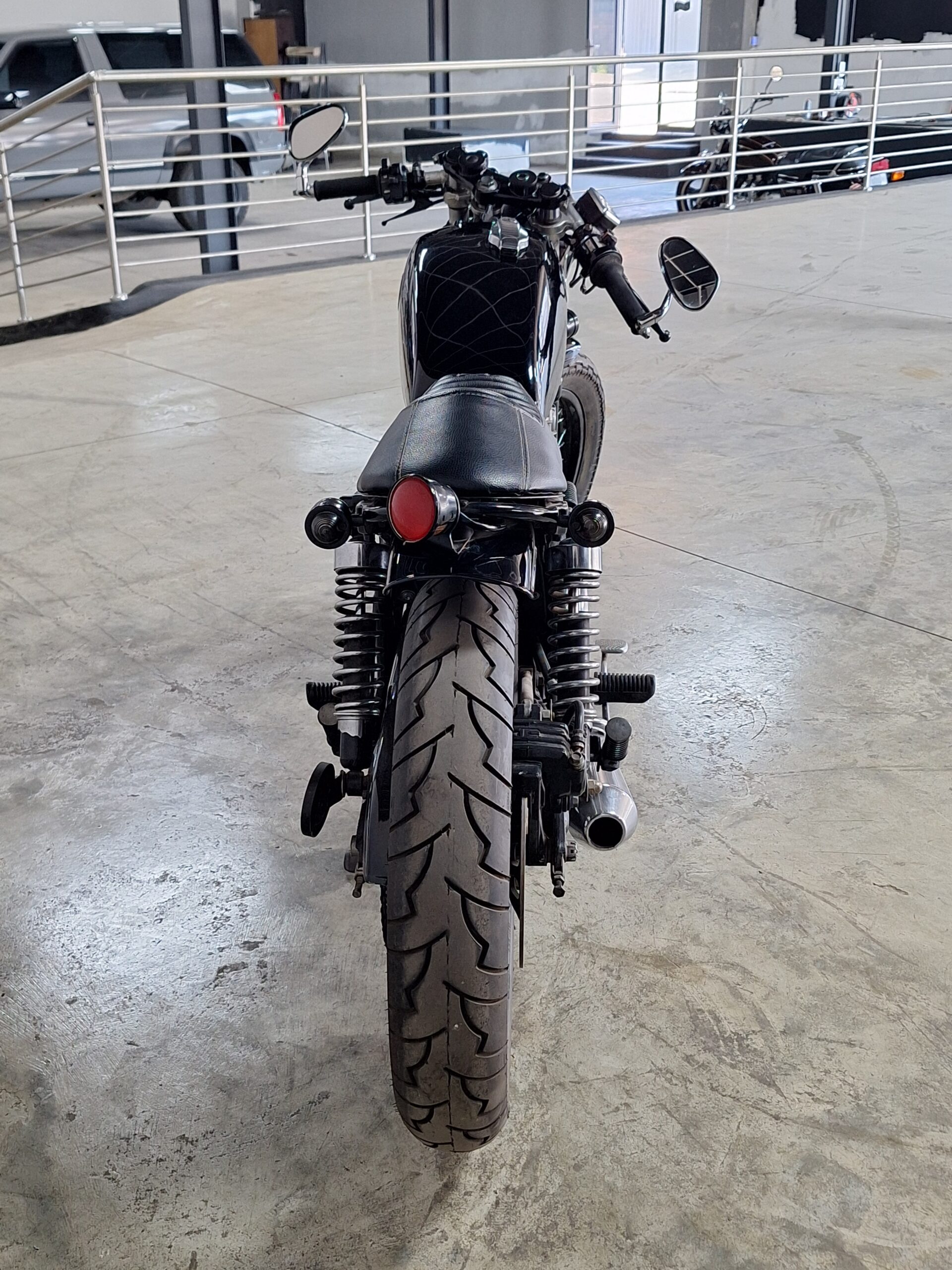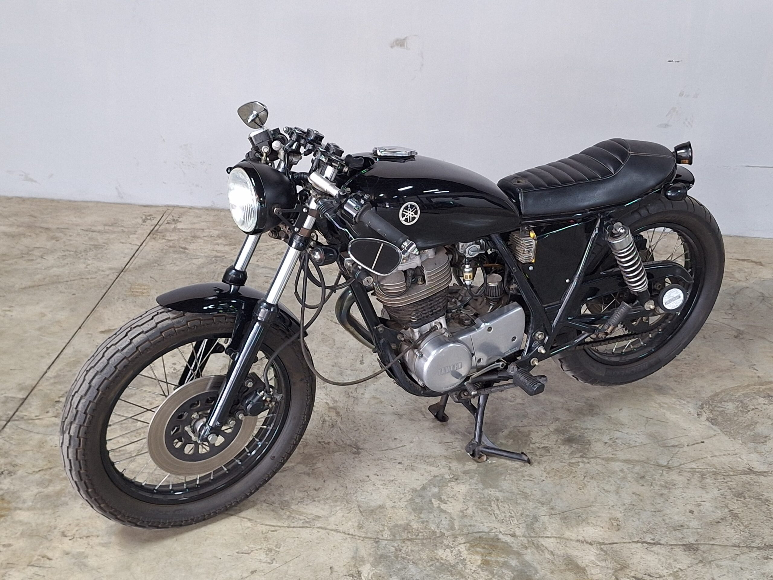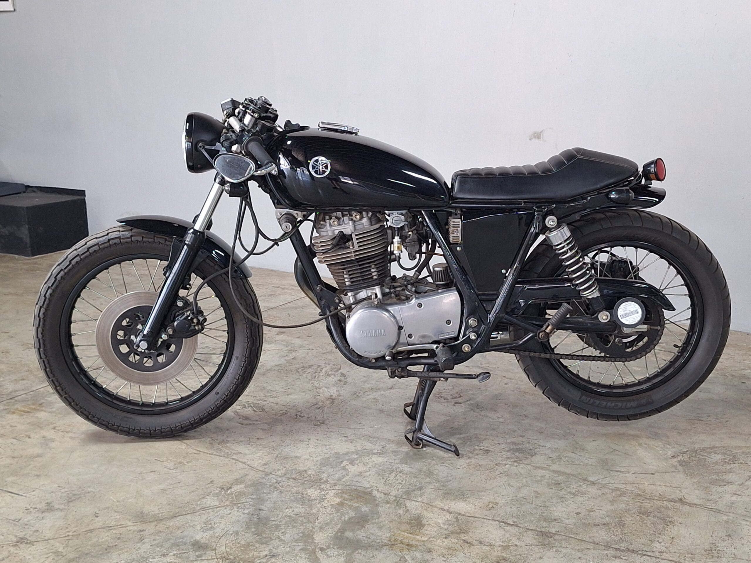 The bike features clip-on drop bars, a shortened tail section and a custom café racer seat, giving it a low, focused stance. Finished in black with matching black trim, it has a clean, no-nonsense look that suits the SR’s minimalist character.